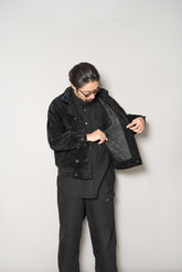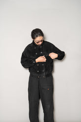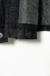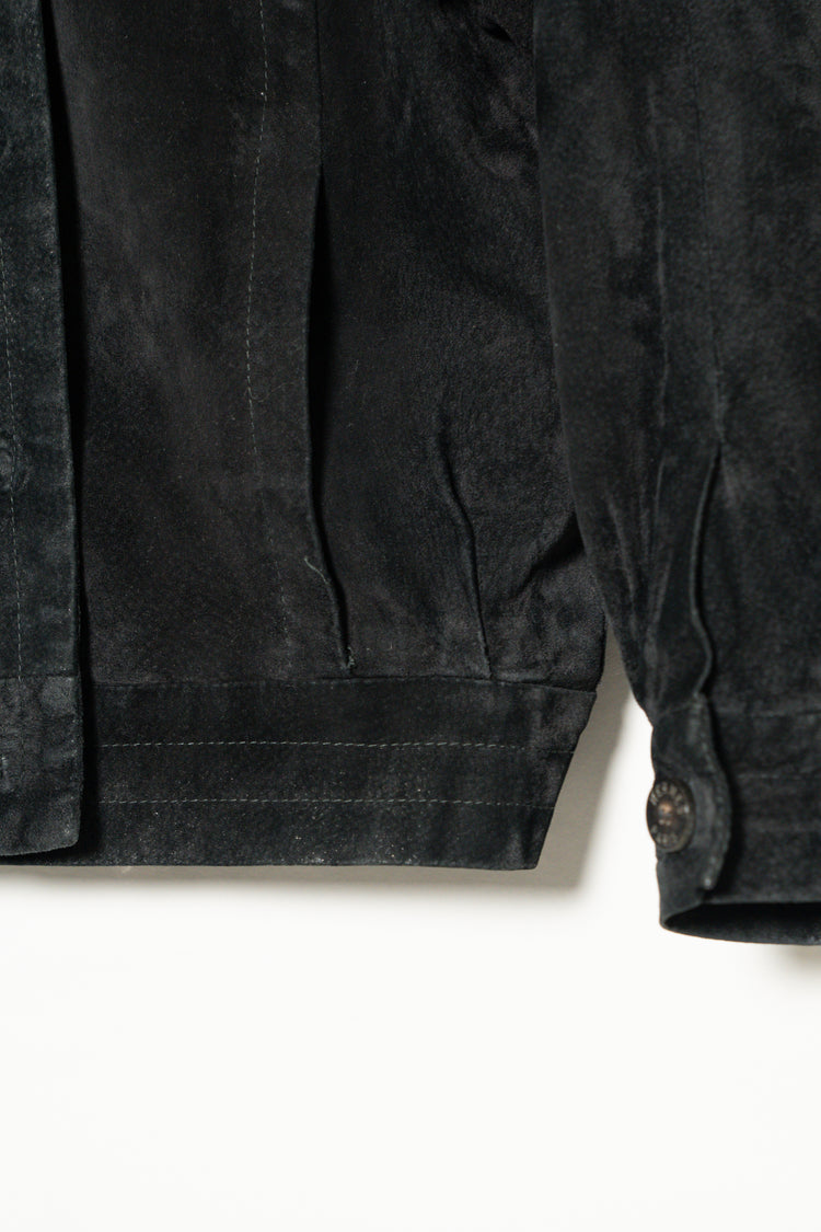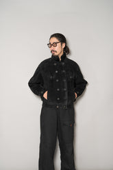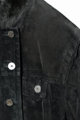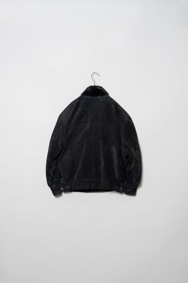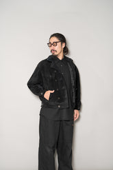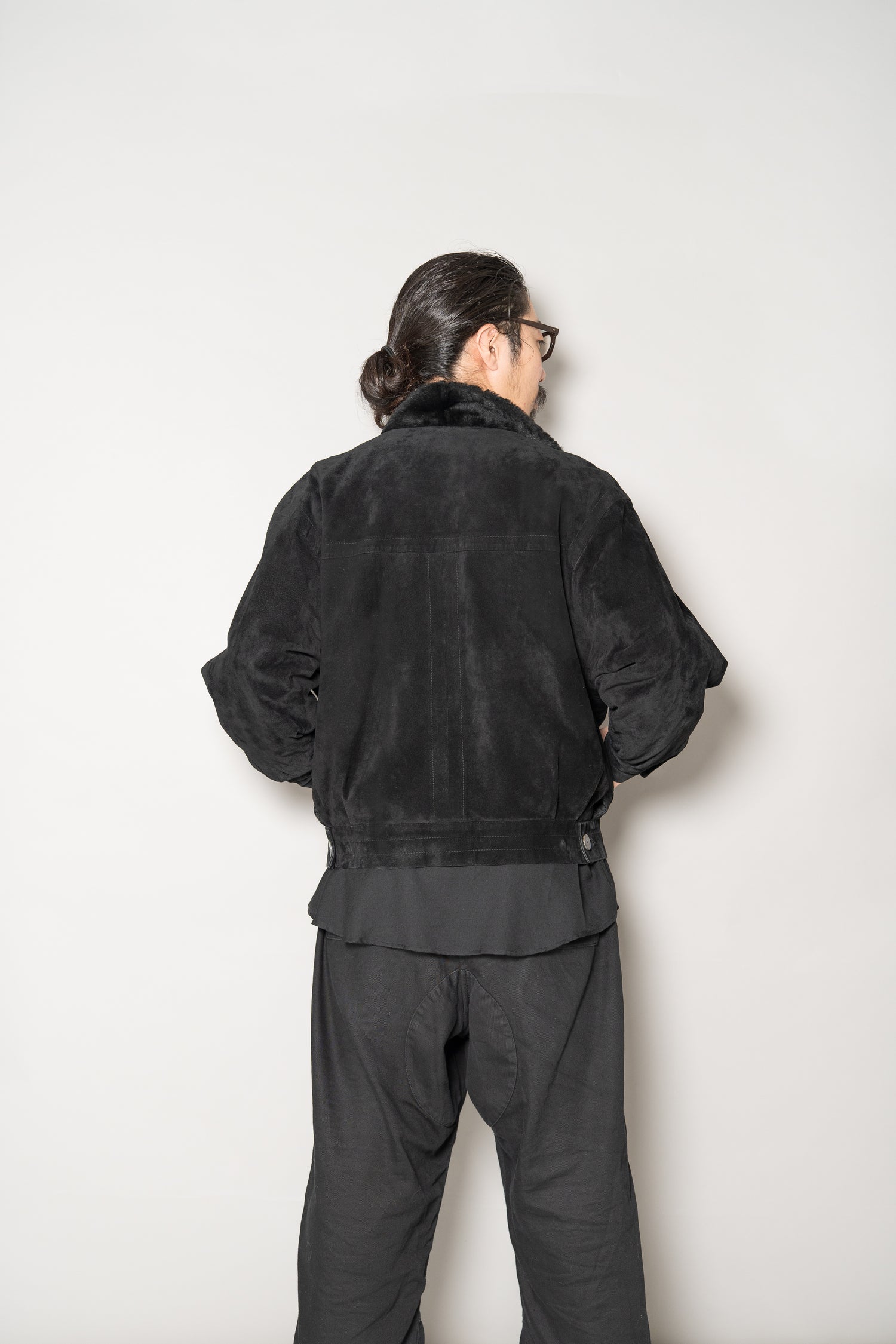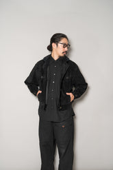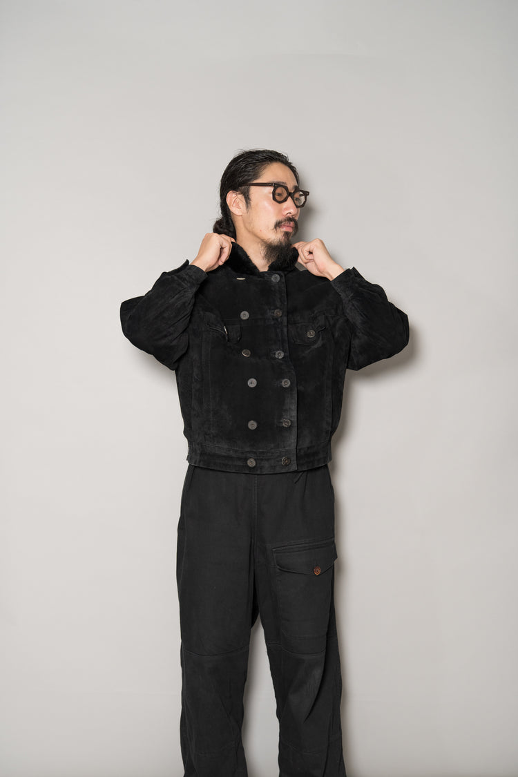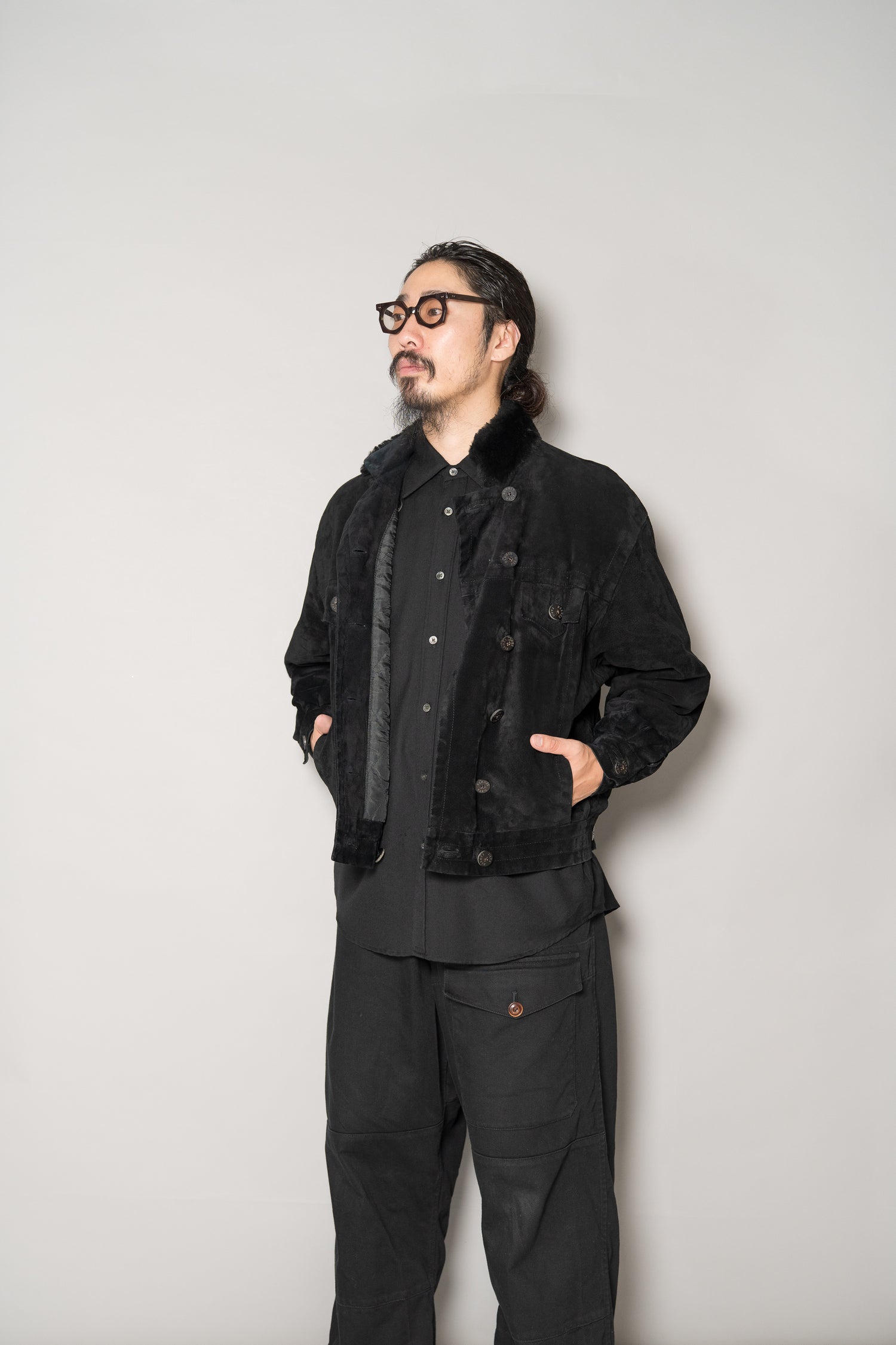 このジャケットは、エルメスが誇るレザーワークの真髄を体現する一着です。素材には、ラグジュアリーブランドの中でもほとんど用いられることのない「ピッグスキン(豚革)」を採用。上質な素材ながら非常に扱いが難しいことで知られ、熟練した職人の手でしか仕立てられない特別なレザーです。表面を丁寧にスウェード調へと仕上げることで、深いマットブラックの質感が生まれ、光を受ける角度でわずかに艶を帯びる独特の陰影が現れます。まさに、使い込むほどにその表情を変えていく「育つ革」。HERMÈS が長年培ってきた素材哲学が息づいています。