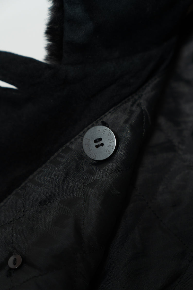 内側には、ダイヤ状にキルティングステッチが走るライナーを備えています。このキルティングは軽量な中綿構造で、外見の重厚感に反して着心地は驚くほど柔らかく、保温性にも優れています。寒冷な季節でも快適に羽織ることができる実用性と、エルメス特有のしなやかさが共存するつくりです。タグには「PEAU DE PORC PIGSKIN」の表記が入り、“MADE IN FRANCE” の文字がその品質を静かに証明しています。