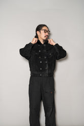 シルエットは、Gジャン型をベースにダブルブレスト仕様を組み合わせたデザイン。カジュアルなワークジャケットのフォルムに、テーラードの構築性を重ねることで、日常に上質さと凛とした印象を与えます。フロントのボタンには「HERMÈS PARIS」の刻印が施され、細部にまでブランドの矜持を感じることができます。袖口のボタンや胸ポケットのフラップ、そしてダブル仕立ての重ね合わせ部分など、一つ一つが丁寧に設計され、実用性と美しさを両立しています。