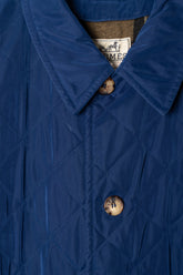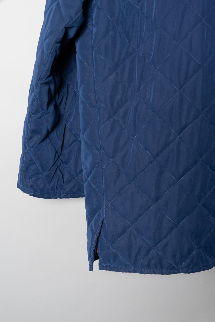 このコートの大きな特徴は、クラシカルな キルティング構造 と 着脱可能なライナー を備えている点にあります。表面はダイヤ型のステッチが連なる伝統的なキルティング仕立て。これにより、中綿が均等に配置され、優れた保温性と軽やかな着心地を実現しています。ステッチが生み出す陰影は、単なる防寒具としての機能を超え、光の加減や動きによって美しい表情を演出します。