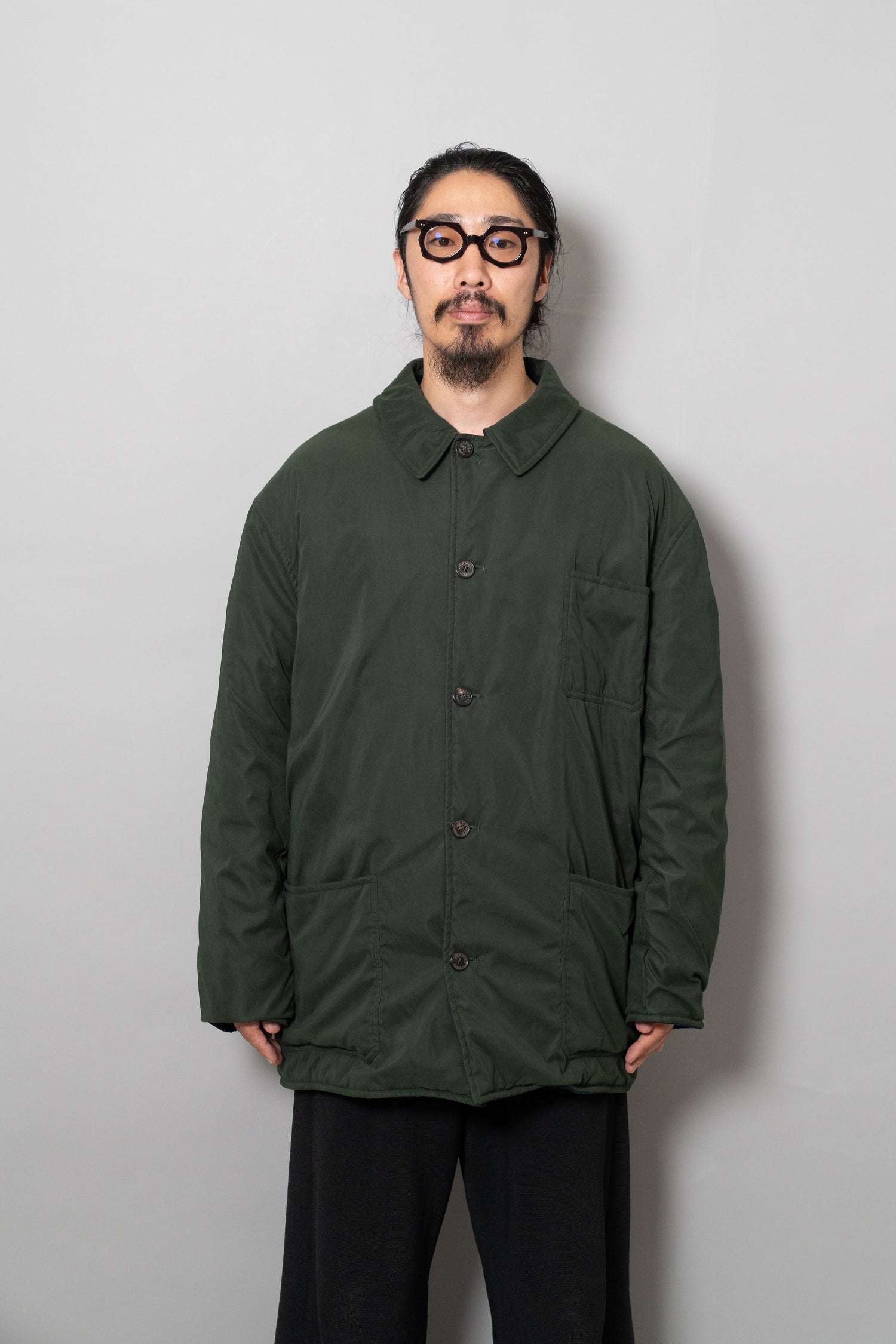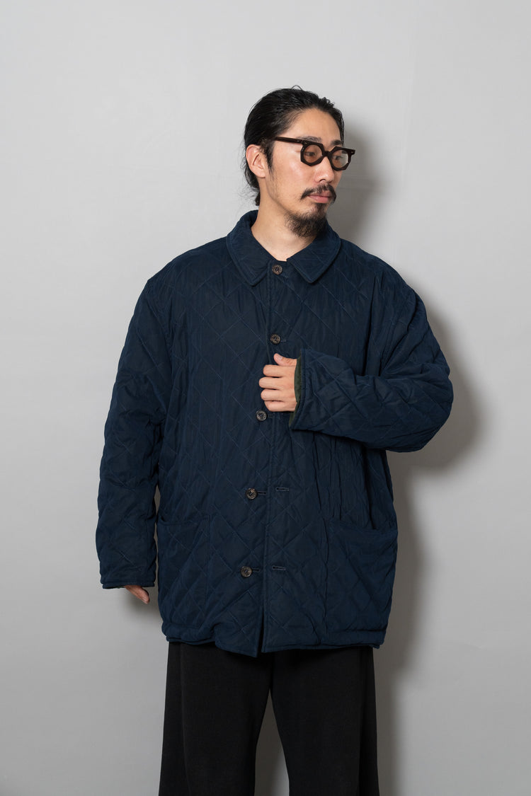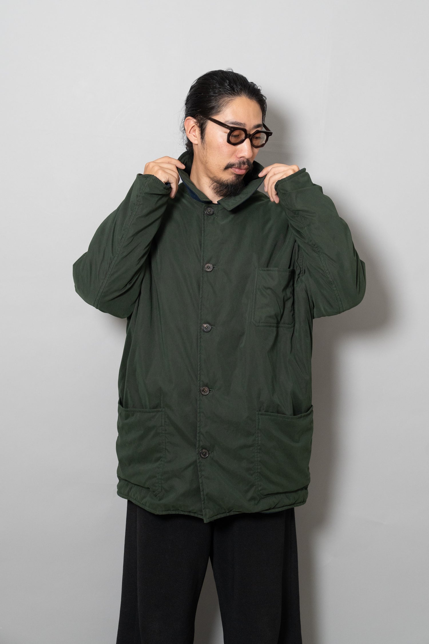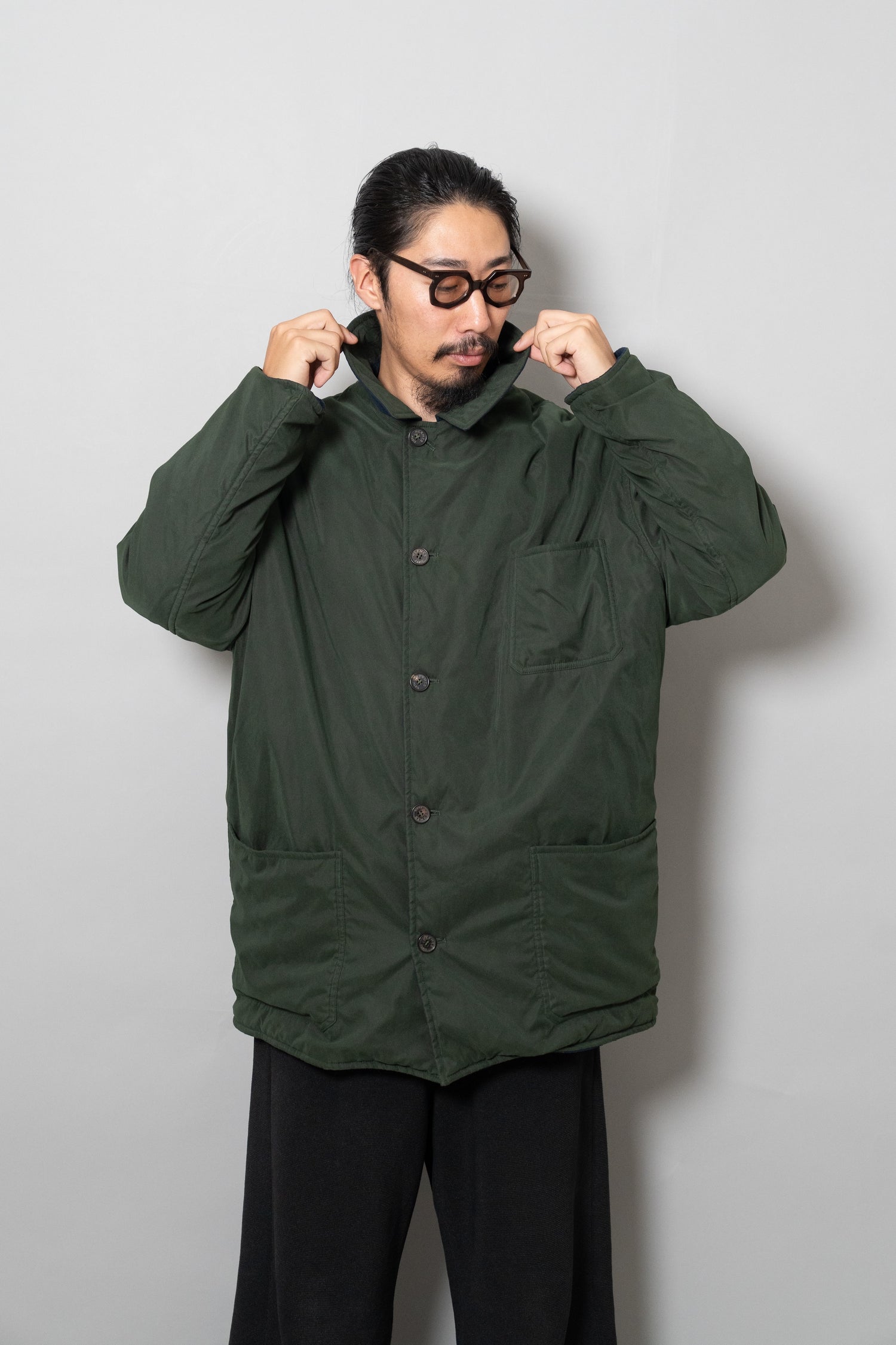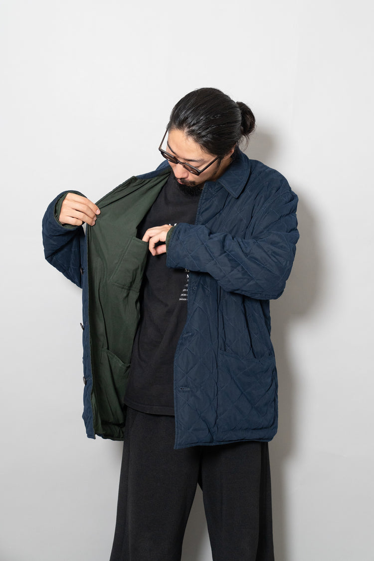 キルティング面は中綿を包み込むことで軽やかな保温性を確保しつつ、ステッチワークによって立体的な陰影を生み出しています。これは単なる防寒着ではなく、光と動きに応じてニュアンスを変える「ファブリックの美」を表現したもの。対してプレーンな面は、素材本来の質感を前面に押し出し、よりシックで落ち着いた印象を演出します。両面ともポケットが配され、機能性を損なうことなくデザインが成立している点も見逃せません。