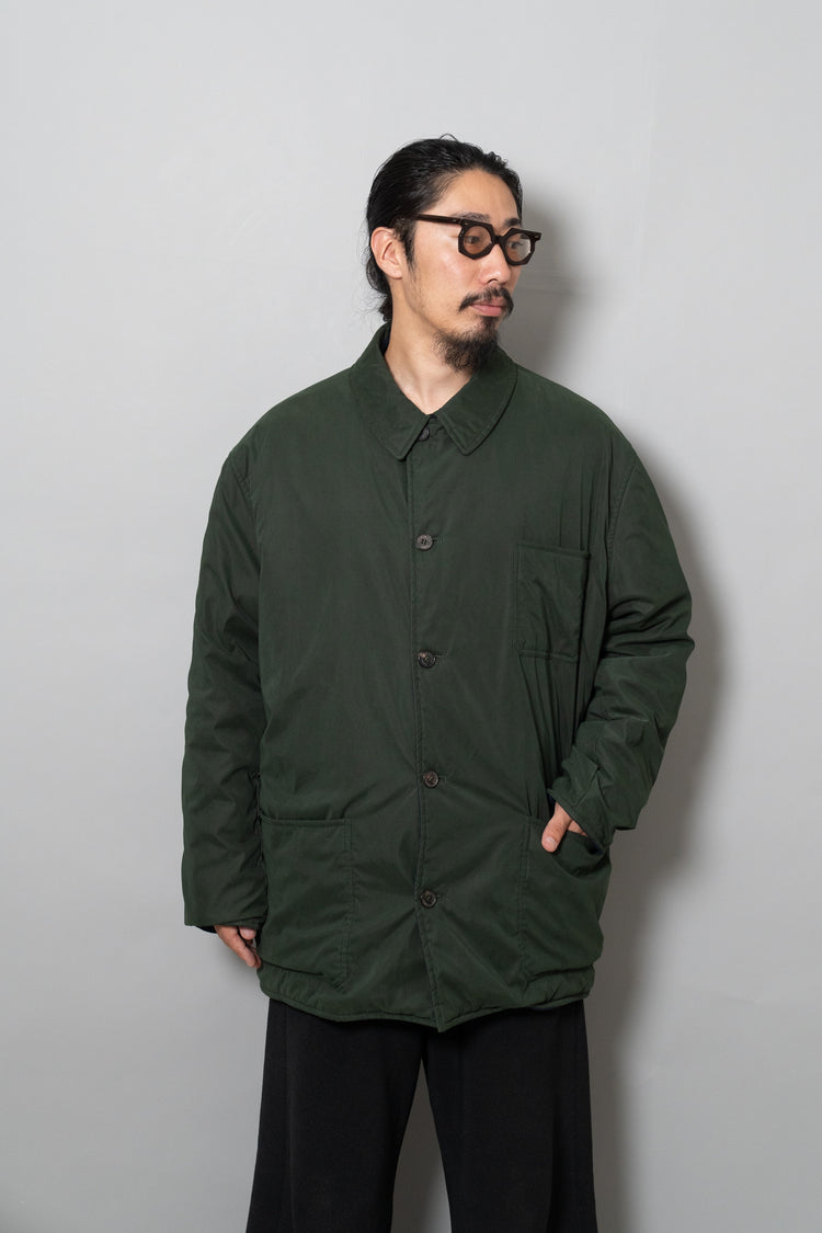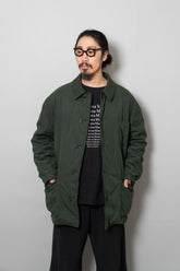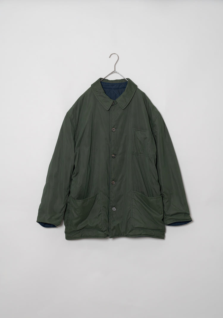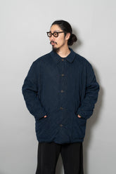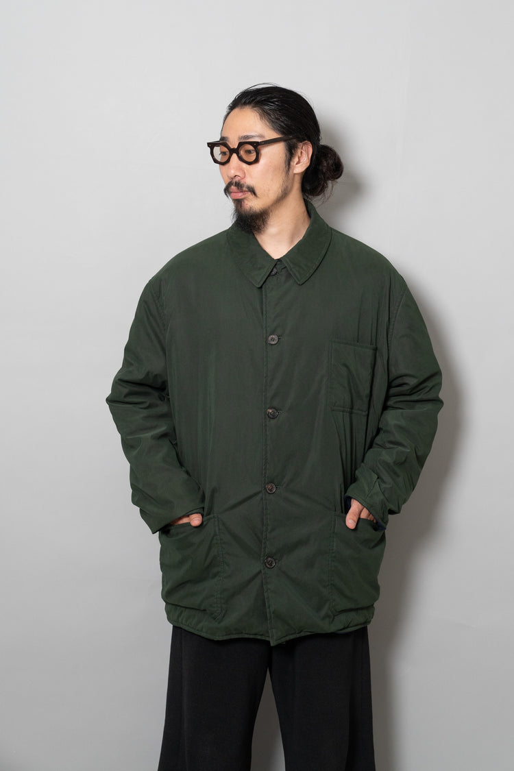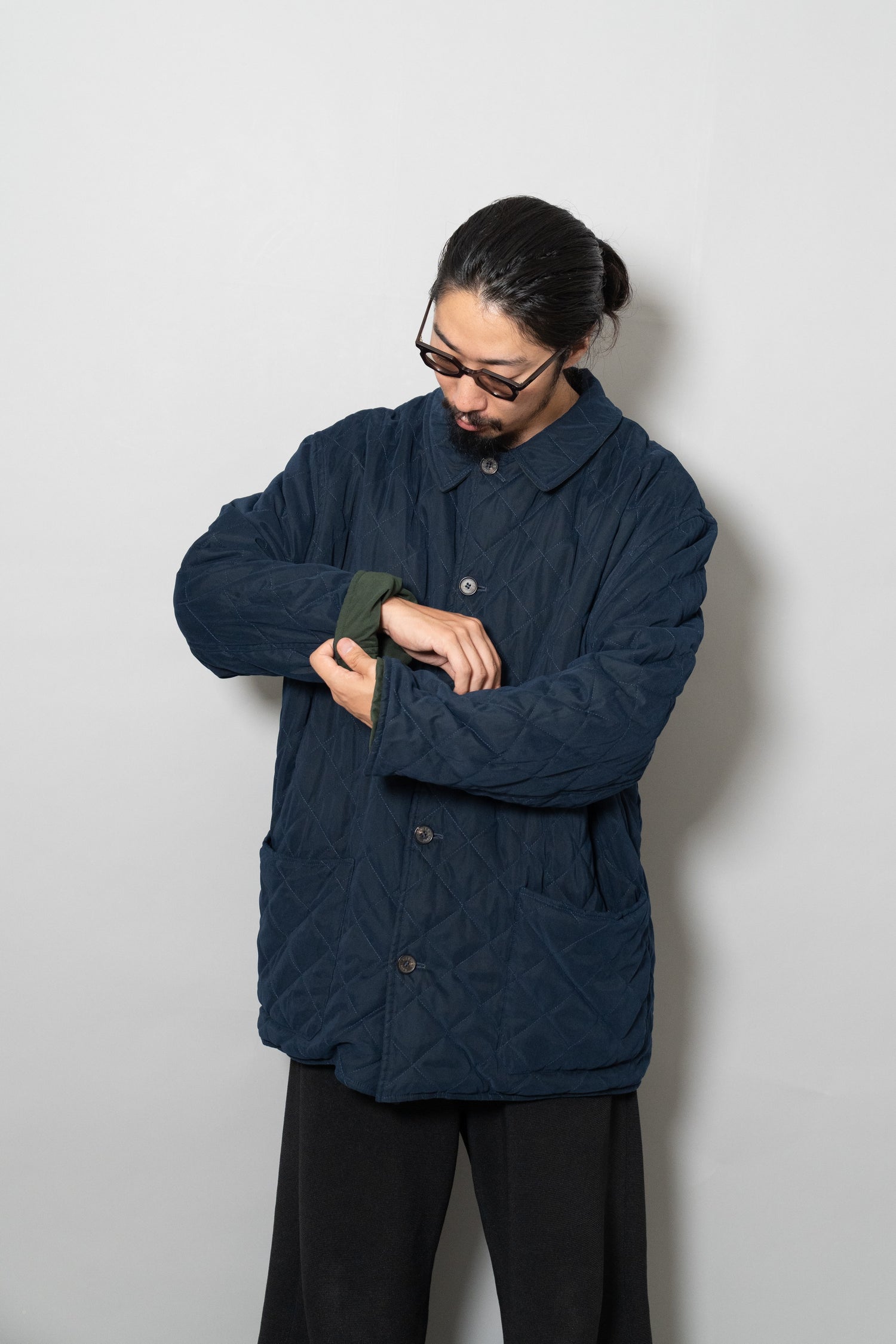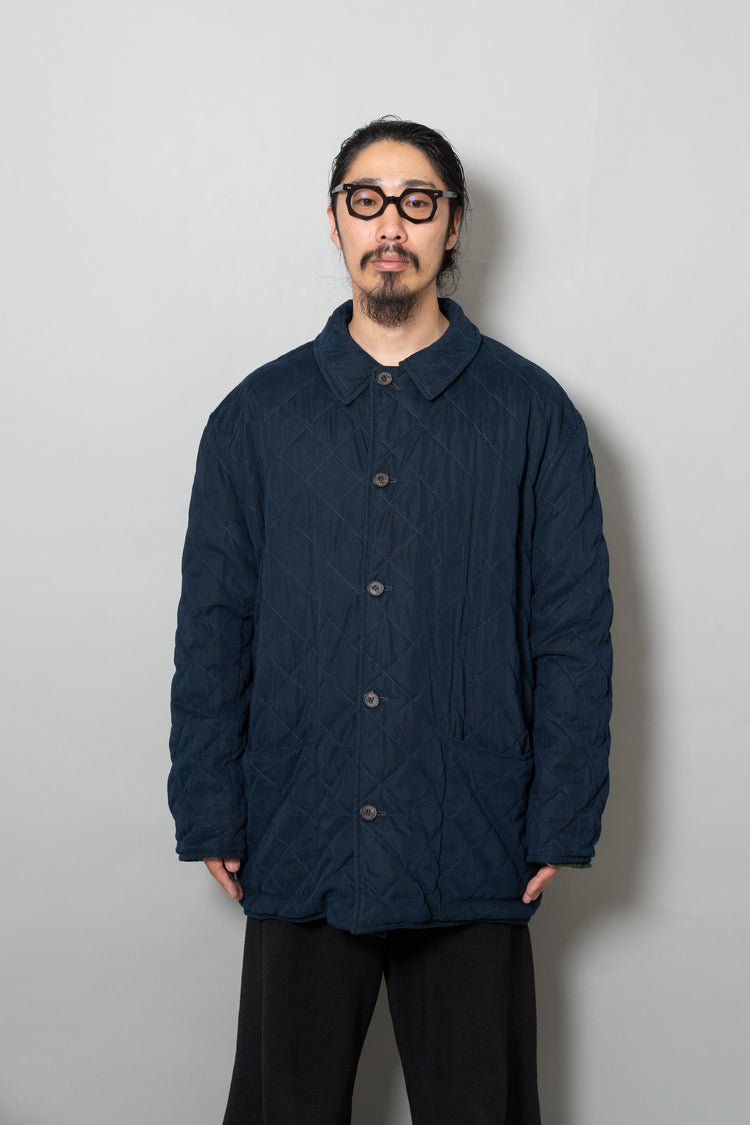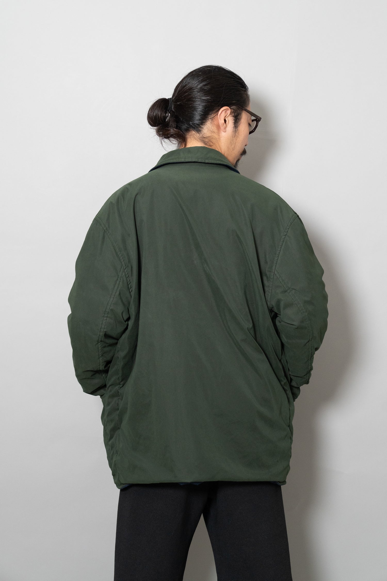 キルティング面は中綿を包み込むことで軽やかな保温性を確保しつつ、ステッチワークによって立体的な陰影を生み出しています。これは単なる防寒着ではなく、光と動きに応じてニュアンスを変える「ファブリックの美」を表現したもの。対してプレーンな面は、素材本来の質感を前面に押し出し、よりシックで落ち着いた印象を演出します。両面ともポケットが配され、機能性を損なうことなくデザインが成立している点も見逃せません。