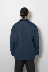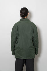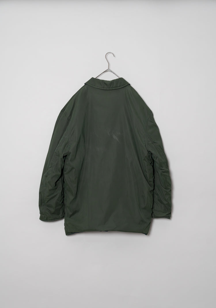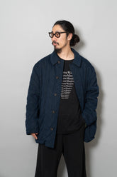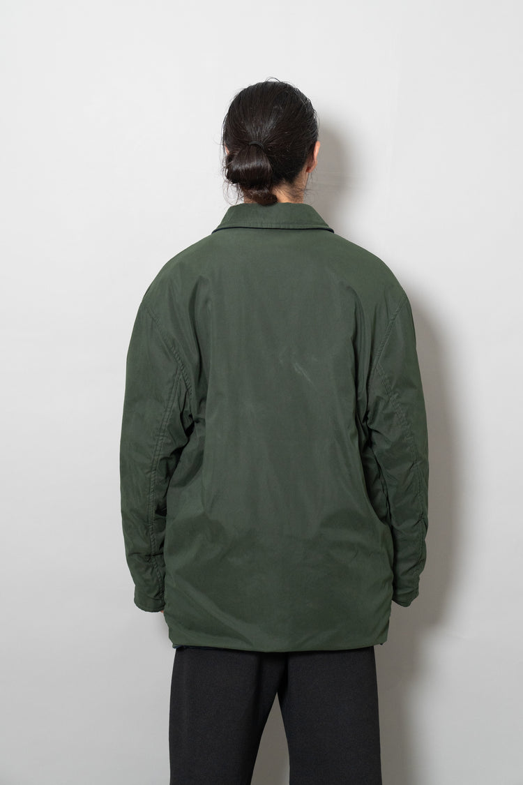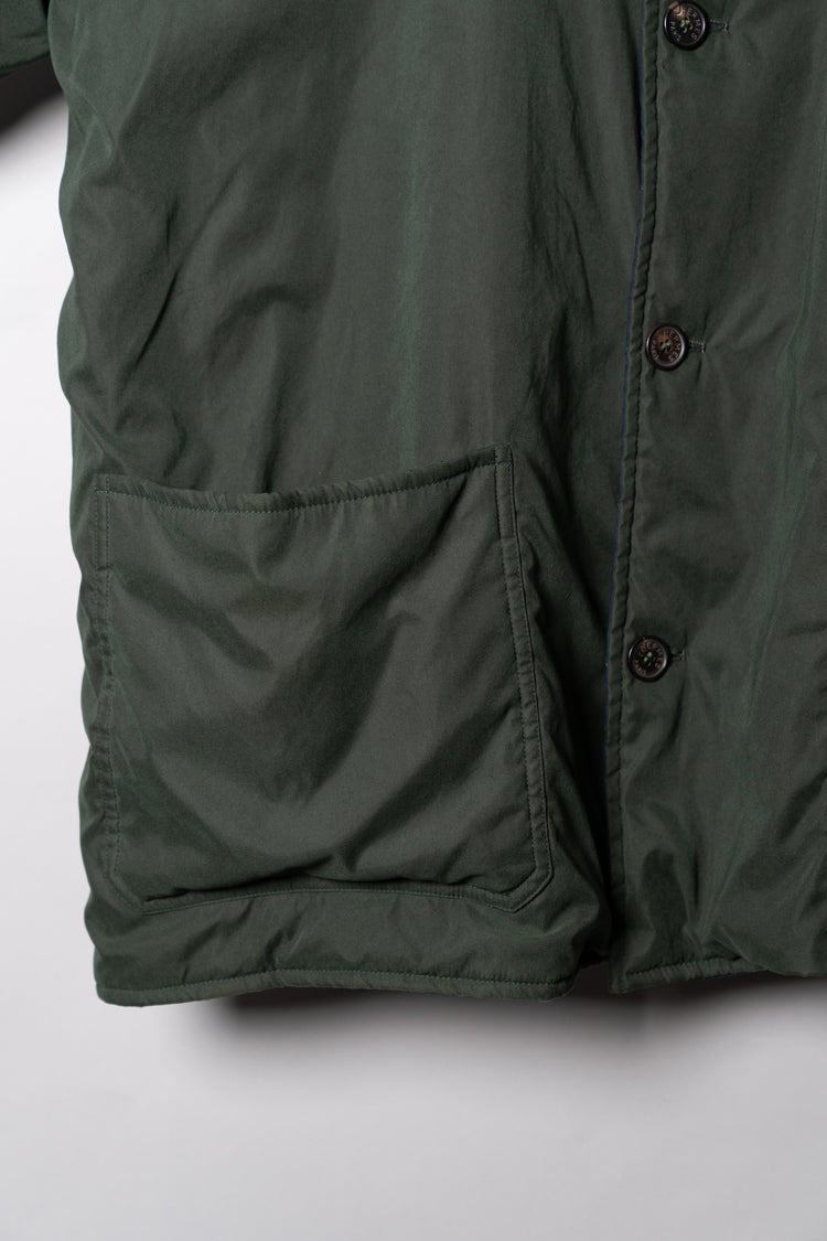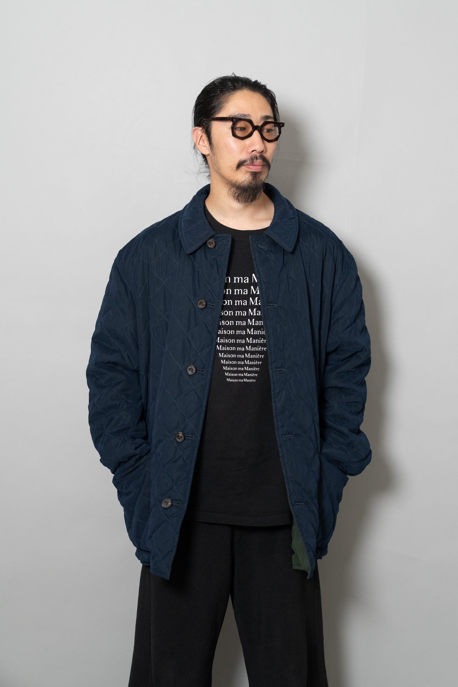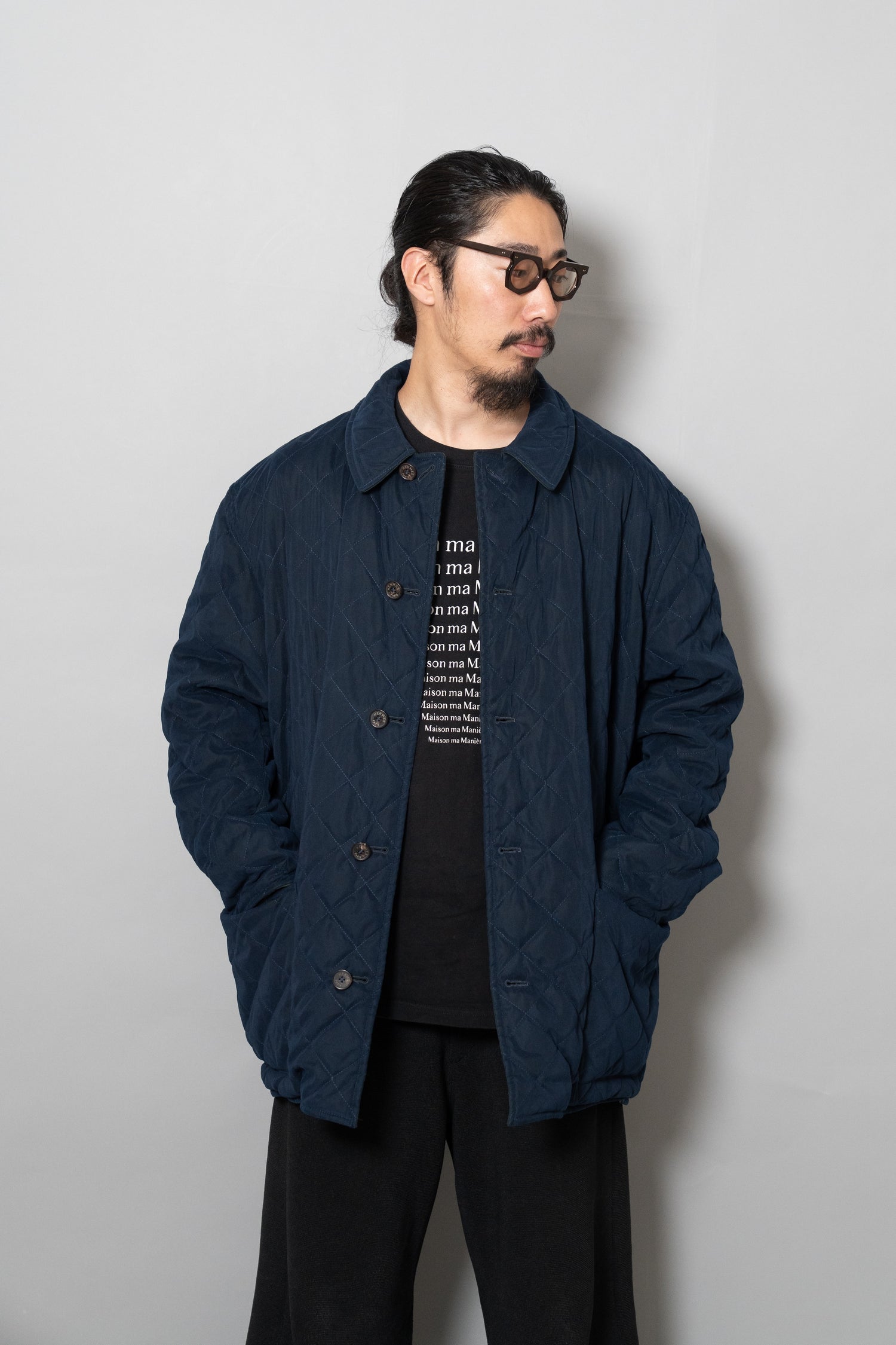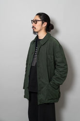 キルティング面は中綿を包み込むことで軽やかな保温性を確保しつつ、ステッチワークによって立体的な陰影を生み出しています。これは単なる防寒着ではなく、光と動きに応じてニュアンスを変える「ファブリックの美」を表現したもの。対してプレーンな面は、素材本来の質感を前面に押し出し、よりシックで落ち着いた印象を演出します。両面ともポケットが配され、機能性を損なうことなくデザインが成立している点も見逃せません。