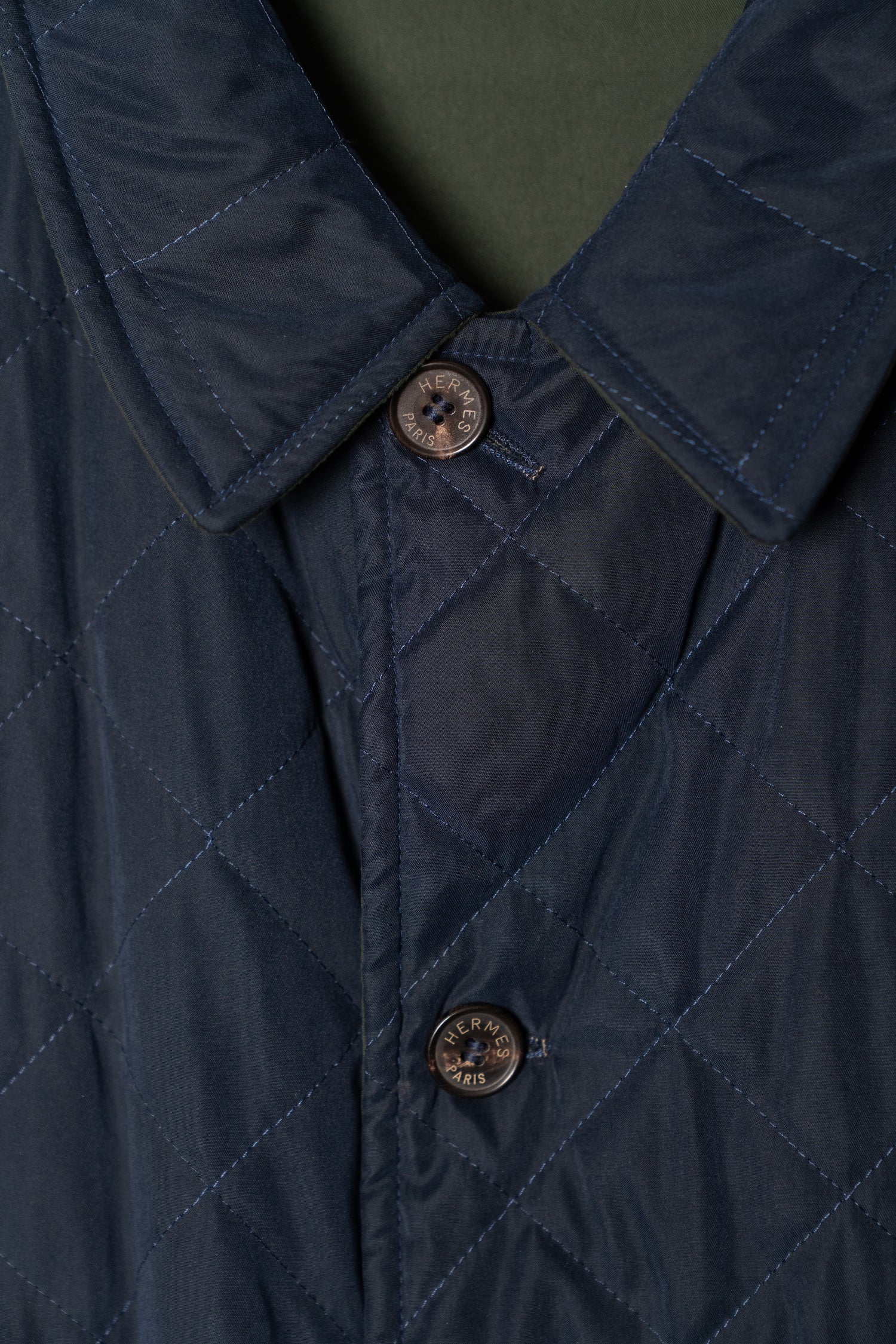 まず目を引くのは、リバーシブル仕様という実用的な構造です。片面はダイヤ型のキルティングが施されたネイビートーン。落ち着きがありながらも知的な印象を与え、都会的で洗練されたスタイルにマッチします。もう一方はプレーンな表情のカーキグリーン。ミリタリーテイストを想起させながらも、エルメスらしい上品さが漂い、カジュアルダウンした装いに自然に溶け込みます。シーンや気分に応じて表情を変えられるこの二面性は、日常の幅を大きく広げてくれるでしょう。