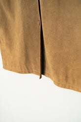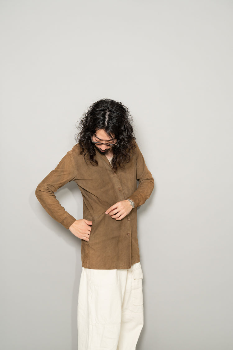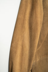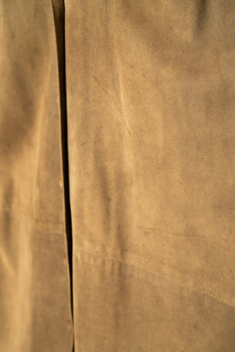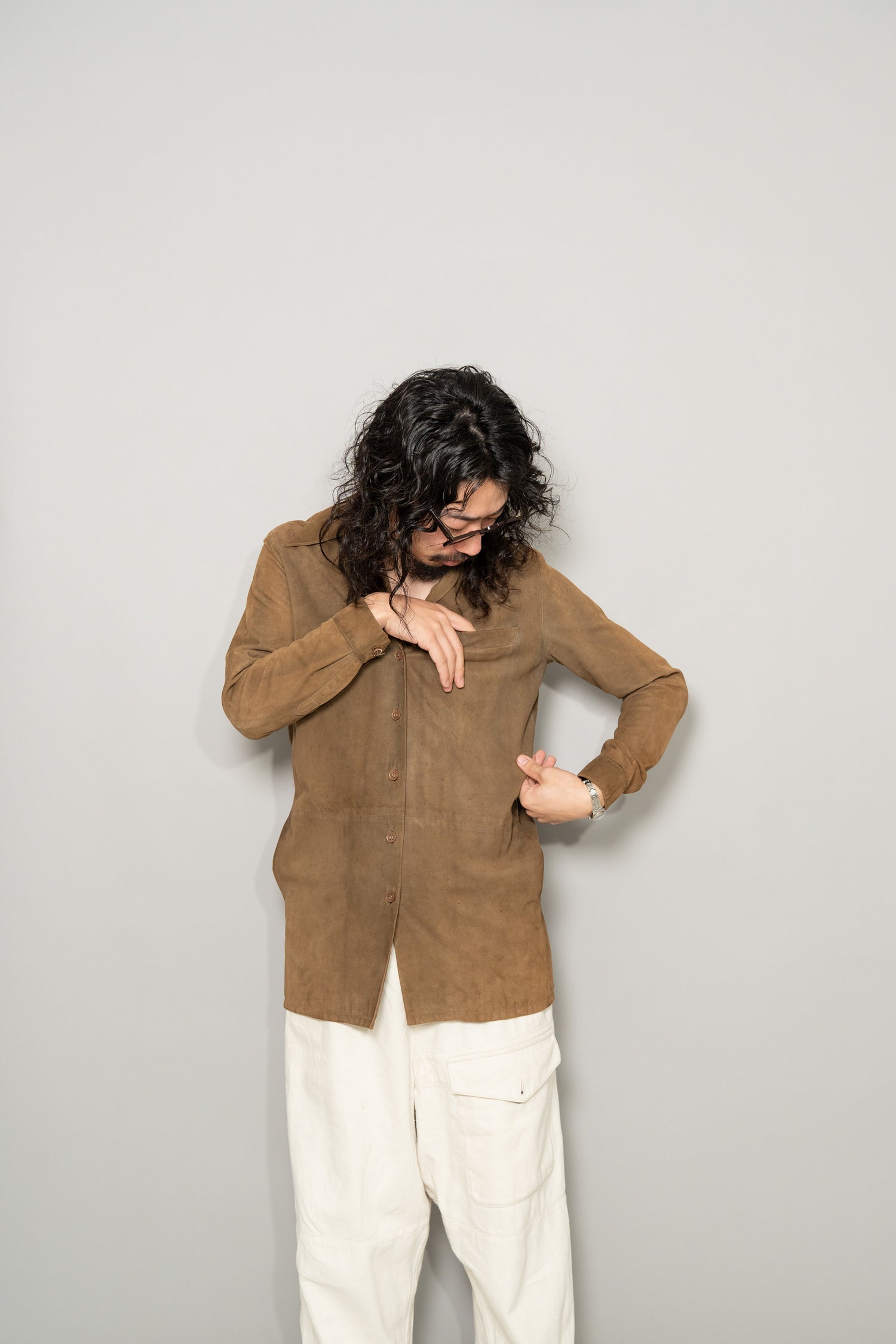 素材にはヌバック調に仕上げられたラムスキンレザーが用いられており、一般的なスムースレザーとは異なる、きめ細かくマットで柔らかな表情が特徴です。ラムレザー特有の軽やかさとしなやかさにより、レザーコートでありながらも重苦しさを感じさせず、シャツジャケットのような軽快さを備えています。エルメスは元来、馬具工房をルーツに持つメゾンであり、革素材の選定やなめし、仕上げに関しては世界最高峰の技術を誇ります。そのエルメスが厳選したラムスキンを、マルジェラのミニマルな設計思想のもとでコートに落とし込んでいる点に、本作の本質的な価値があります。レザーでありながら“着るほどに身体に馴染む”感覚は、量産的なレザーウェアでは決して味わえない魅力です。
