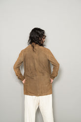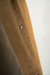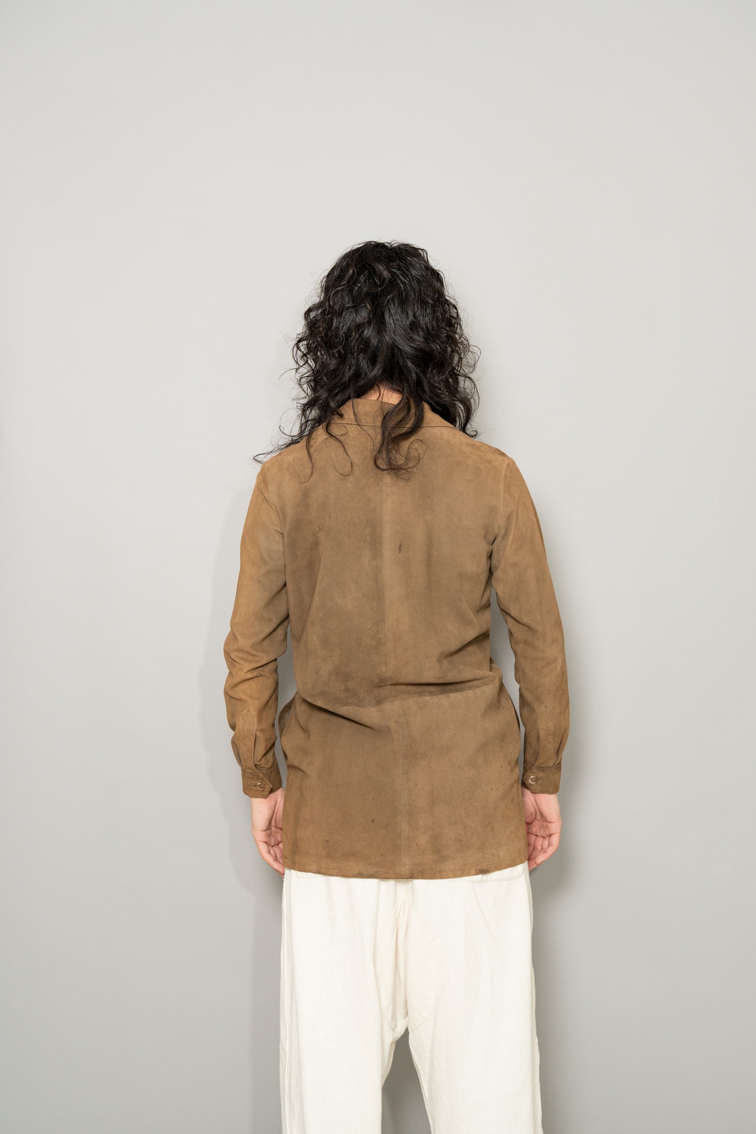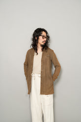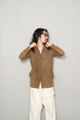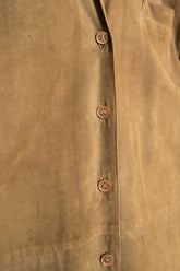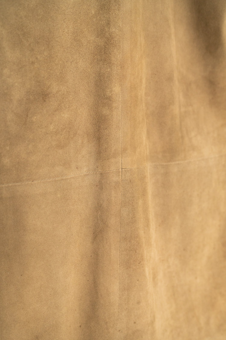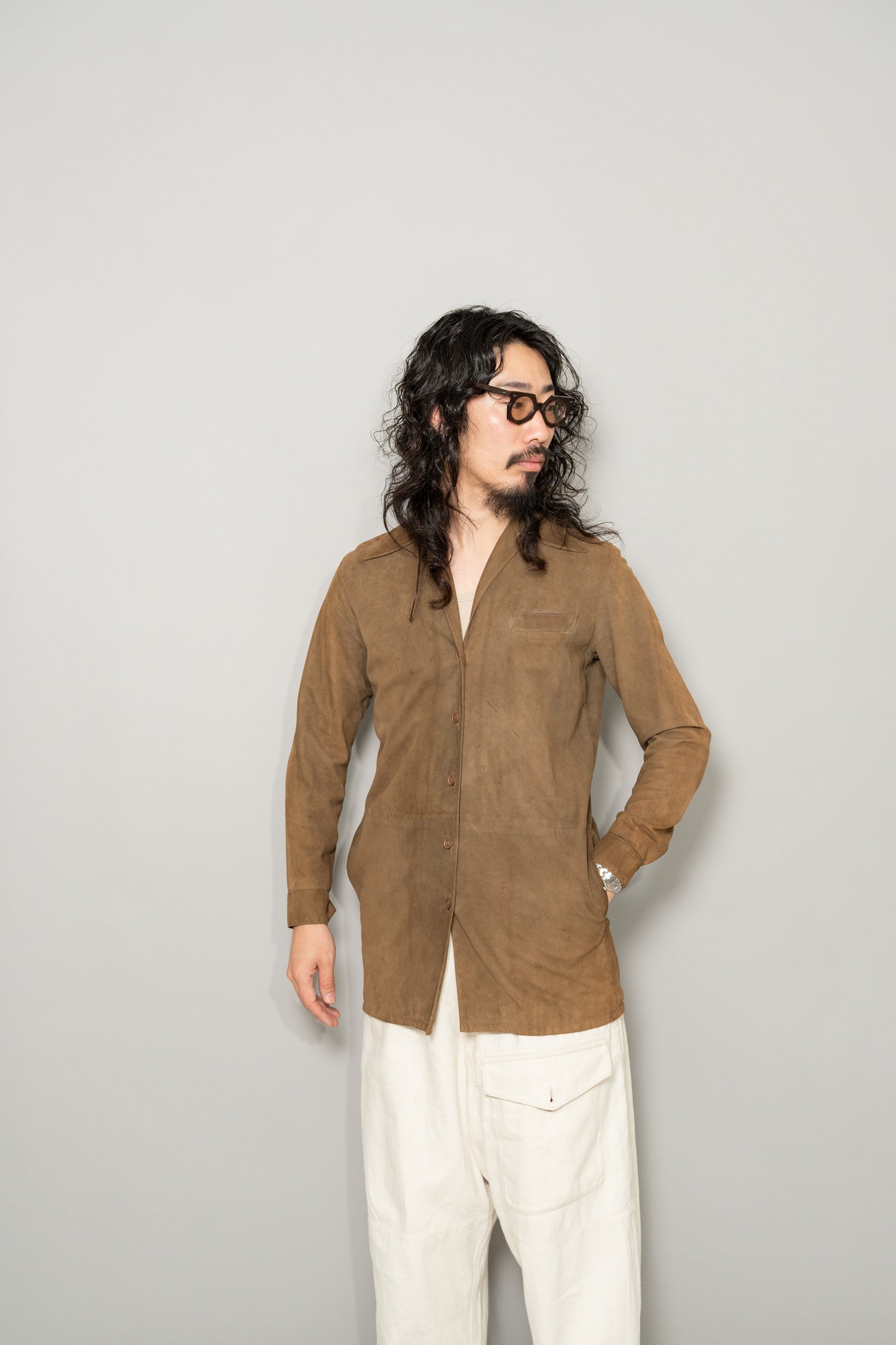 素材にはヌバック調に仕上げられたラムスキンレザーが用いられており、一般的なスムースレザーとは異なる、きめ細かくマットで柔らかな表情が特徴です。ラムレザー特有の軽やかさとしなやかさにより、レザーコートでありながらも重苦しさを感じさせず、シャツジャケットのような軽快さを備えています。エルメスは元来、馬具工房をルーツに持つメゾンであり、革素材の選定やなめし、仕上げに関しては世界最高峰の技術を誇ります。そのエルメスが厳選したラムスキンを、マルジェラのミニマルな設計思想のもとでコートに落とし込んでいる点に、本作の本質的な価値があります。レザーでありながら“着るほどに身体に馴染む”感覚は、量産的なレザーウェアでは決して味わえない魅力です。