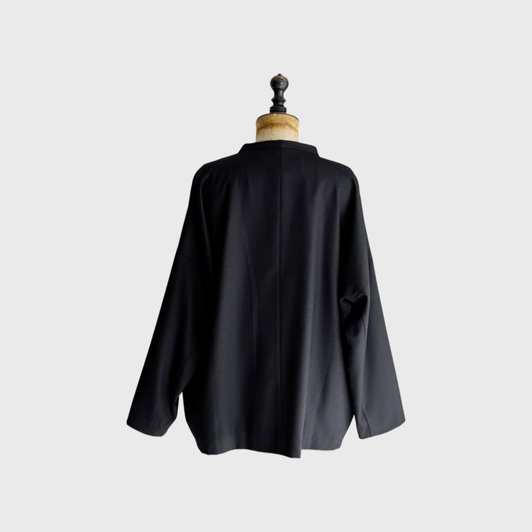 バージスブルックノーカラージャケット。柔らかな肌触りが特徴のサキソニーストレッチウールを使用したほのかに光沢感のある上品な1着。身幅、アームホールにしっかりゆとりをもたせたドロップショルダーデザインのルーズシルエット。抜け感を演出するシンプルかつ存在感のあるジャケットです。