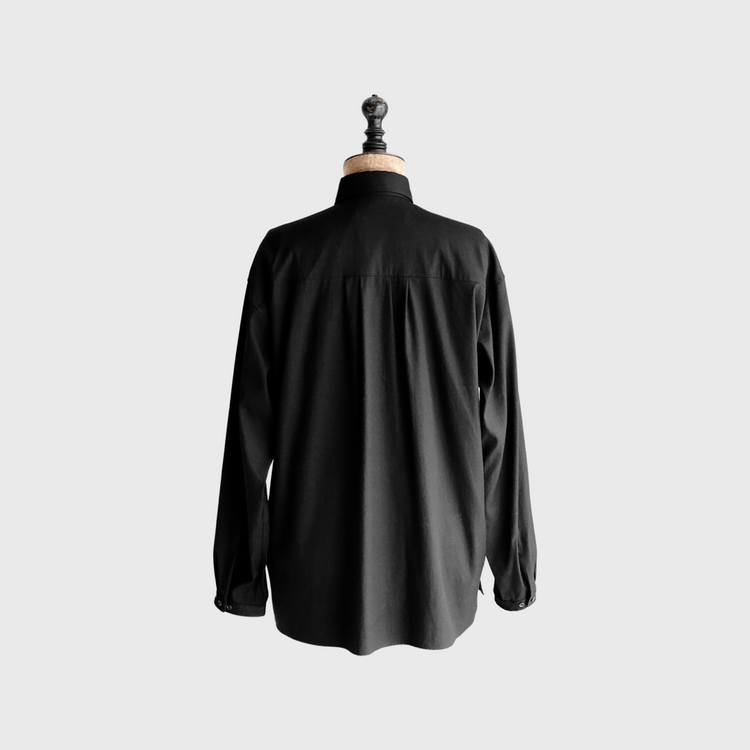 シンプルな佇まいですが、上から3つ以降のボタンは比翼仕立てとなっており、フルオープンながらデザイン性の高い一枚です。胸元にはフラップ付きのポケットが左右に一つずつ。袖にはギャザーが入っております。軽やかな素材感のため、夏場は腕をまくりながらオールシーズン着用できる一枚。モードからカジュアルまで様々なスタイリングをお楽しみ頂けます。