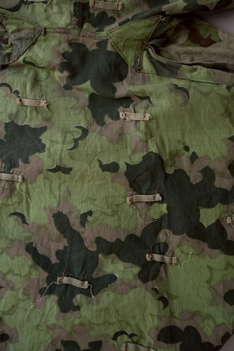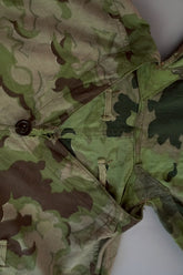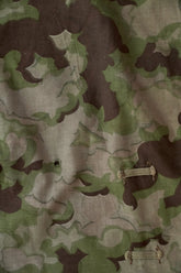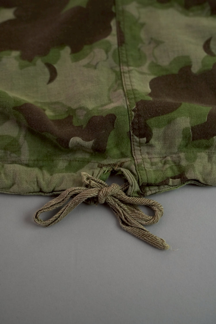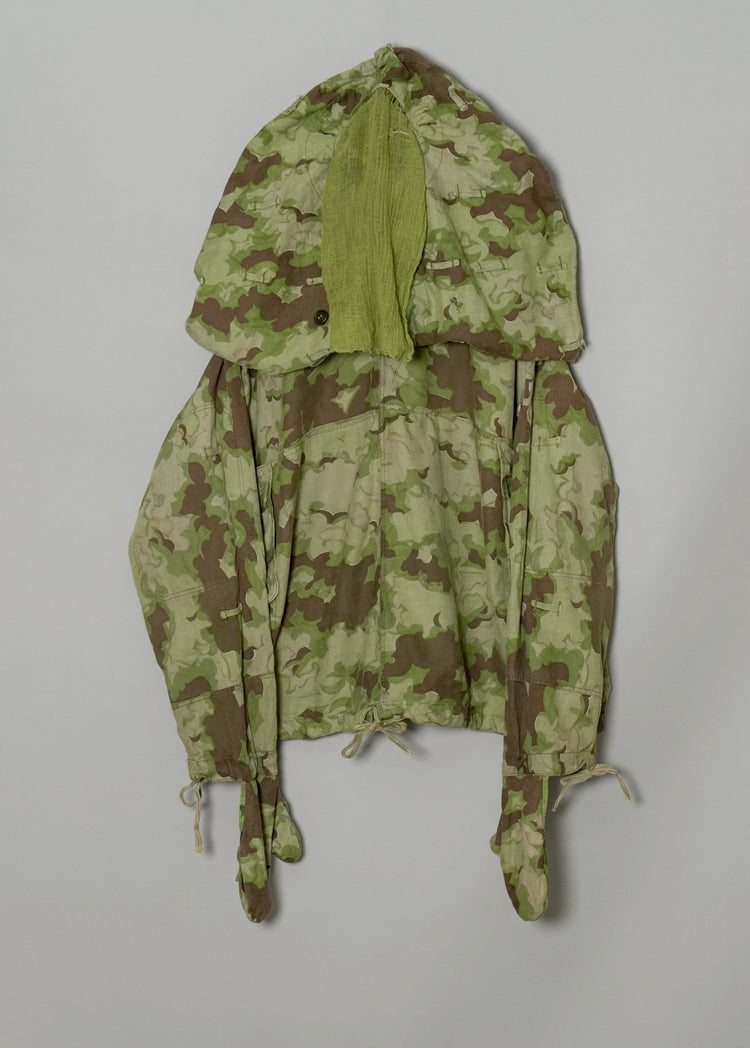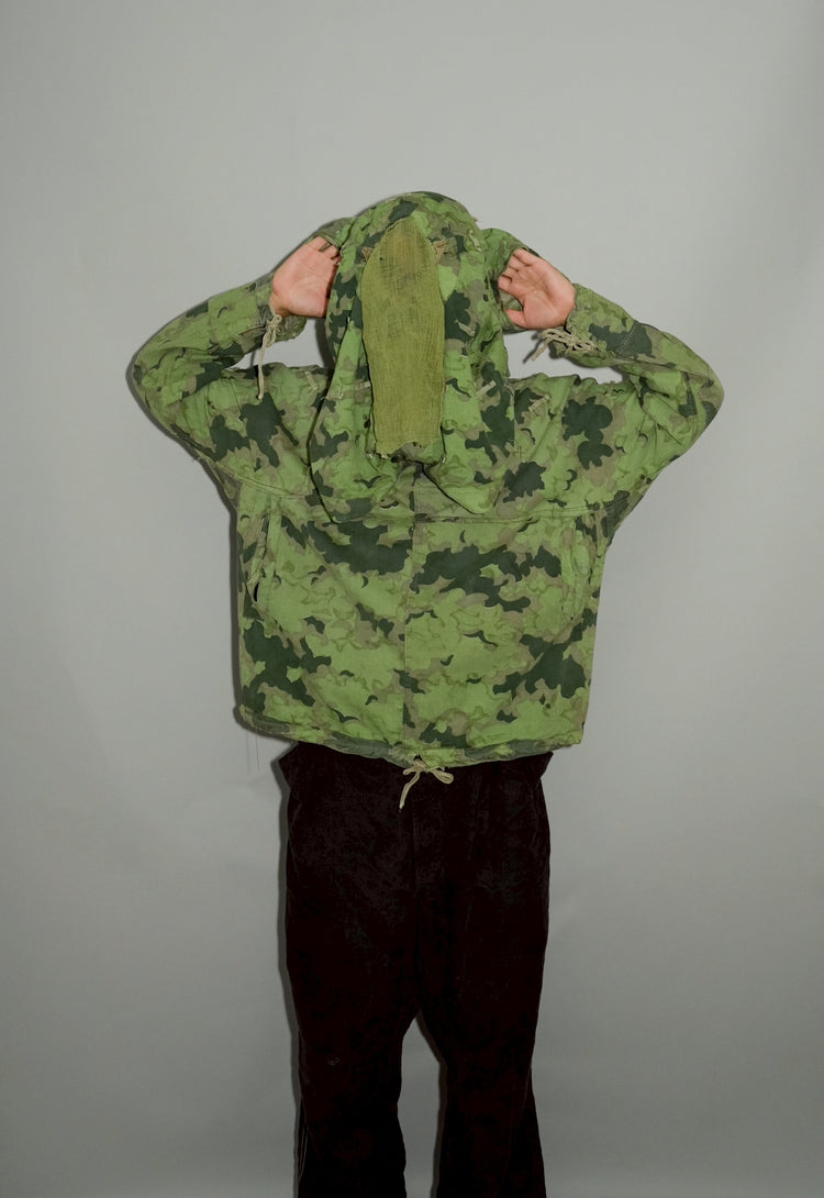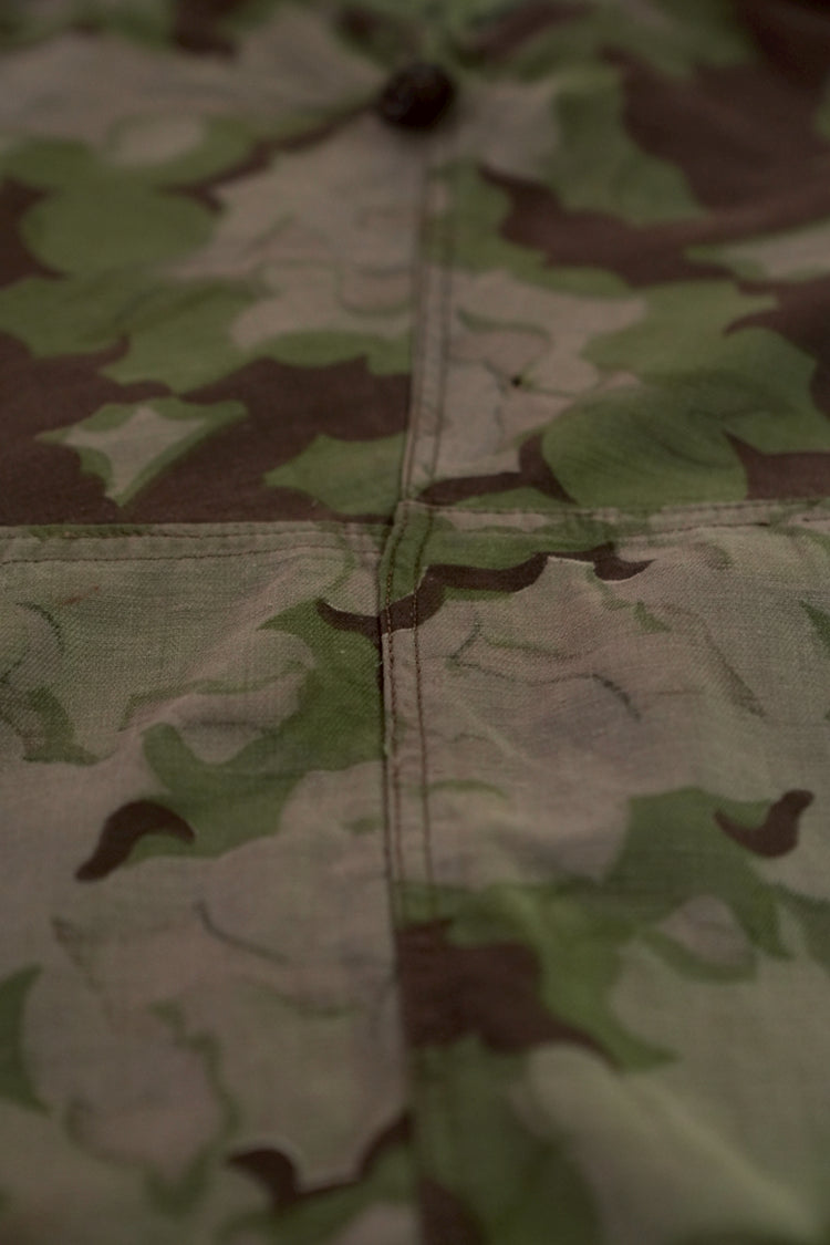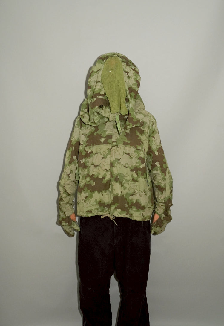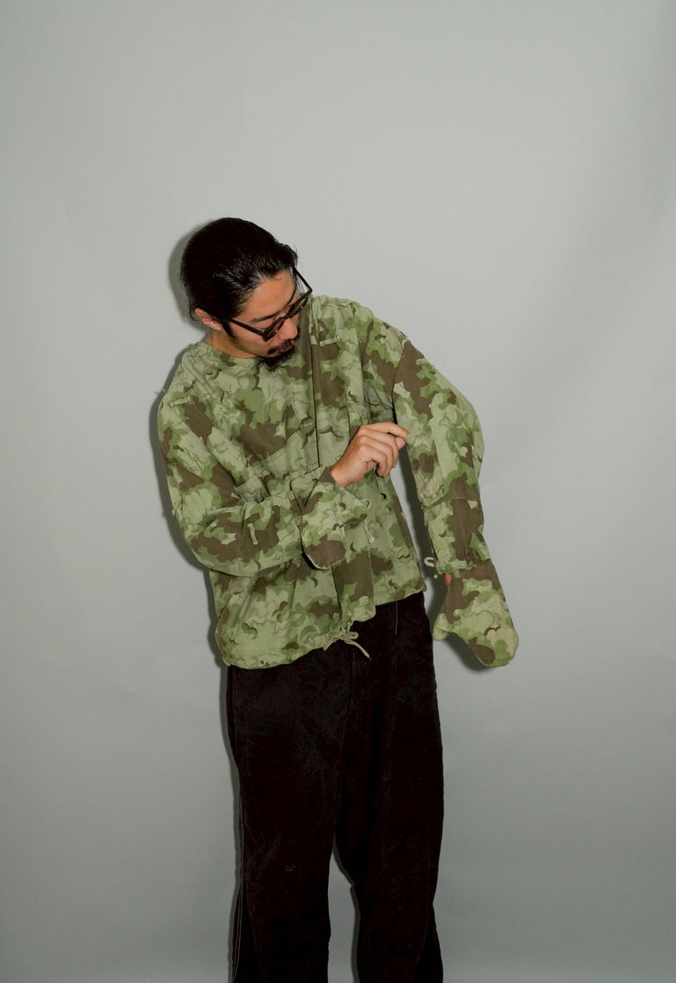 1950年代、チェコスロヴァキア軍によって採用された「クラウドカモフラージュ(Clouds camouflage)」は、ヨーロッパの迷彩史の中でも特異な存在として知られています。その名の通り、雲が漂うような有機的なパターンは、他国の直線的で幾何学的な迷彩柄とは一線を画す独自の美しさを持ち、今日ではコレクターやファッションデザイナーから高く評価されています。本品はそのクラウドカモを纏ったリバーシブルスモックで、フードとグローブが一体化した希少な仕様。数ある軍用被服の中でも特に資料性・造形美に優れた一点です。