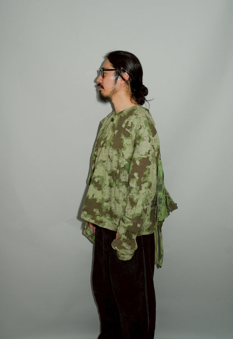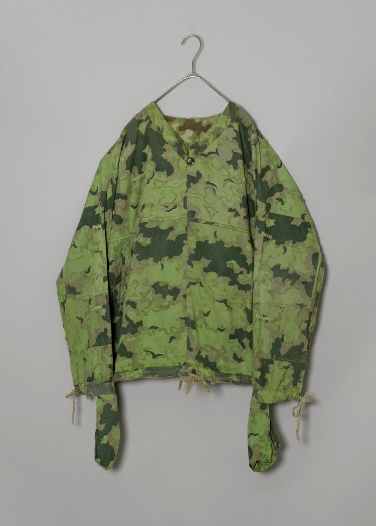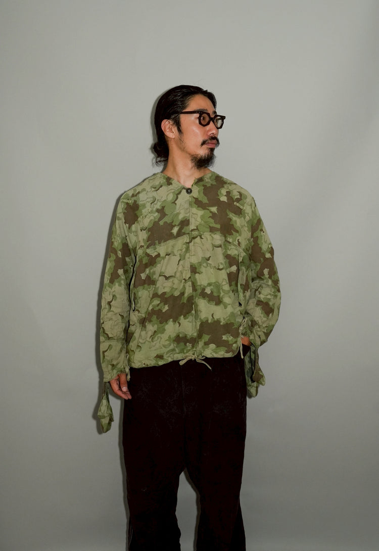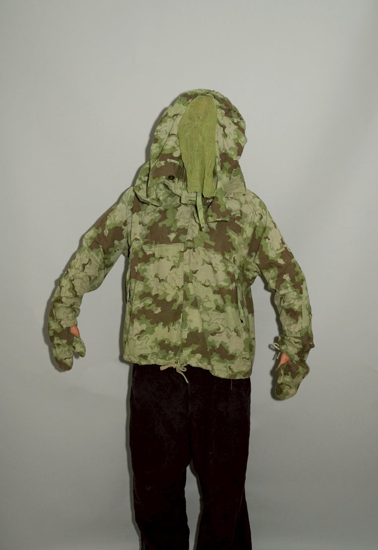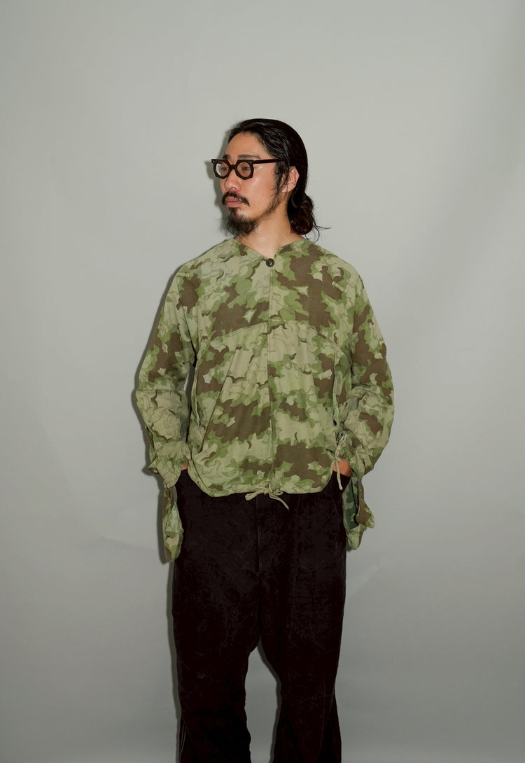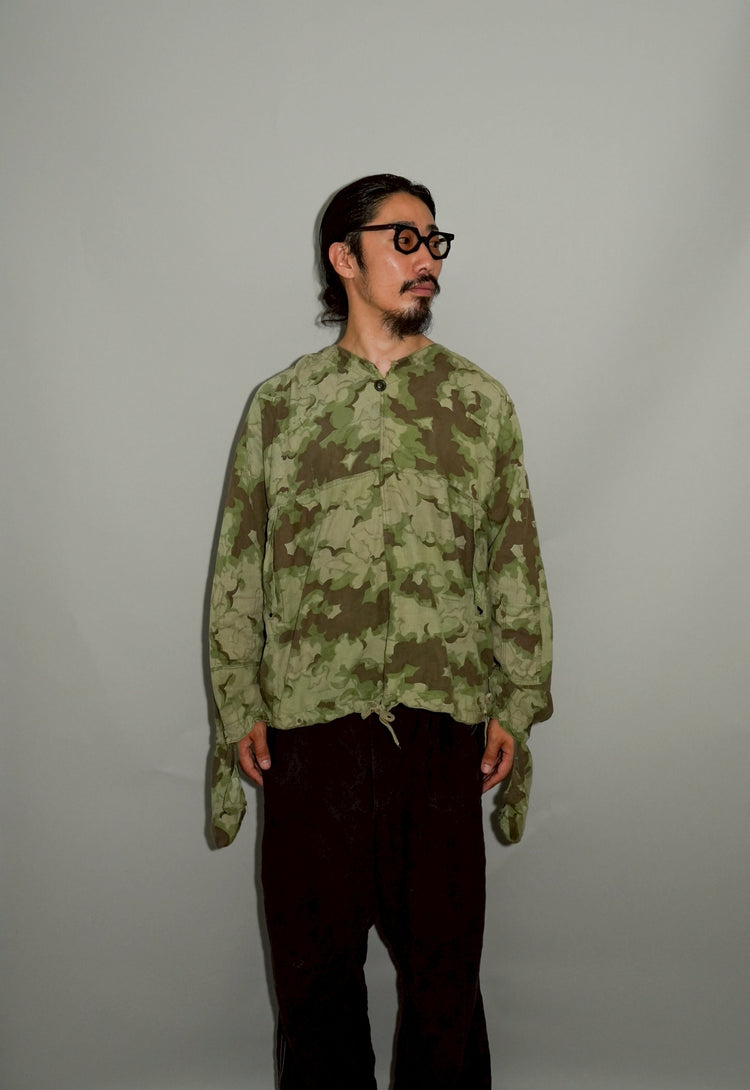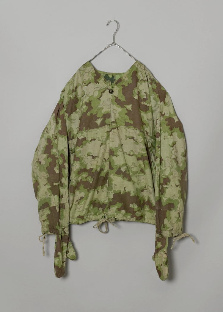 1950年代、チェコスロヴァキア軍によって採用された「クラウドカモフラージュ(Clouds camouflage)」は、ヨーロッパの迷彩史の中でも特異な存在として知られています。その名の通り、雲が漂うような有機的なパターンは、他国の直線的で幾何学的な迷彩柄とは一線を画す独自の美しさを持ち、今日ではコレクターやファッションデザイナーから高く評価されています。本品はそのクラウドカモを纏ったリバーシブルスモックで、フードとグローブが一体化した希少な仕様。数ある軍用被服の中でも特に資料性・造形美に優れた一点です。