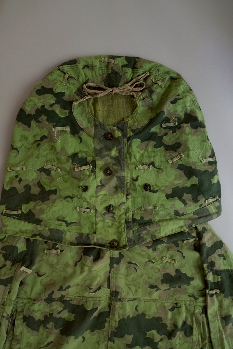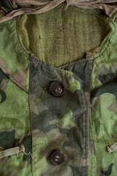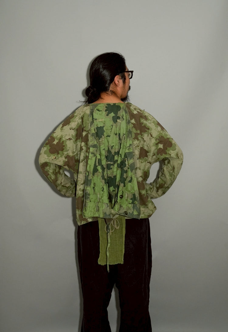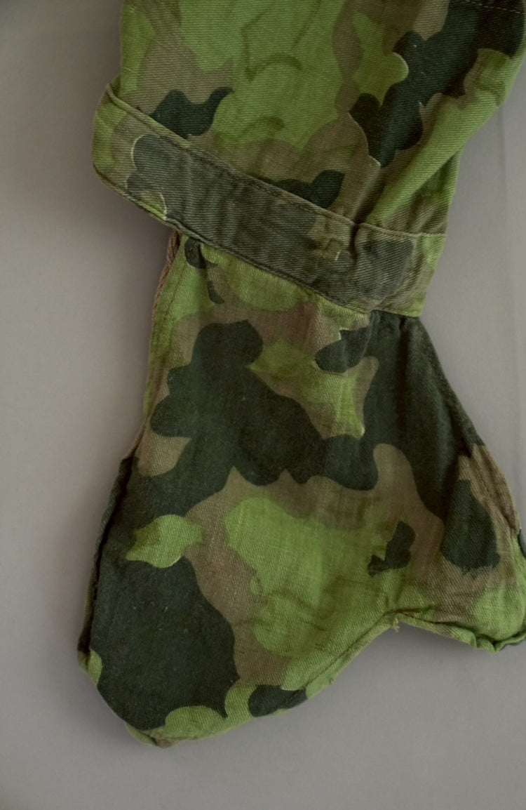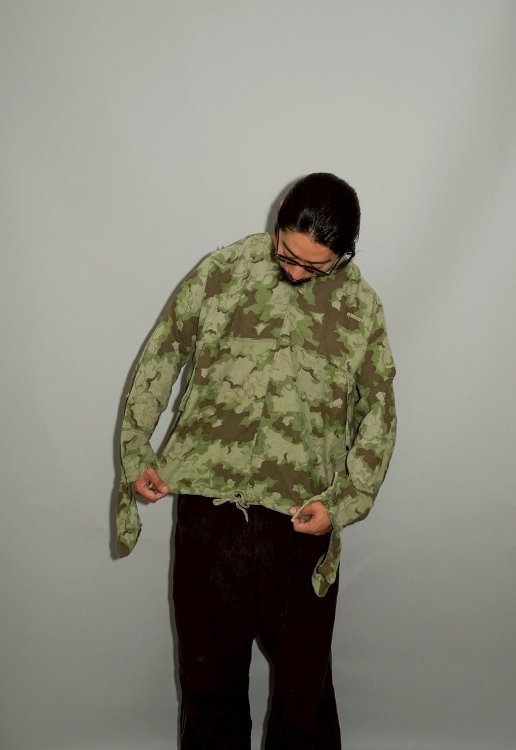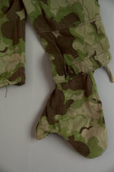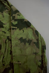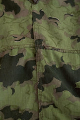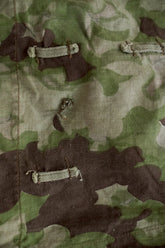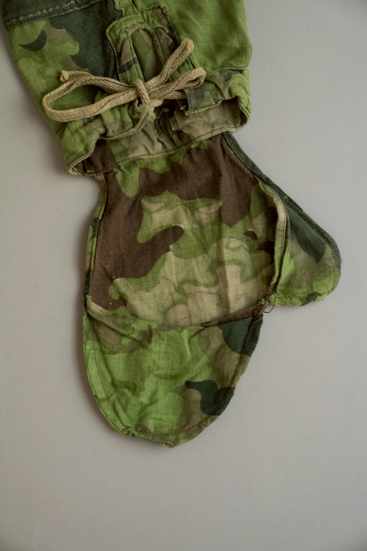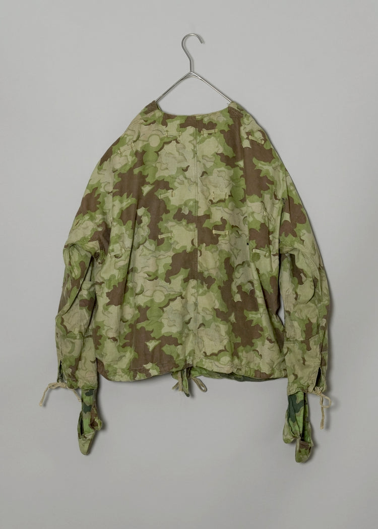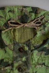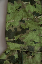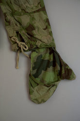 1950年代、チェコスロヴァキア軍によって採用された「クラウドカモフラージュ(Clouds camouflage)」は、ヨーロッパの迷彩史の中でも特異な存在として知られています。その名の通り、雲が漂うような有機的なパターンは、他国の直線的で幾何学的な迷彩柄とは一線を画す独自の美しさを持ち、今日ではコレクターやファッションデザイナーから高く評価されています。本品はそのクラウドカモを纏ったリバーシブルスモックで、フードとグローブが一体化した希少な仕様。数ある軍用被服の中でも特に資料性・造形美に優れた一点です。