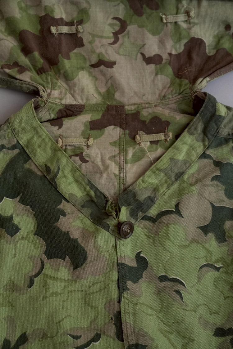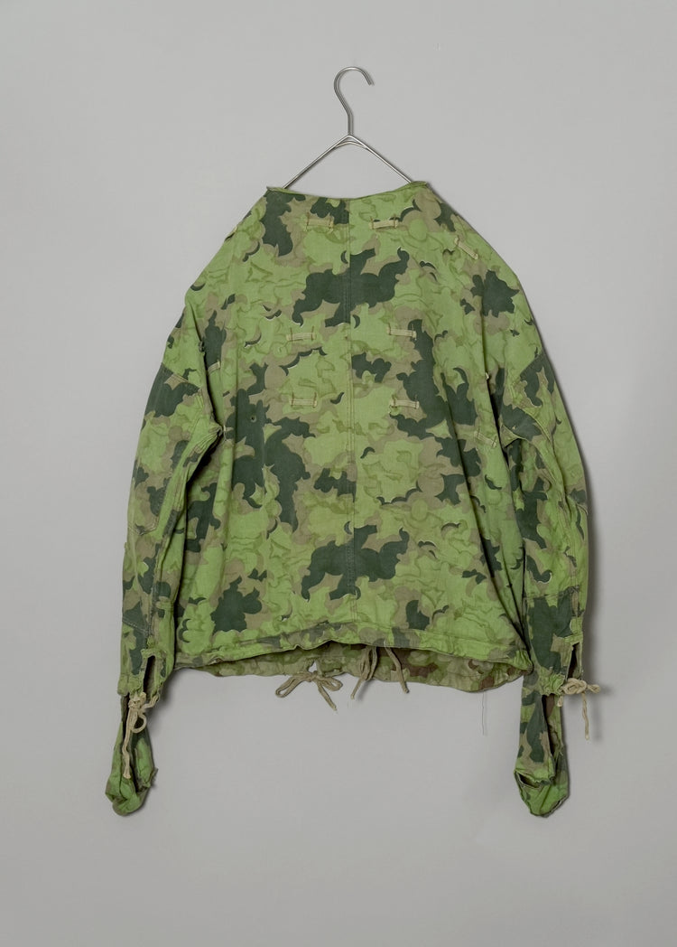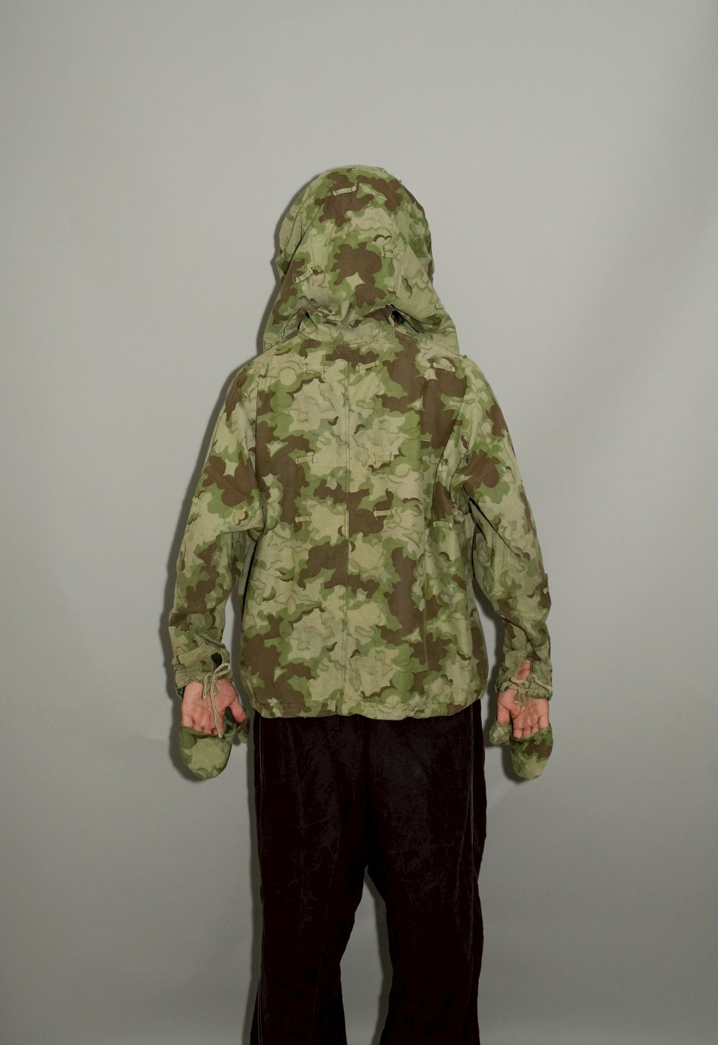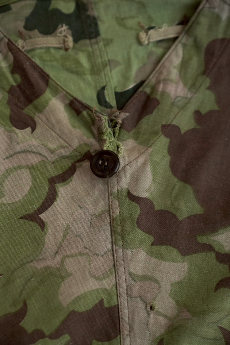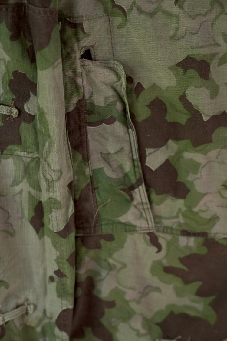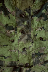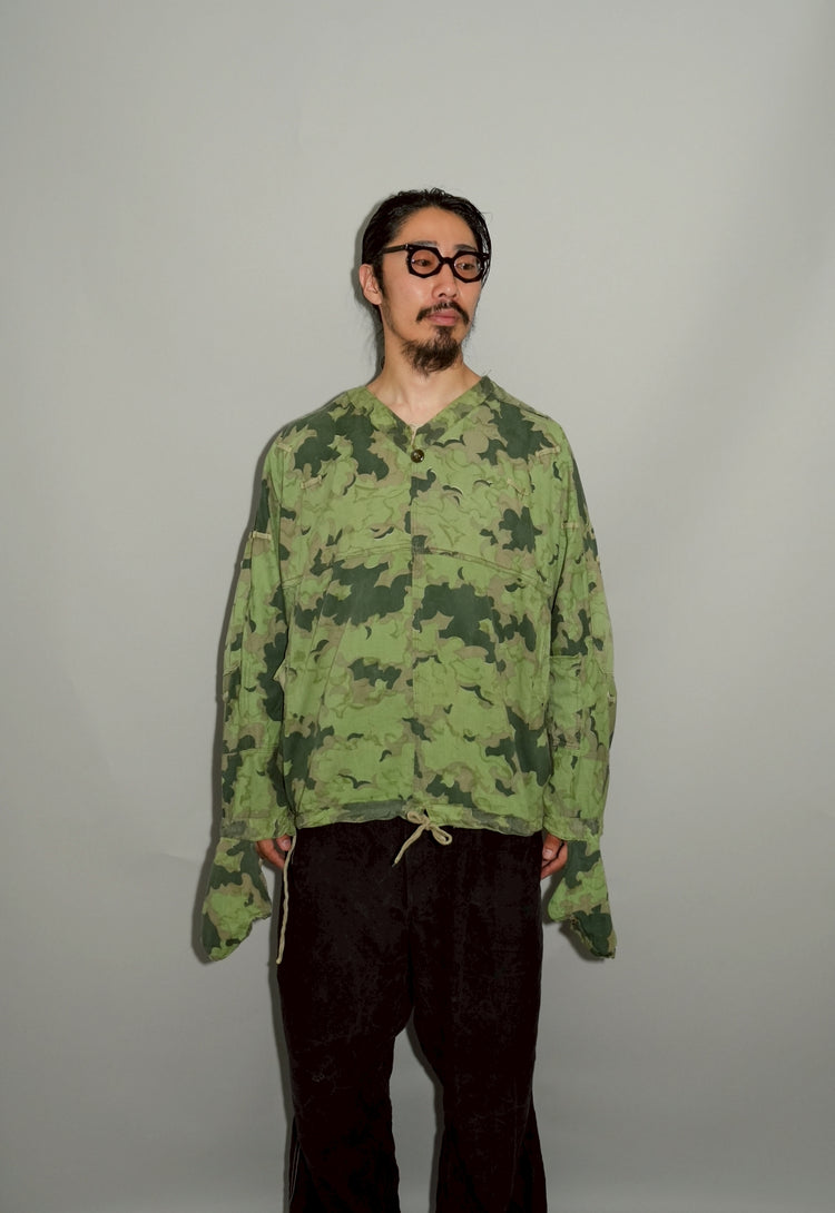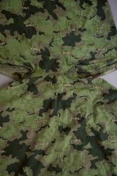 1950年代、チェコスロヴァキア軍によって採用された「クラウドカモフラージュ(Clouds camouflage)」は、ヨーロッパの迷彩史の中でも特異な存在として知られています。その名の通り、雲が漂うような有機的なパターンは、他国の直線的で幾何学的な迷彩柄とは一線を画す独自の美しさを持ち、今日ではコレクターやファッションデザイナーから高く評価されています。本品はそのクラウドカモを纏ったリバーシブルスモックで、フードとグローブが一体化した希少な仕様。数ある軍用被服の中でも特に資料性・造形美に優れた一点です。
