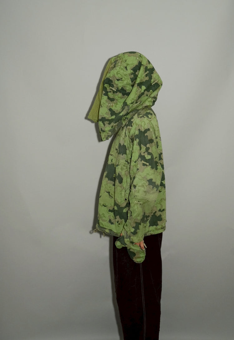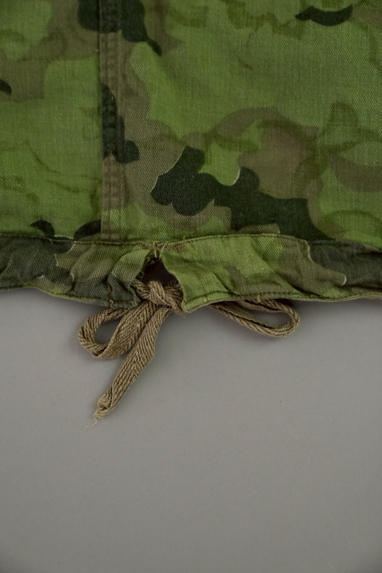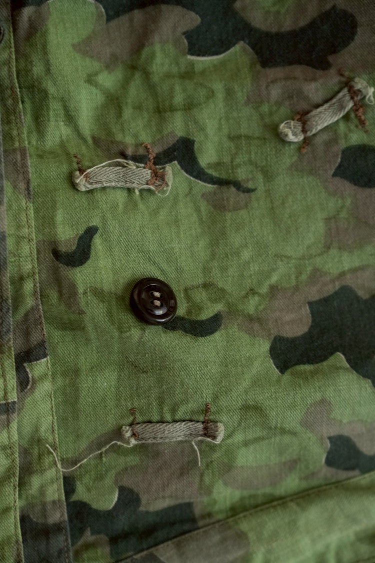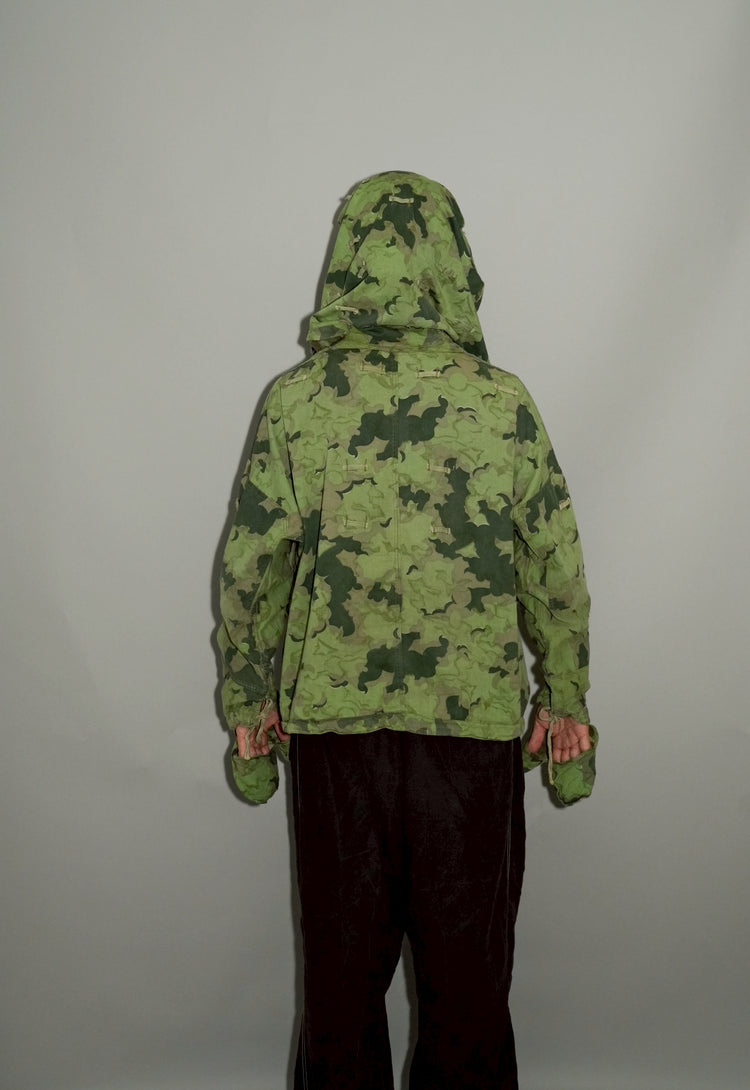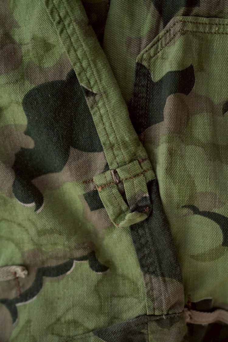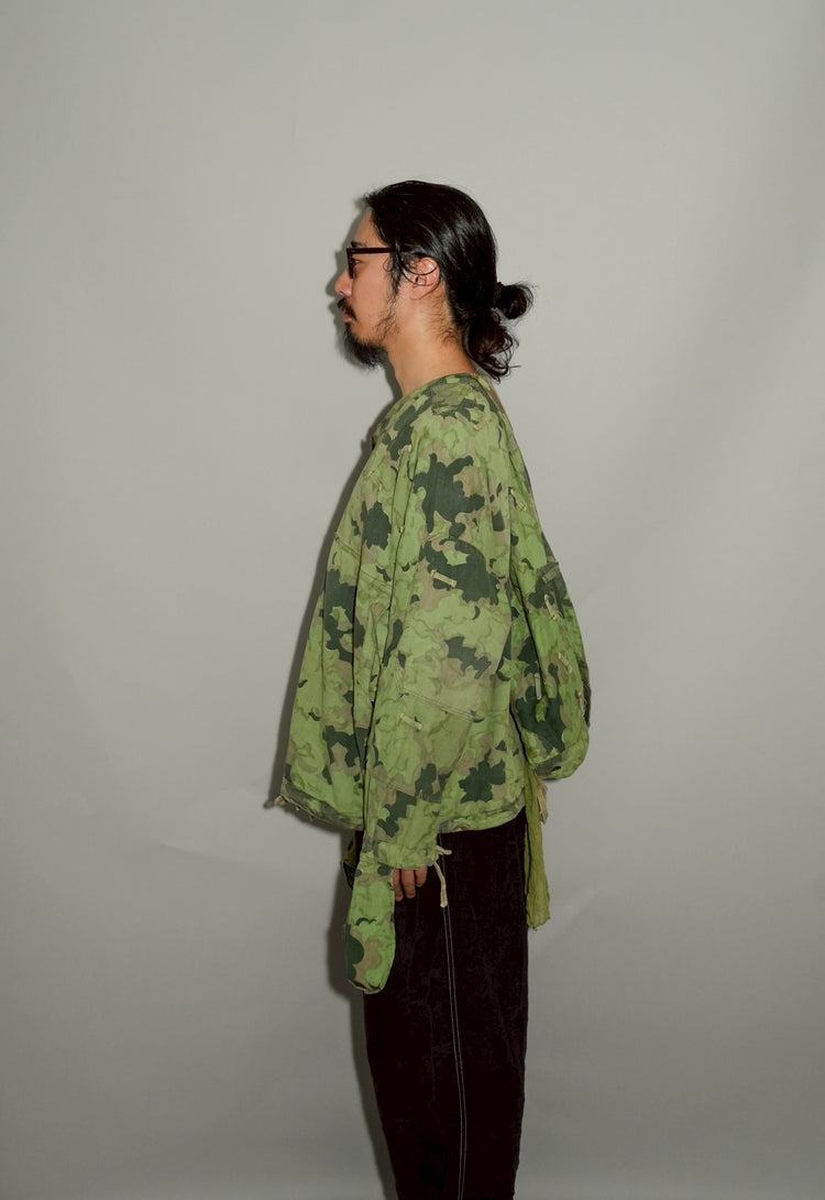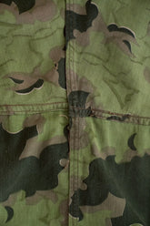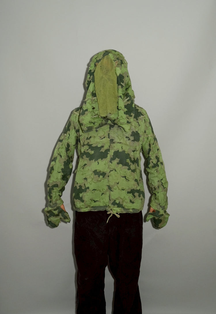 1950年代、チェコスロヴァキア軍によって採用された「クラウドカモフラージュ(Clouds camouflage)」は、ヨーロッパの迷彩史の中でも特異な存在として知られています。その名の通り、雲が漂うような有機的なパターンは、他国の直線的で幾何学的な迷彩柄とは一線を画す独自の美しさを持ち、今日ではコレクターやファッションデザイナーから高く評価されています。本品はそのクラウドカモを纏ったリバーシブルスモックで、フードとグローブが一体化した希少な仕様。数ある軍用被服の中でも特に資料性・造形美に優れた一点です。