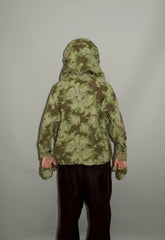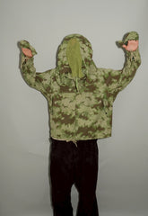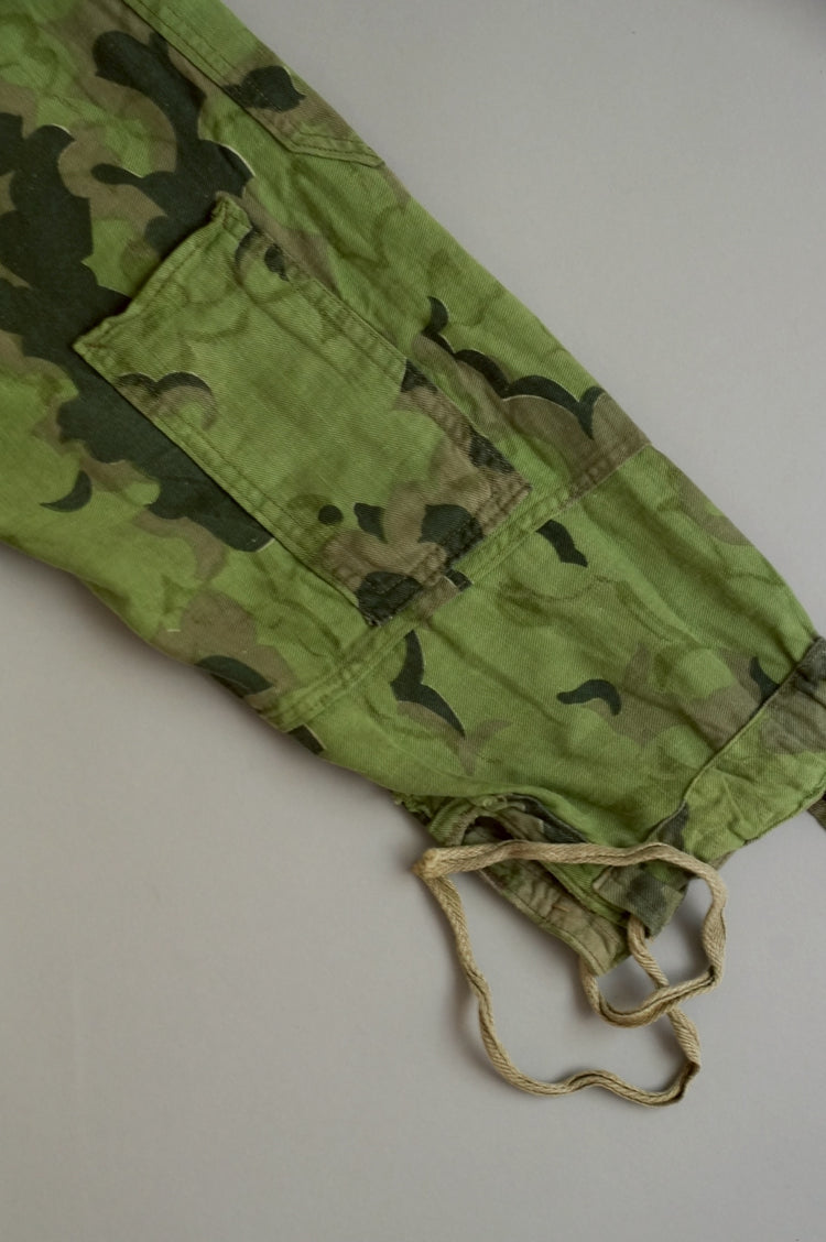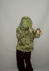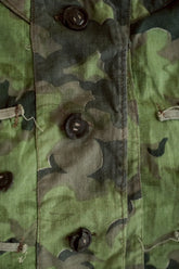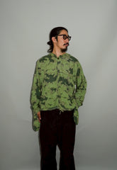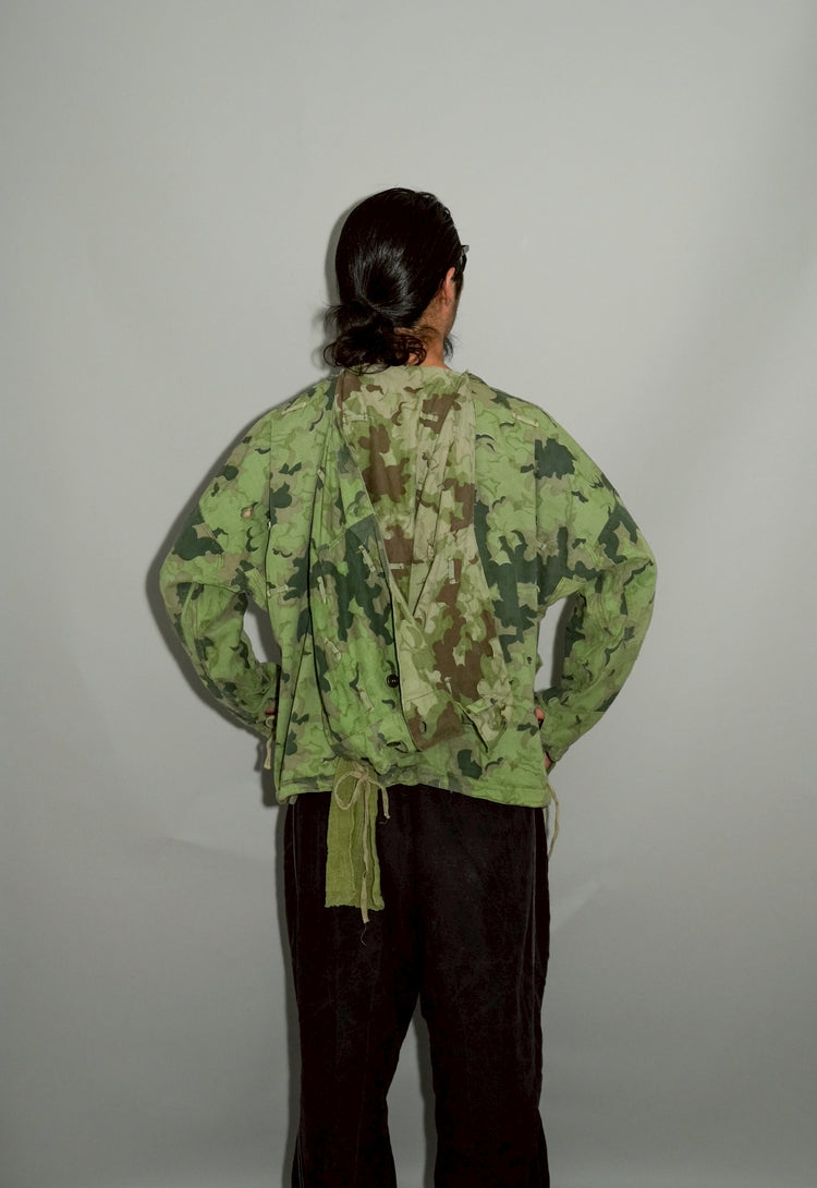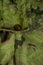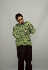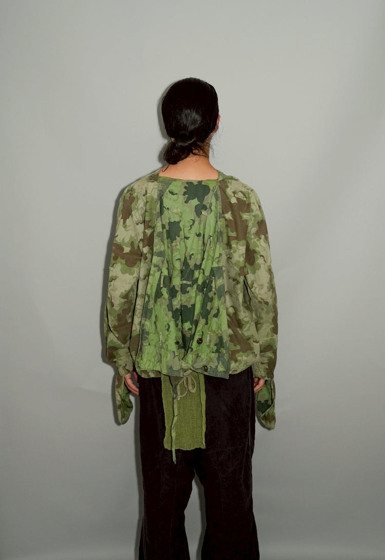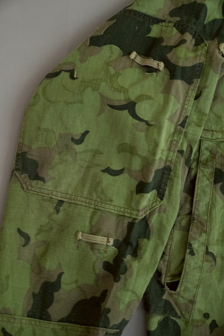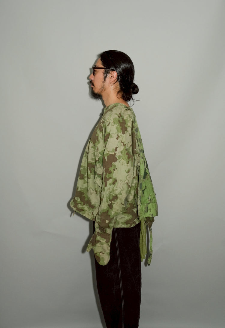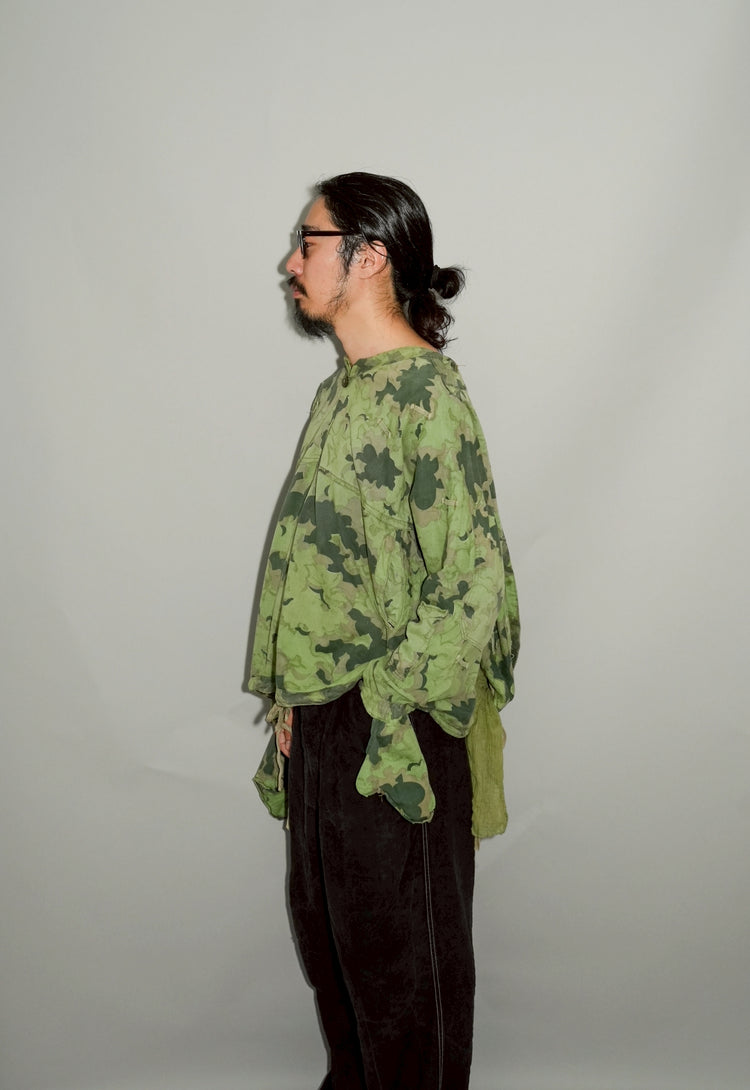 1950年代、チェコスロヴァキア軍によって採用された「クラウドカモフラージュ(Clouds camouflage)」は、ヨーロッパの迷彩史の中でも特異な存在として知られています。その名の通り、雲が漂うような有機的なパターンは、他国の直線的で幾何学的な迷彩柄とは一線を画す独自の美しさを持ち、今日ではコレクターやファッションデザイナーから高く評価されています。本品はそのクラウドカモを纏ったリバーシブルスモックで、フードとグローブが一体化した希少な仕様。数ある軍用被服の中でも特に資料性・造形美に優れた一点です。