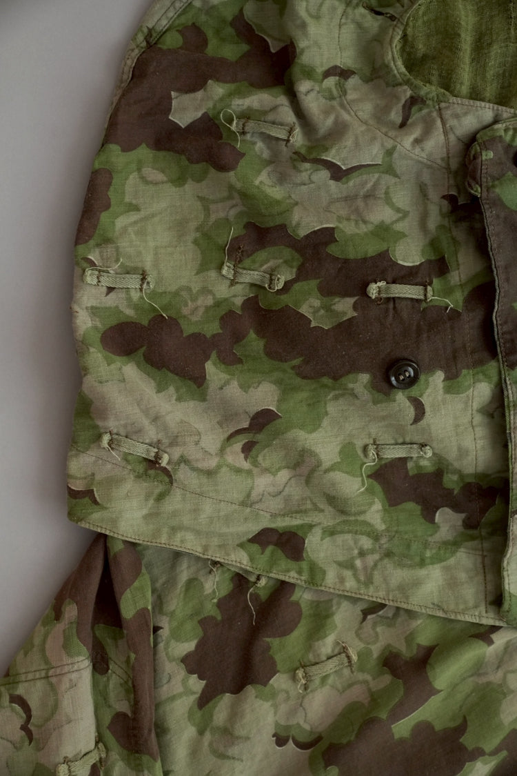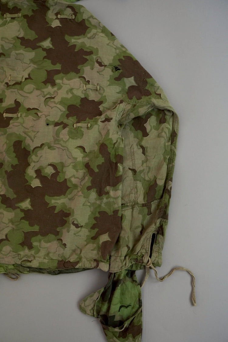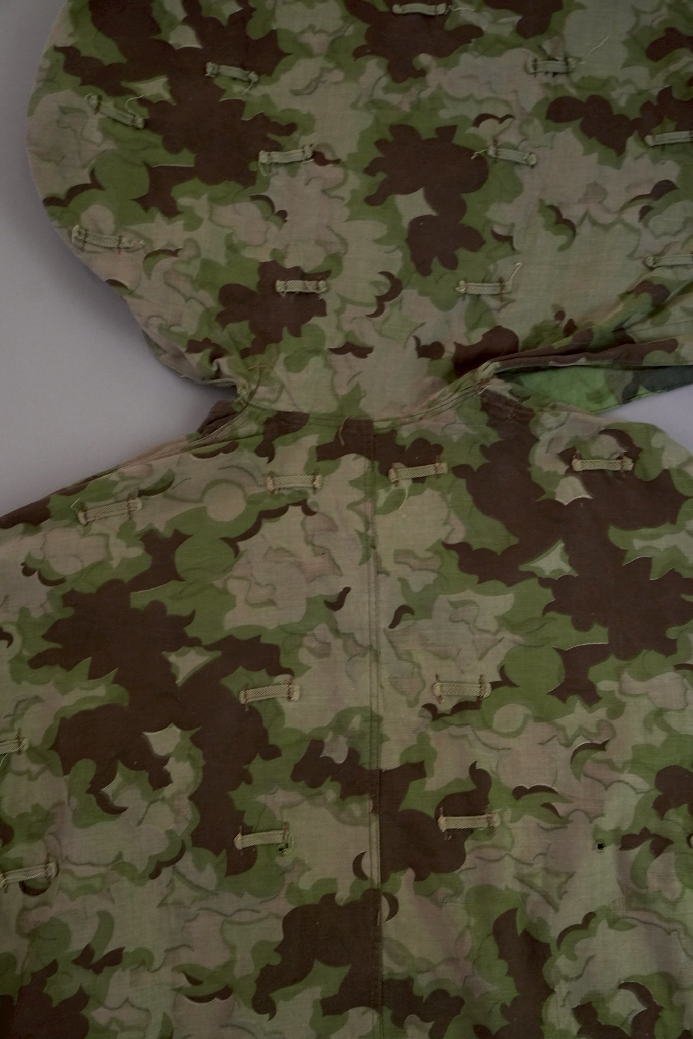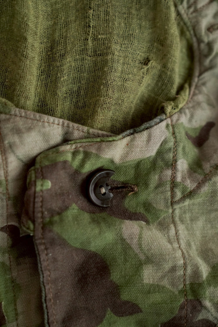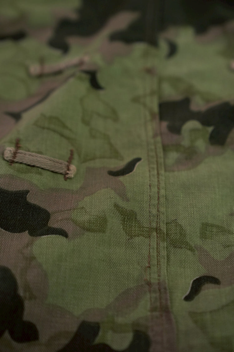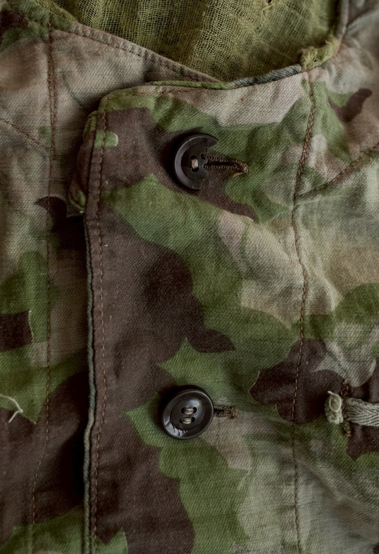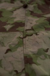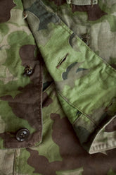 まず注目すべきは、このアイテムが「リバーシブル仕様」であること。片面は淡いトーンのクラウドカモフラージュ、もう一方はより濃淡の強い配色が施されており、戦場や季節、環境に応じて使い分けられるよう設計されています。当時の兵士たちは森林、雪原、岩場といった多様なフィールドでの作戦を余儀なくされており、その環境適応力を高めるためにリバーシブル構造は非常に実用的でした。現代の目で見ても、表裏で印象が大きく変わるため、スタイリングにおいても多彩な表情を楽しめることは特筆すべき魅力でしょう。
