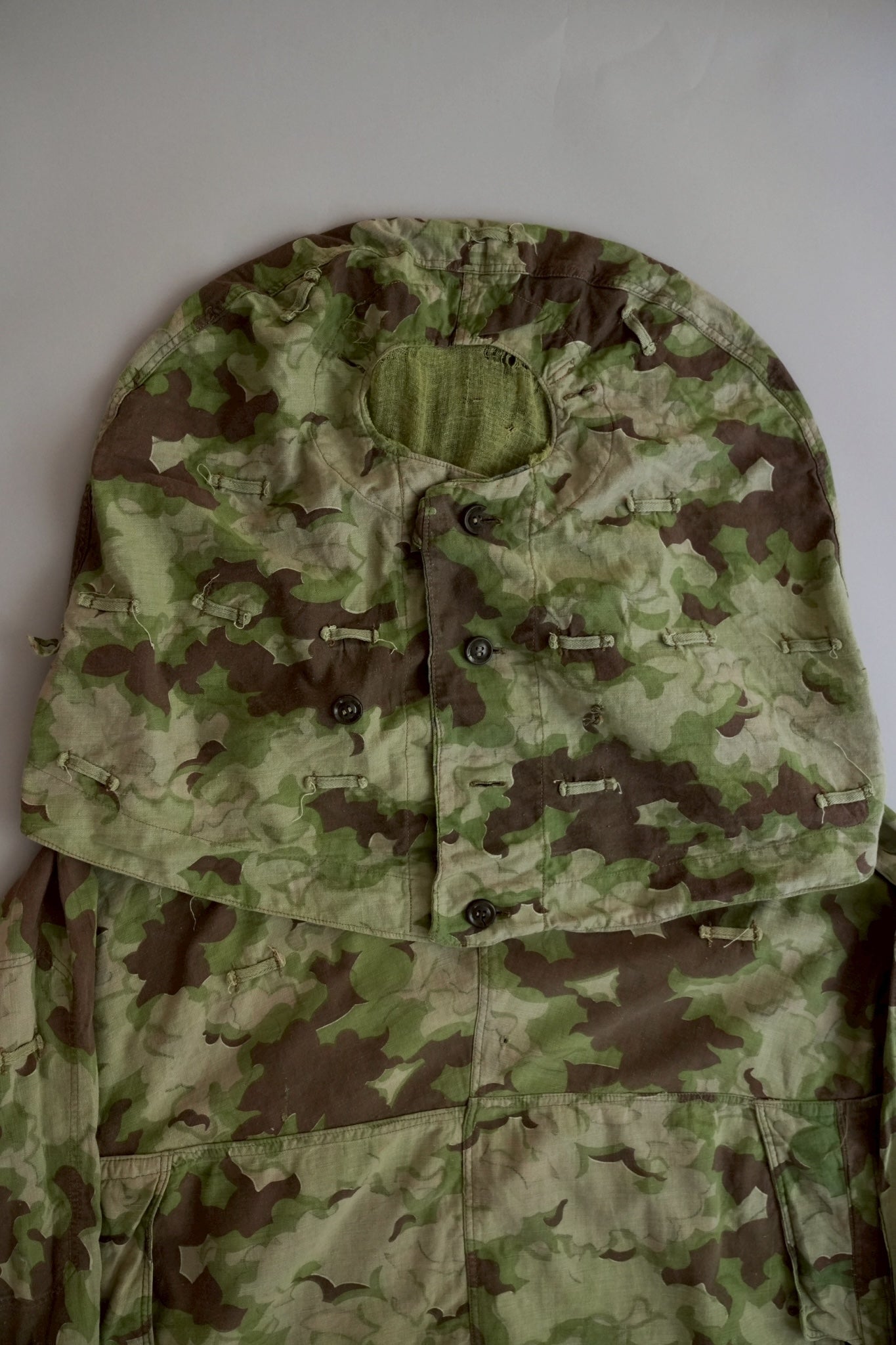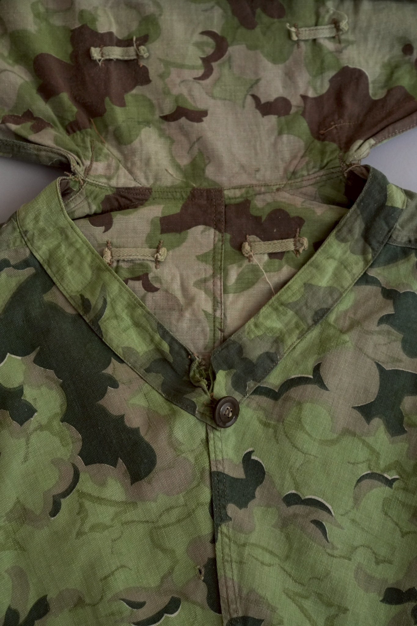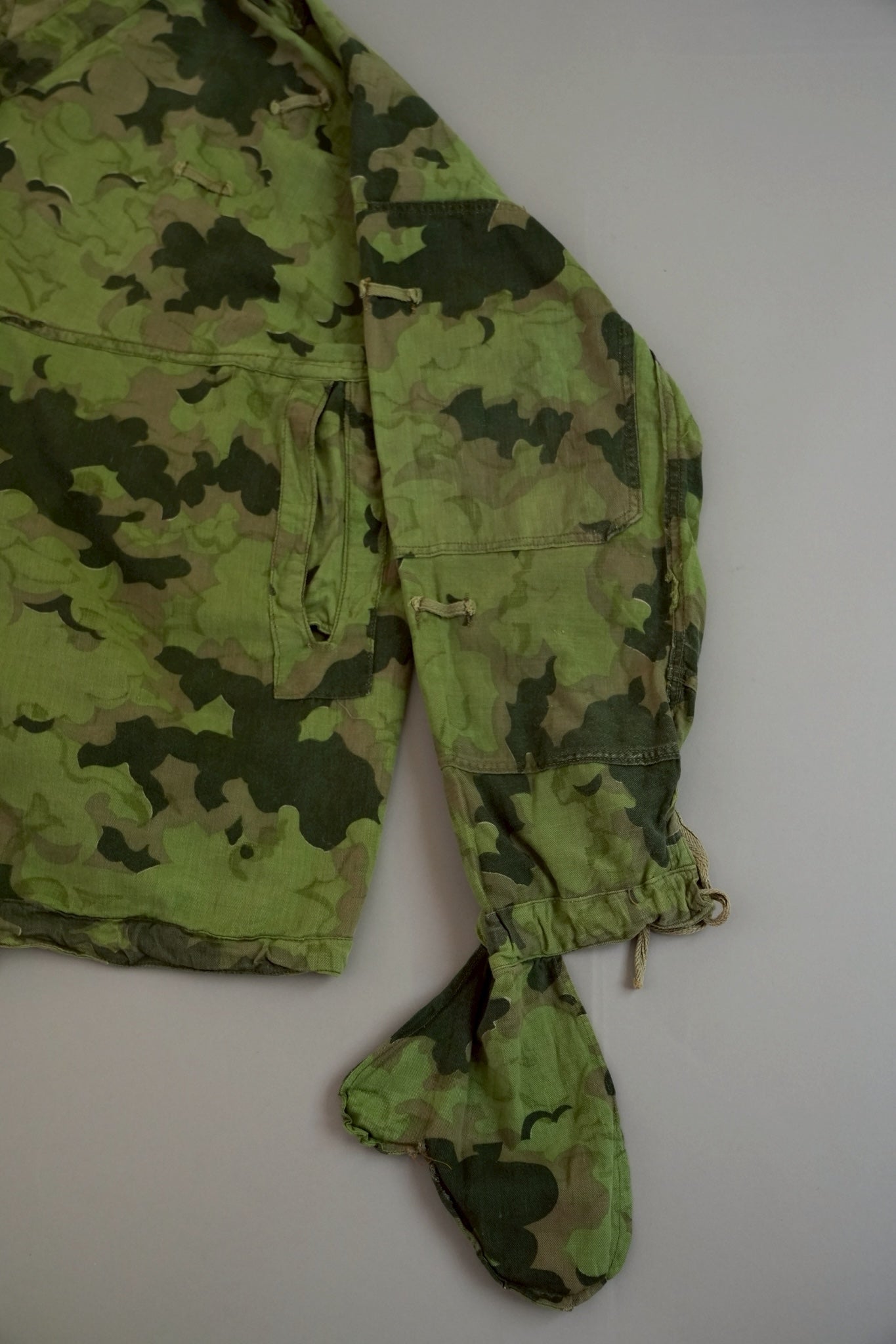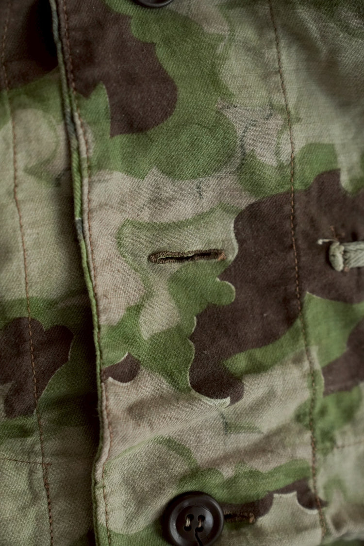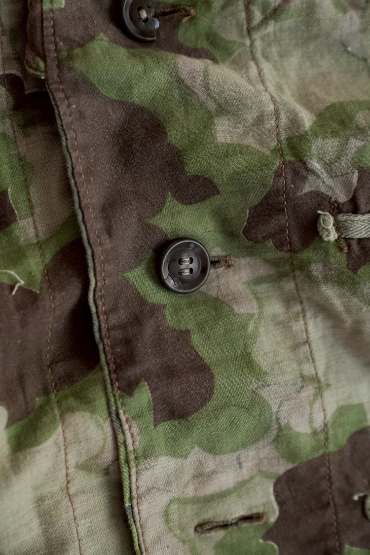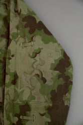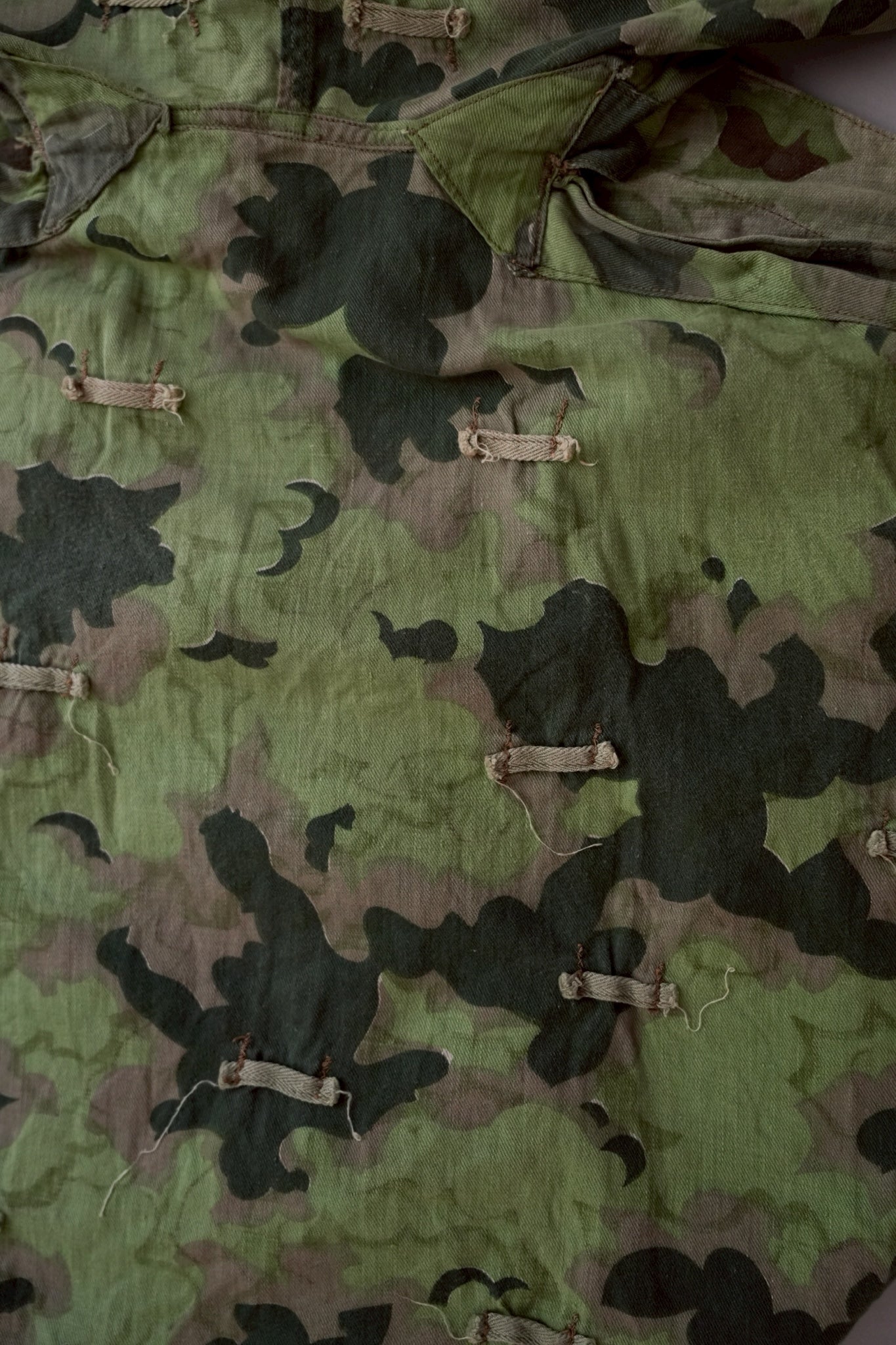 まず注目すべきは、このアイテムが「リバーシブル仕様」であること。片面は淡いトーンのクラウドカモフラージュ、もう一方はより濃淡の強い配色が施されており、戦場や季節、環境に応じて使い分けられるよう設計されています。当時の兵士たちは森林、雪原、岩場といった多様なフィールドでの作戦を余儀なくされており、その環境適応力を高めるためにリバーシブル構造は非常に実用的でした。現代の目で見ても、表裏で印象が大きく変わるため、スタイリングにおいても多彩な表情を楽しめることは特筆すべき魅力でしょう。