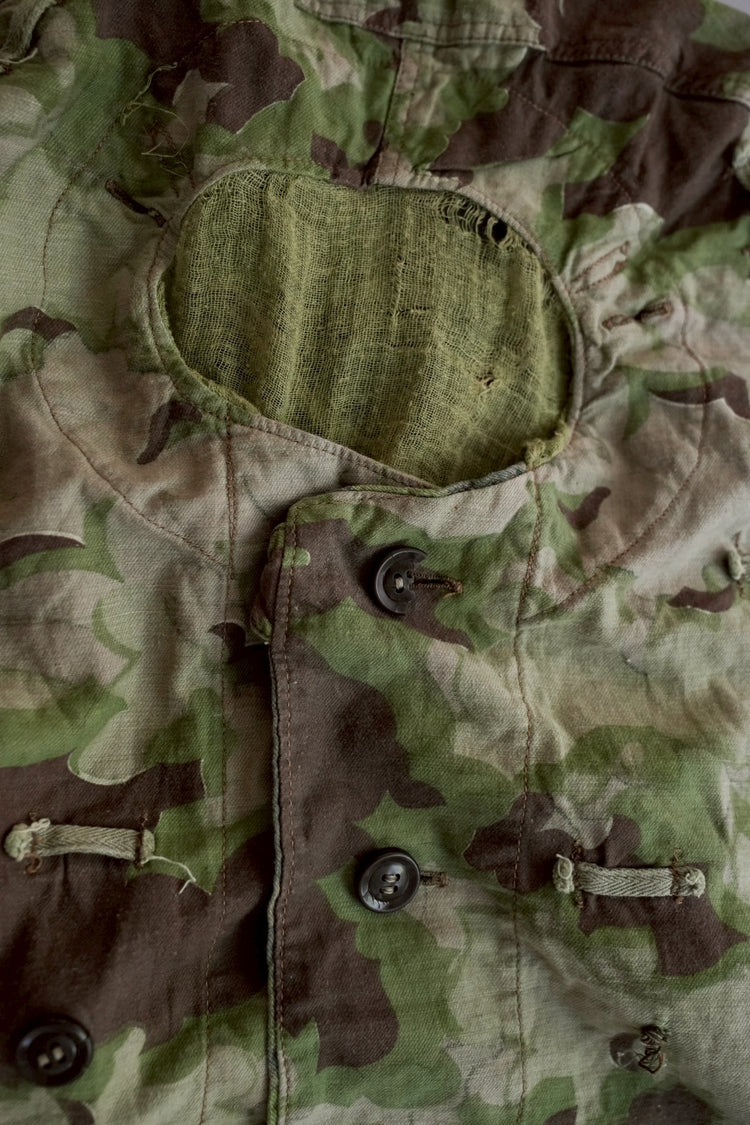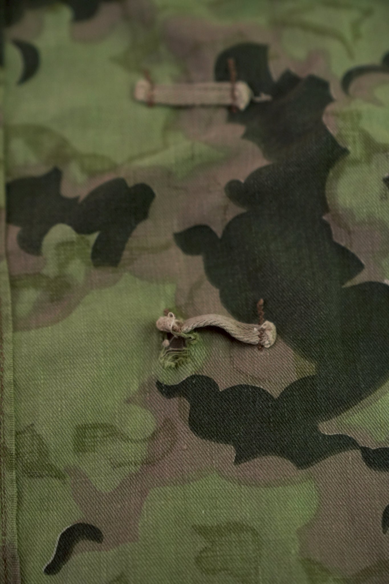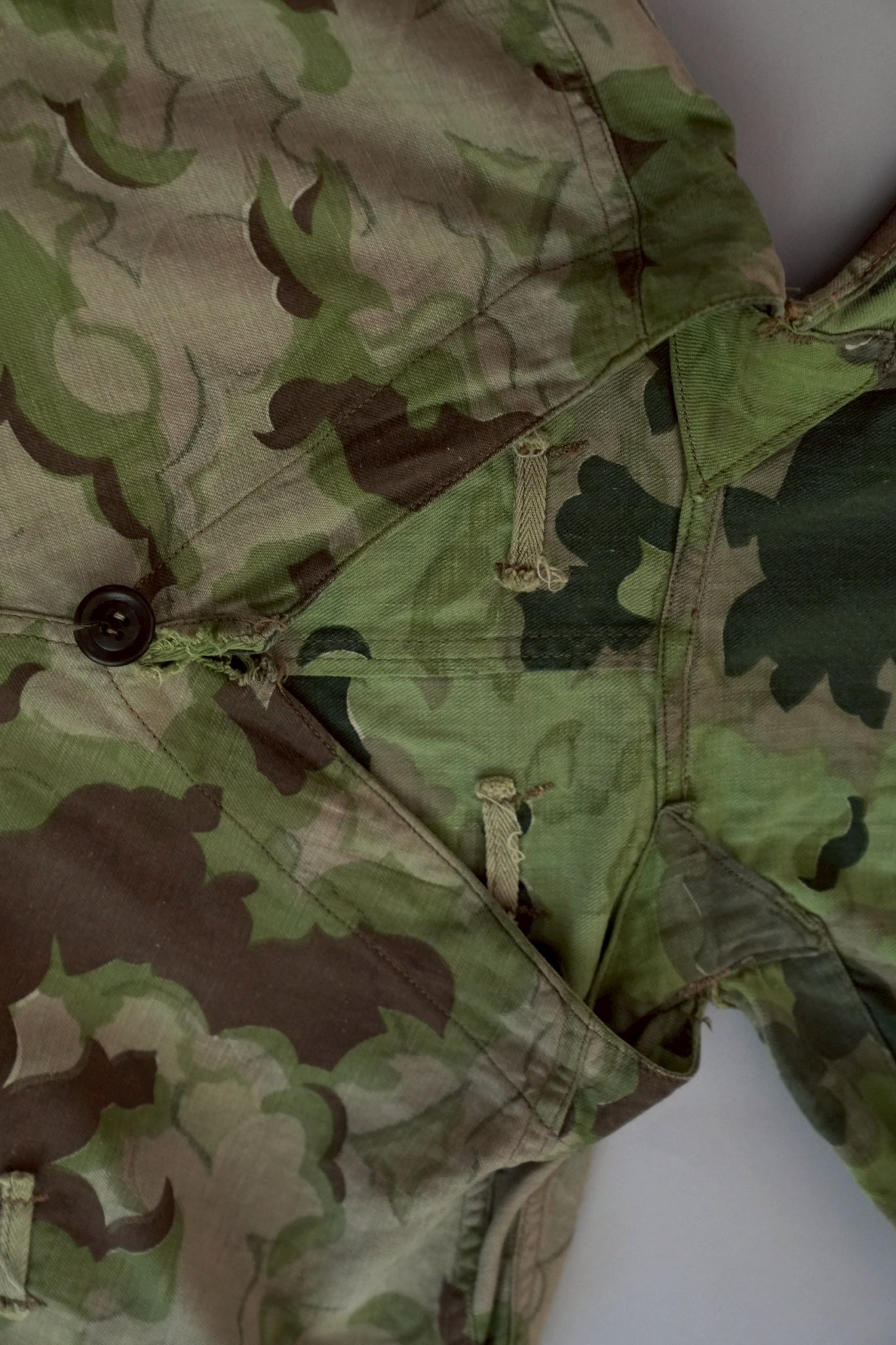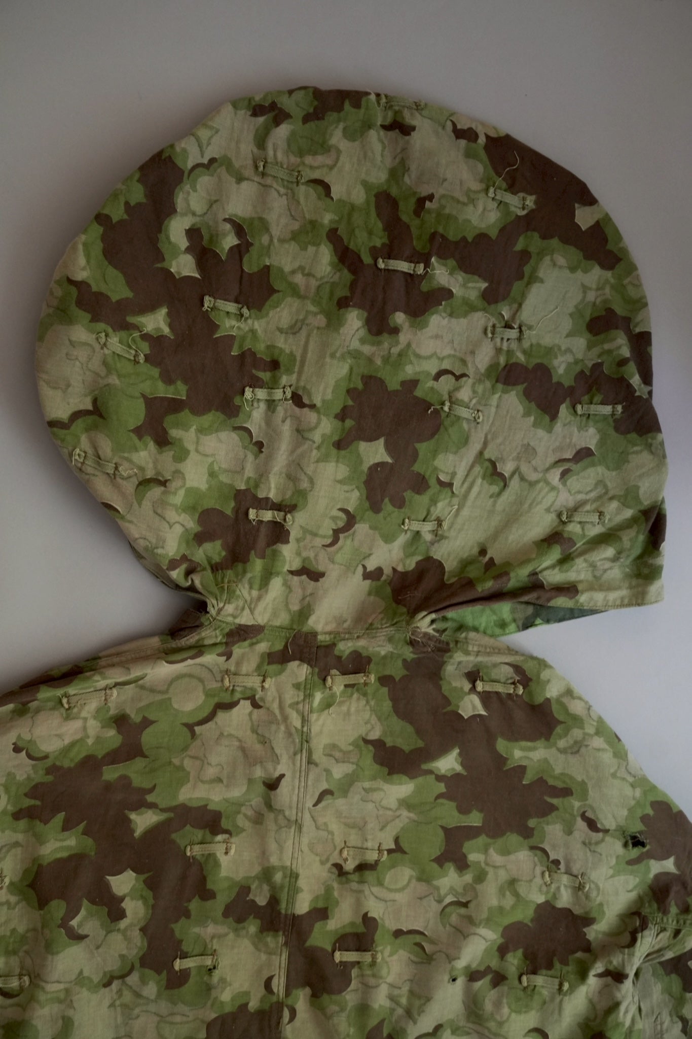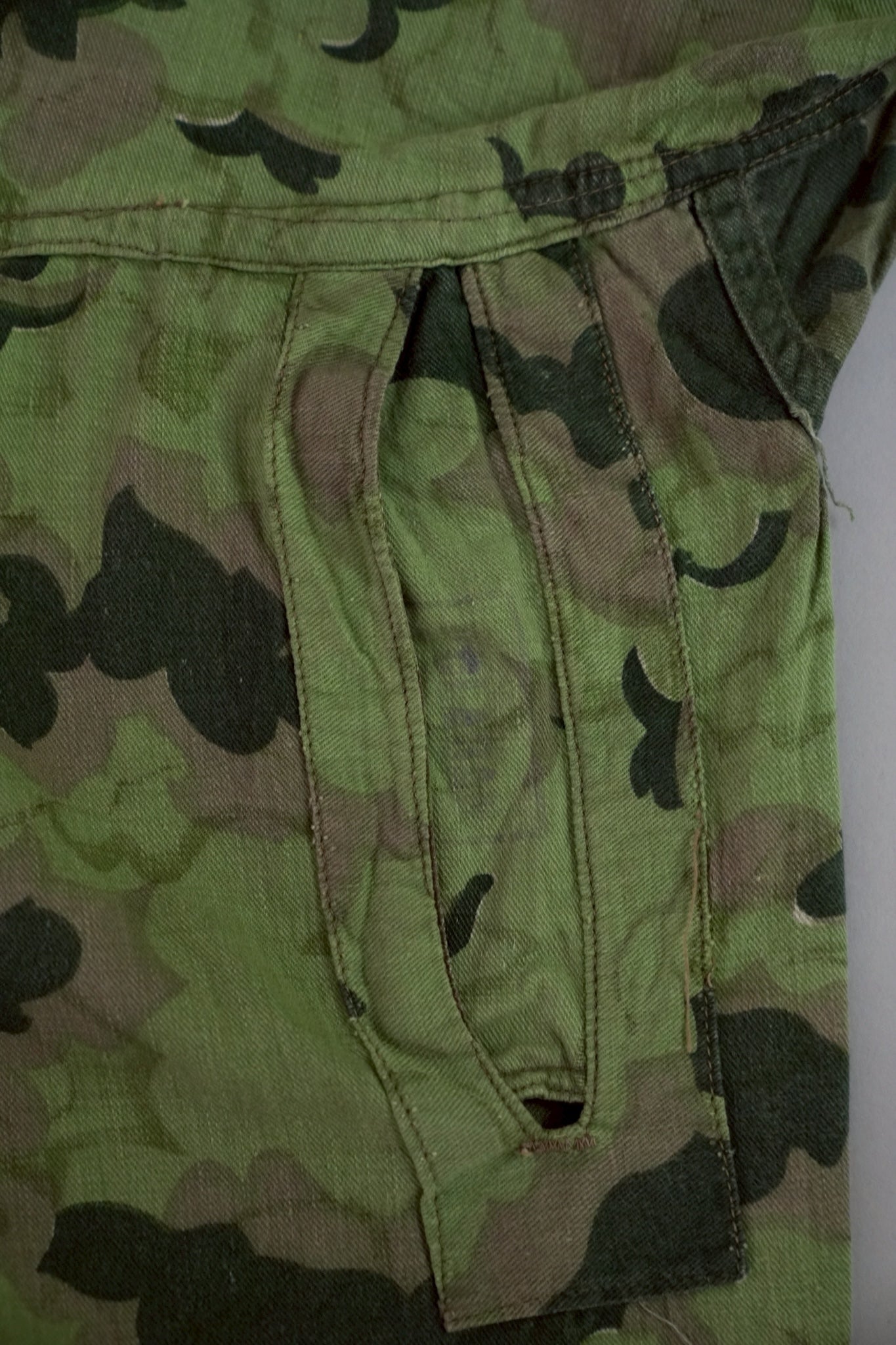 まず注目すべきは、このアイテムが「リバーシブル仕様」であること。片面は淡いトーンのクラウドカモフラージュ、もう一方はより濃淡の強い配色が施されており、戦場や季節、環境に応じて使い分けられるよう設計されています。当時の兵士たちは森林、雪原、岩場といった多様なフィールドでの作戦を余儀なくされており、その環境適応力を高めるためにリバーシブル構造は非常に実用的でした。現代の目で見ても、表裏で印象が大きく変わるため、スタイリングにおいても多彩な表情を楽しめることは特筆すべき魅力でしょう。