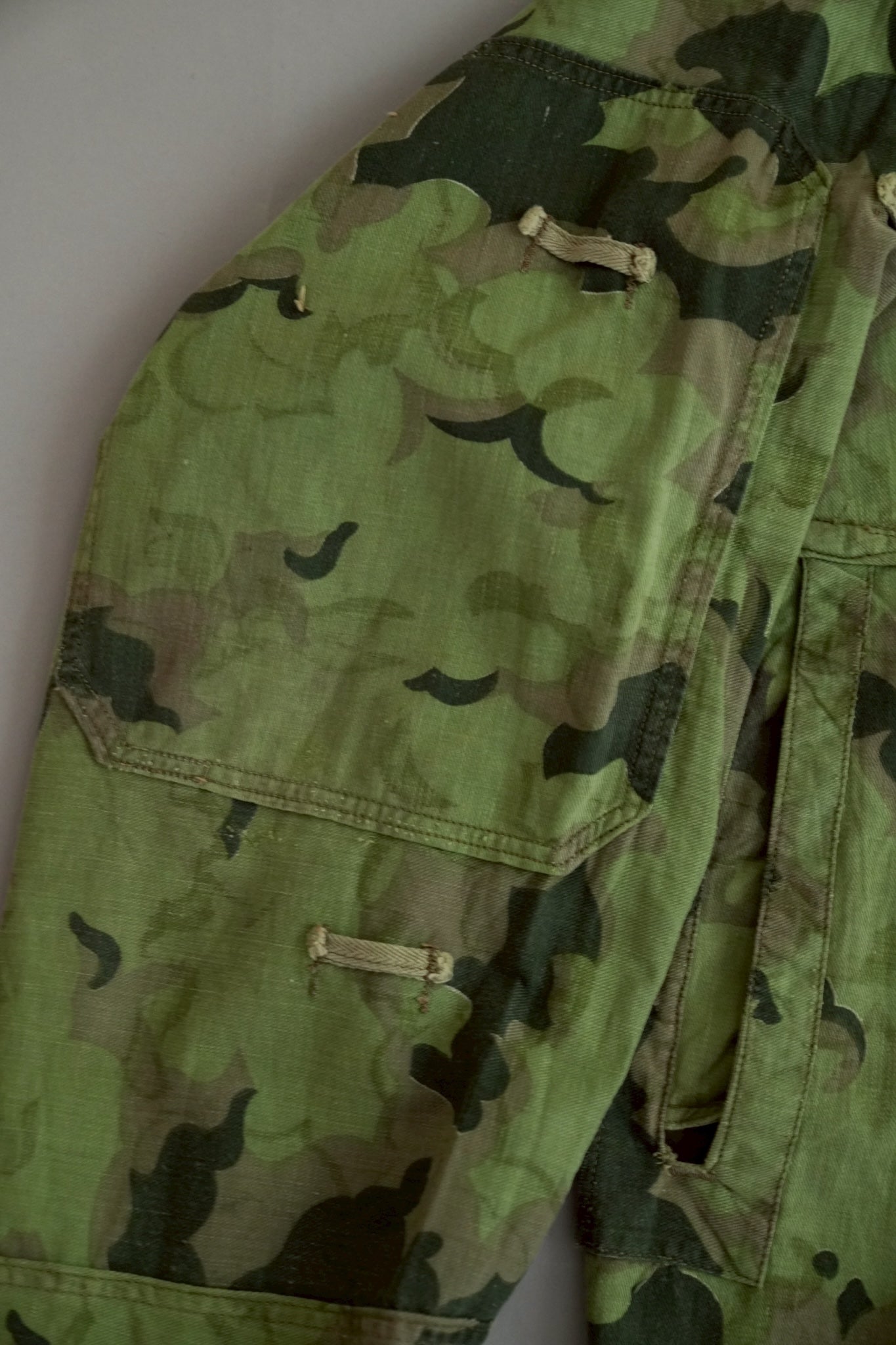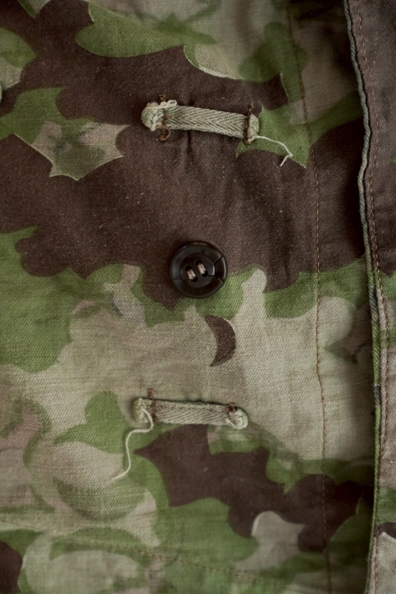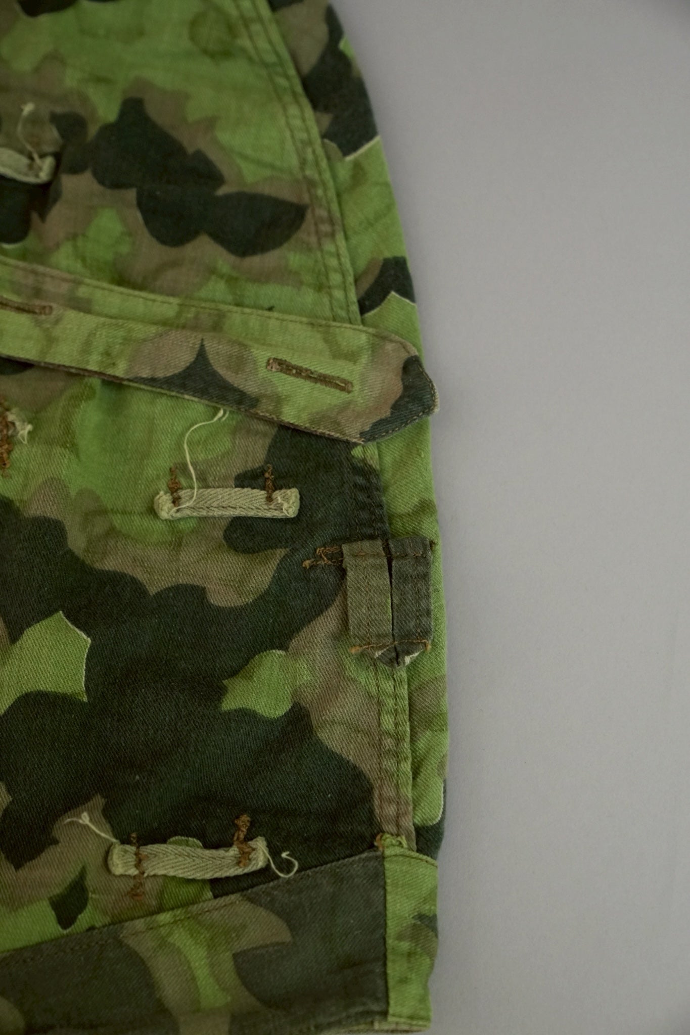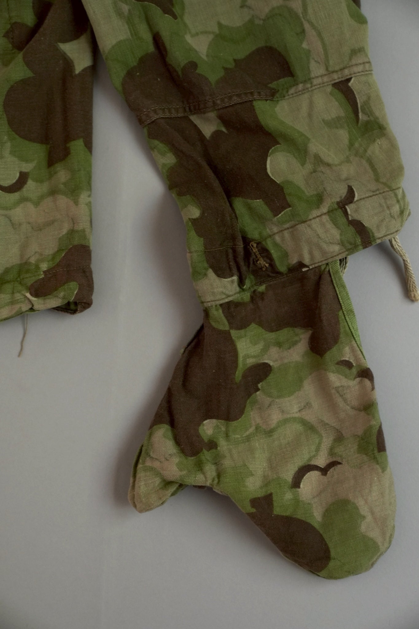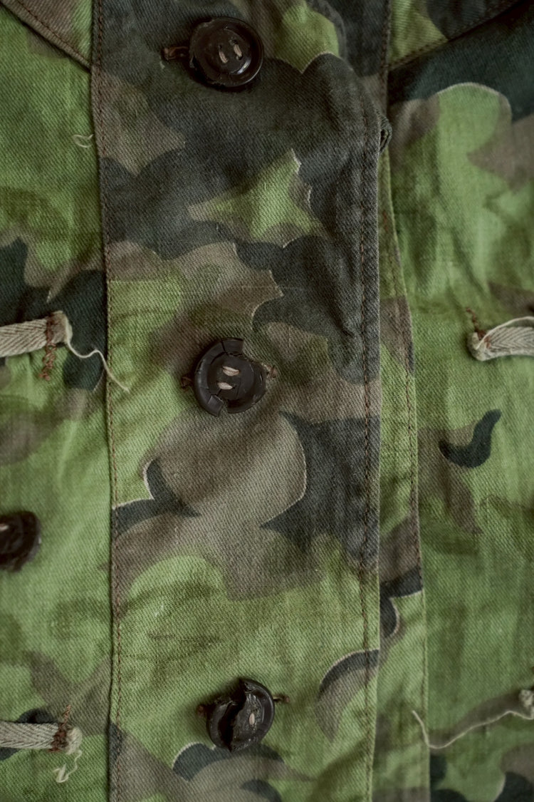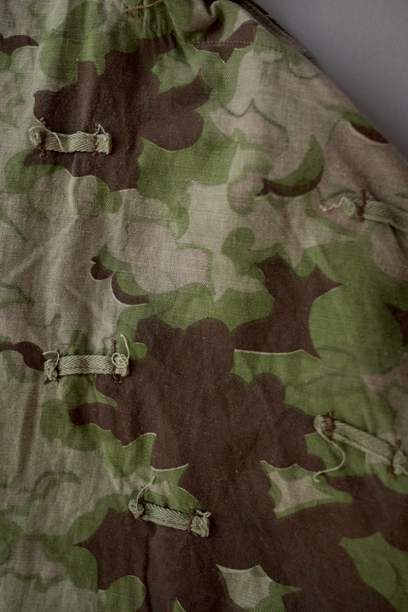 まず注目すべきは、このアイテムが「リバーシブル仕様」であること。片面は淡いトーンのクラウドカモフラージュ、もう一方はより濃淡の強い配色が施されており、戦場や季節、環境に応じて使い分けられるよう設計されています。当時の兵士たちは森林、雪原、岩場といった多様なフィールドでの作戦を余儀なくされており、その環境適応力を高めるためにリバーシブル構造は非常に実用的でした。現代の目で見ても、表裏で印象が大きく変わるため、スタイリングにおいても多彩な表情を楽しめることは特筆すべき魅力でしょう。