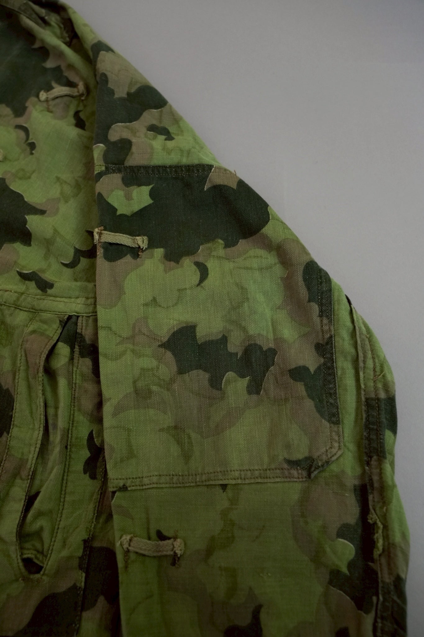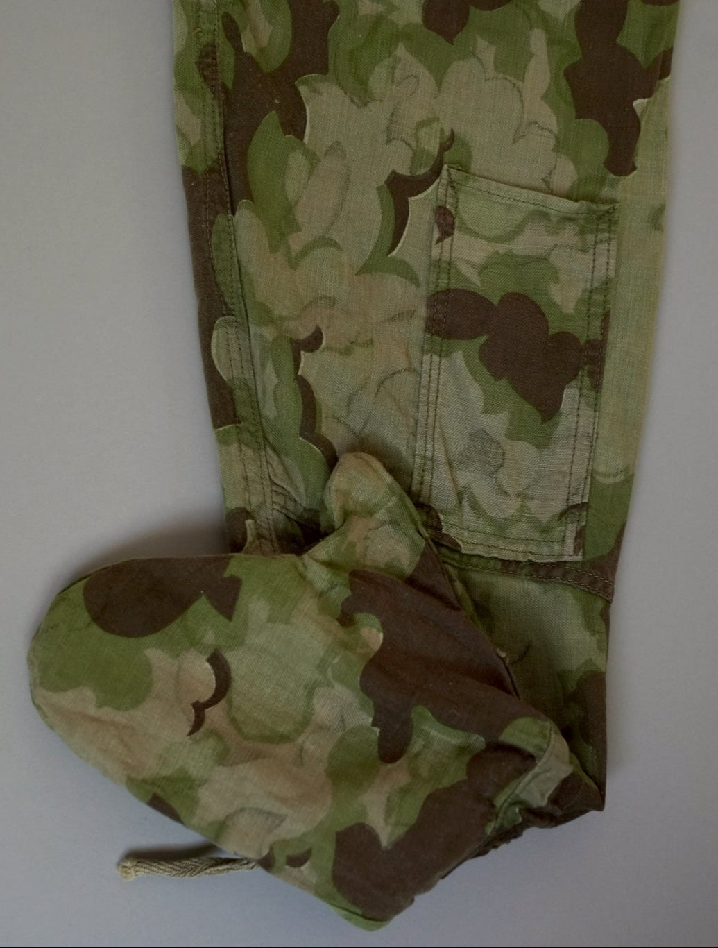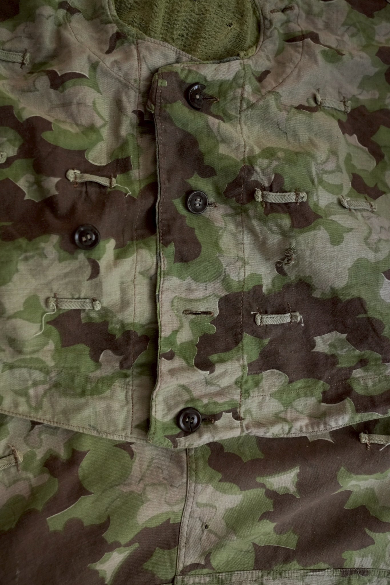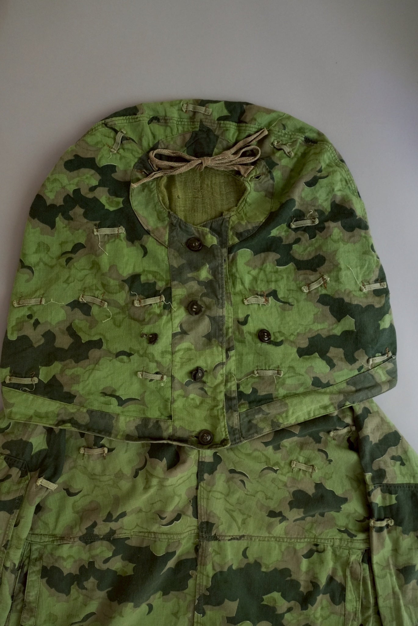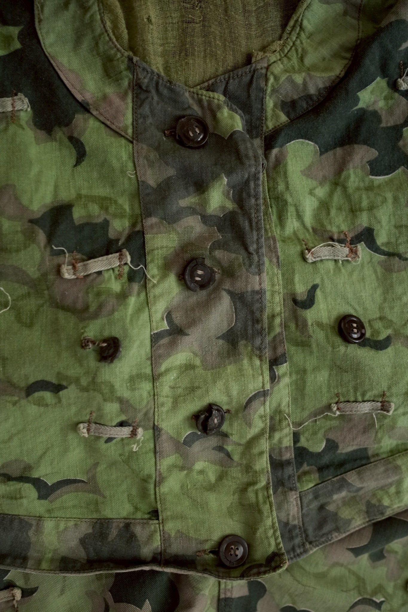 まず注目すべきは、このアイテムが「リバーシブル仕様」であること。片面は淡いトーンのクラウドカモフラージュ、もう一方はより濃淡の強い配色が施されており、戦場や季節、環境に応じて使い分けられるよう設計されています。当時の兵士たちは森林、雪原、岩場といった多様なフィールドでの作戦を余儀なくされており、その環境適応力を高めるためにリバーシブル構造は非常に実用的でした。現代の目で見ても、表裏で印象が大きく変わるため、スタイリングにおいても多彩な表情を楽しめることは特筆すべき魅力でしょう。