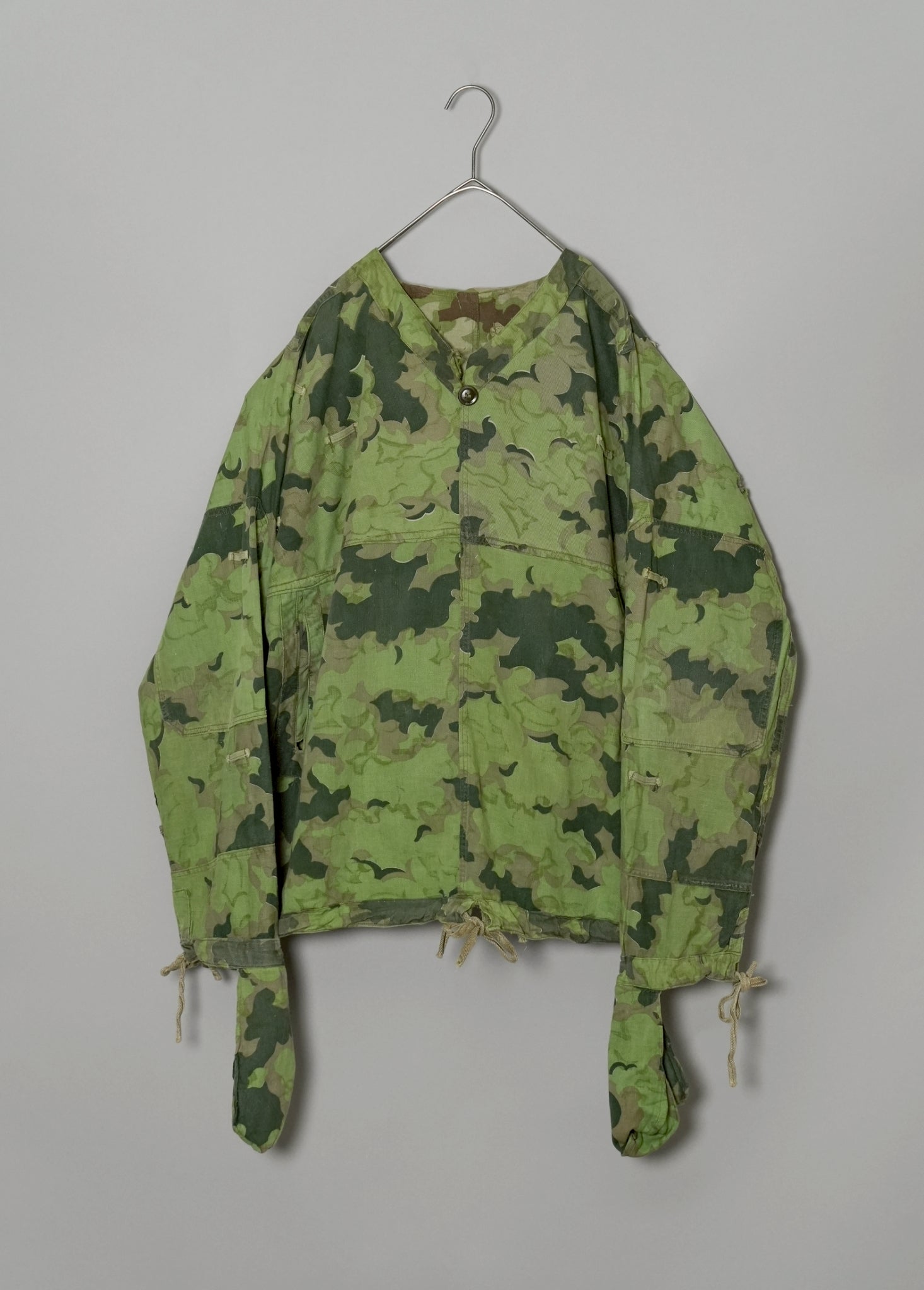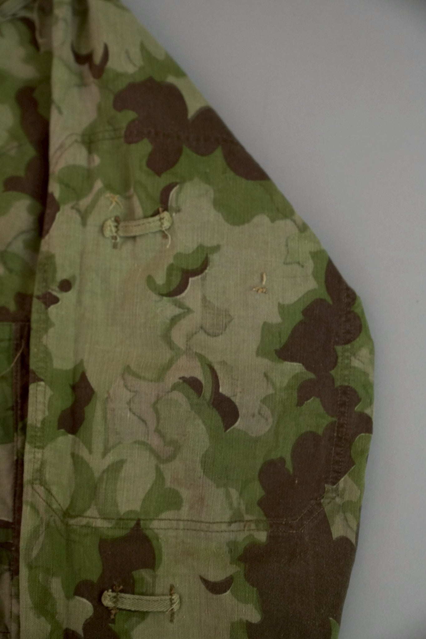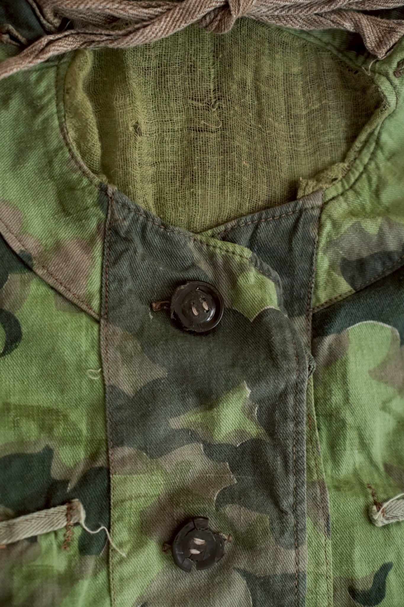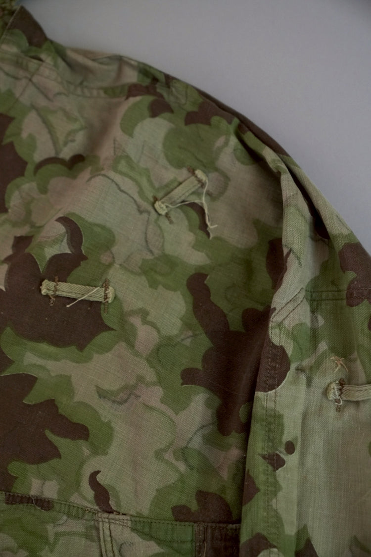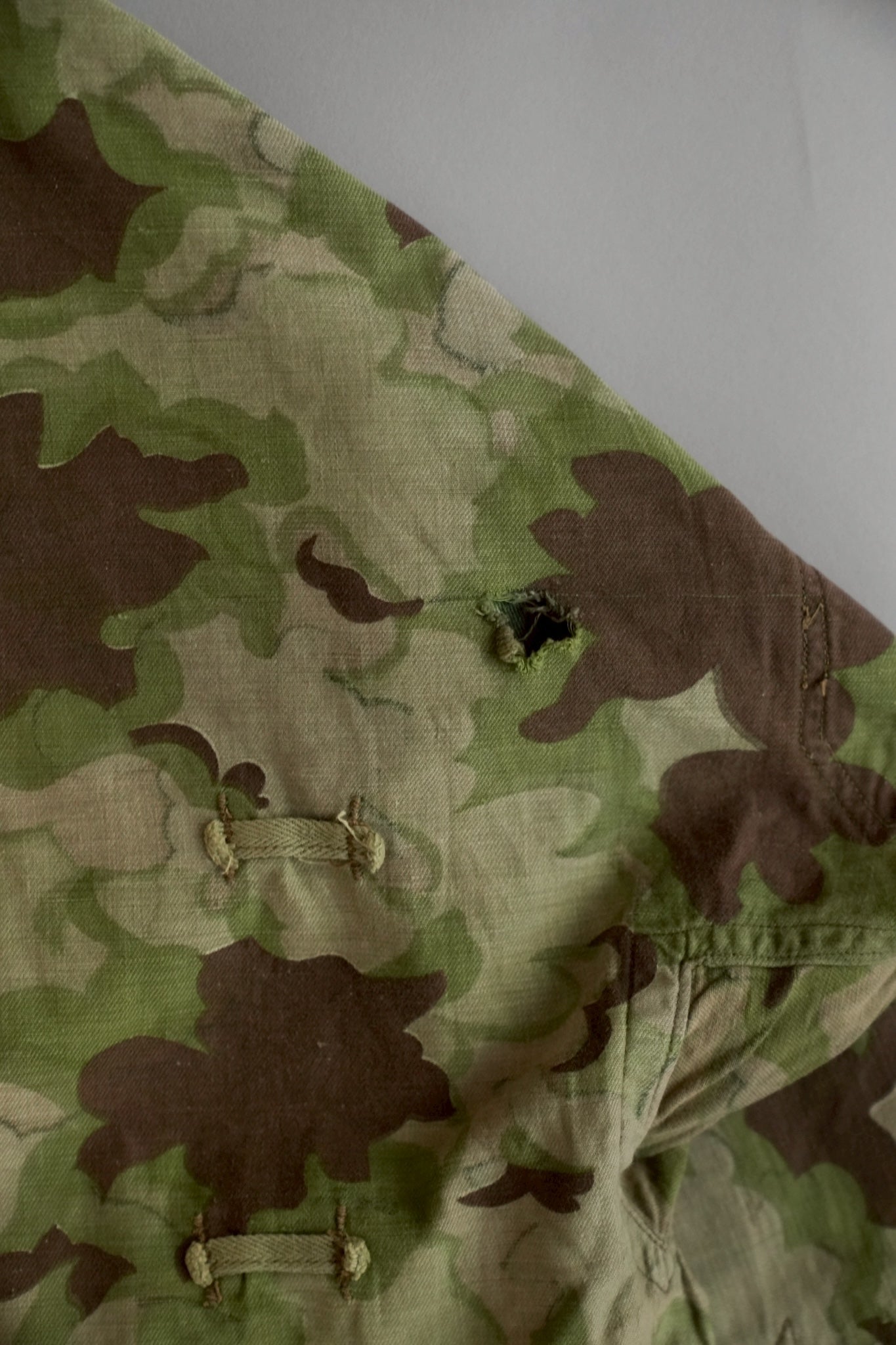 まず注目すべきは、このアイテムが「リバーシブル仕様」であること。片面は淡いトーンのクラウドカモフラージュ、もう一方はより濃淡の強い配色が施されており、戦場や季節、環境に応じて使い分けられるよう設計されています。当時の兵士たちは森林、雪原、岩場といった多様なフィールドでの作戦を余儀なくされており、その環境適応力を高めるためにリバーシブル構造は非常に実用的でした。現代の目で見ても、表裏で印象が大きく変わるため、スタイリングにおいても多彩な表情を楽しめることは特筆すべき魅力でしょう。