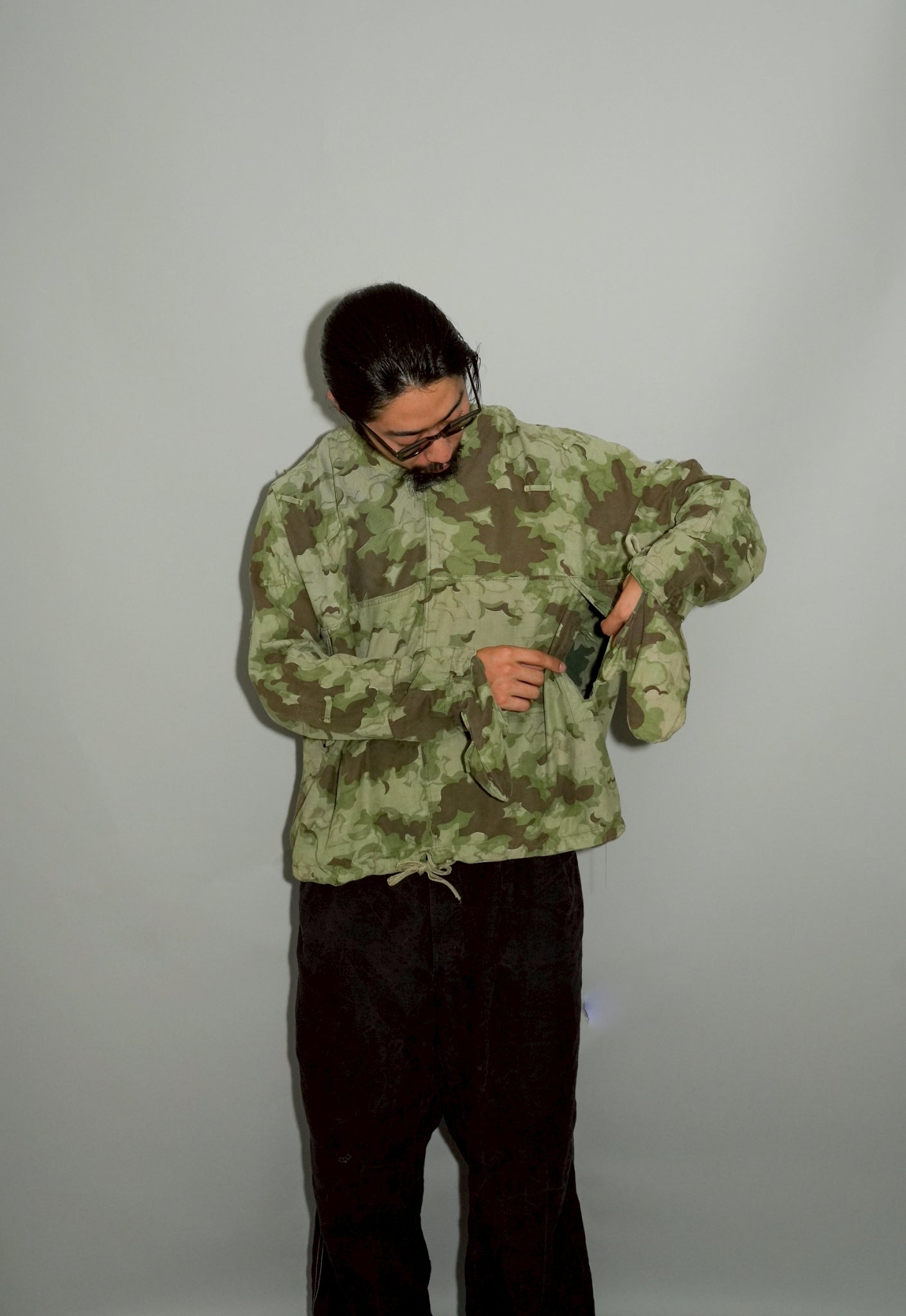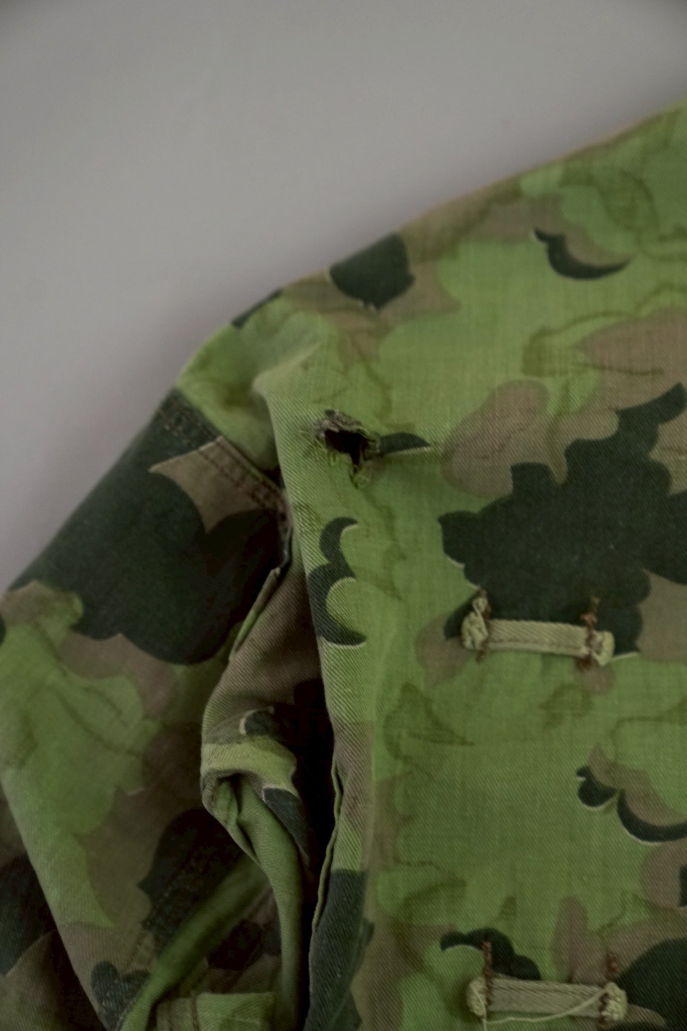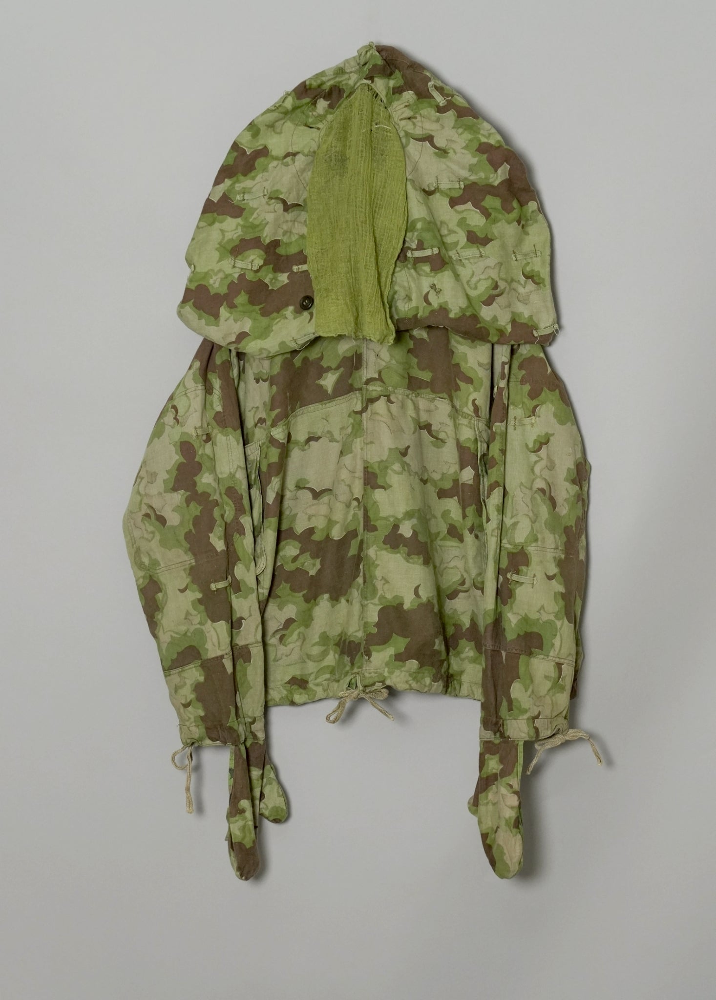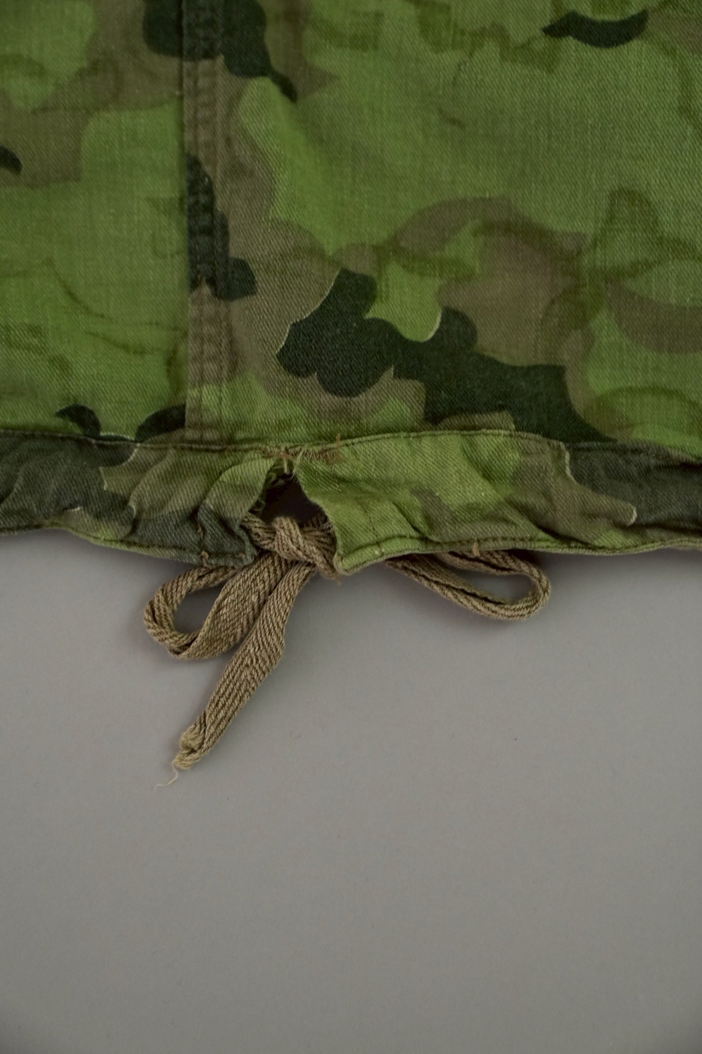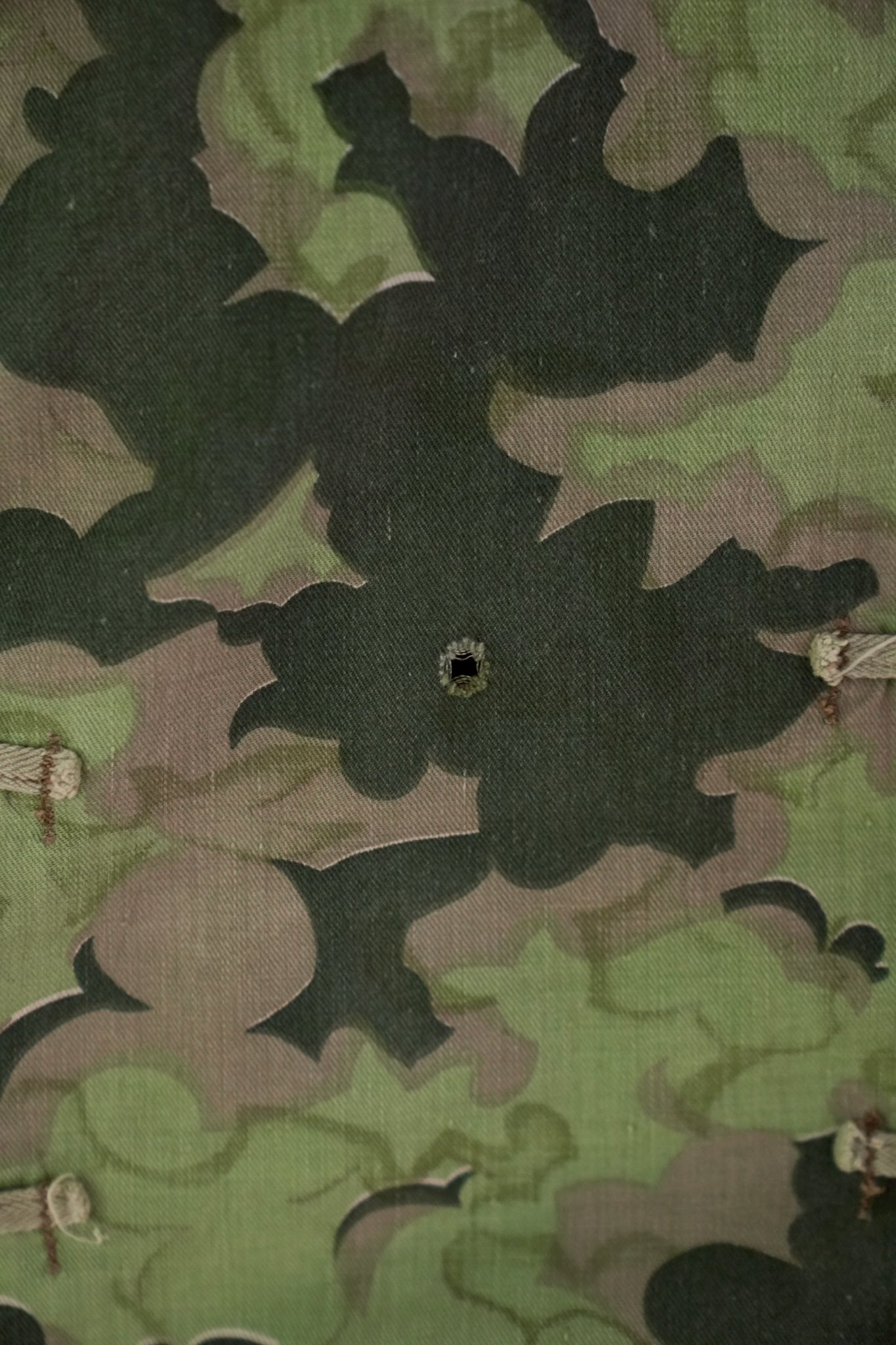 まず注目すべきは、このアイテムが「リバーシブル仕様」であること。片面は淡いトーンのクラウドカモフラージュ、もう一方はより濃淡の強い配色が施されており、戦場や季節、環境に応じて使い分けられるよう設計されています。当時の兵士たちは森林、雪原、岩場といった多様なフィールドでの作戦を余儀なくされており、その環境適応力を高めるためにリバーシブル構造は非常に実用的でした。現代の目で見ても、表裏で印象が大きく変わるため、スタイリングにおいても多彩な表情を楽しめることは特筆すべき魅力でしょう。