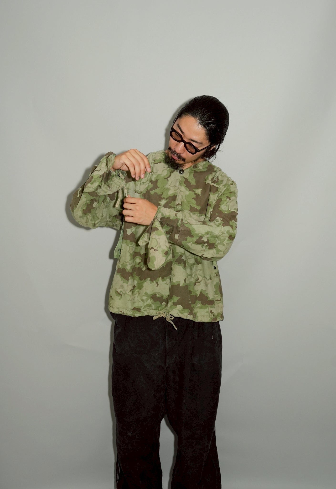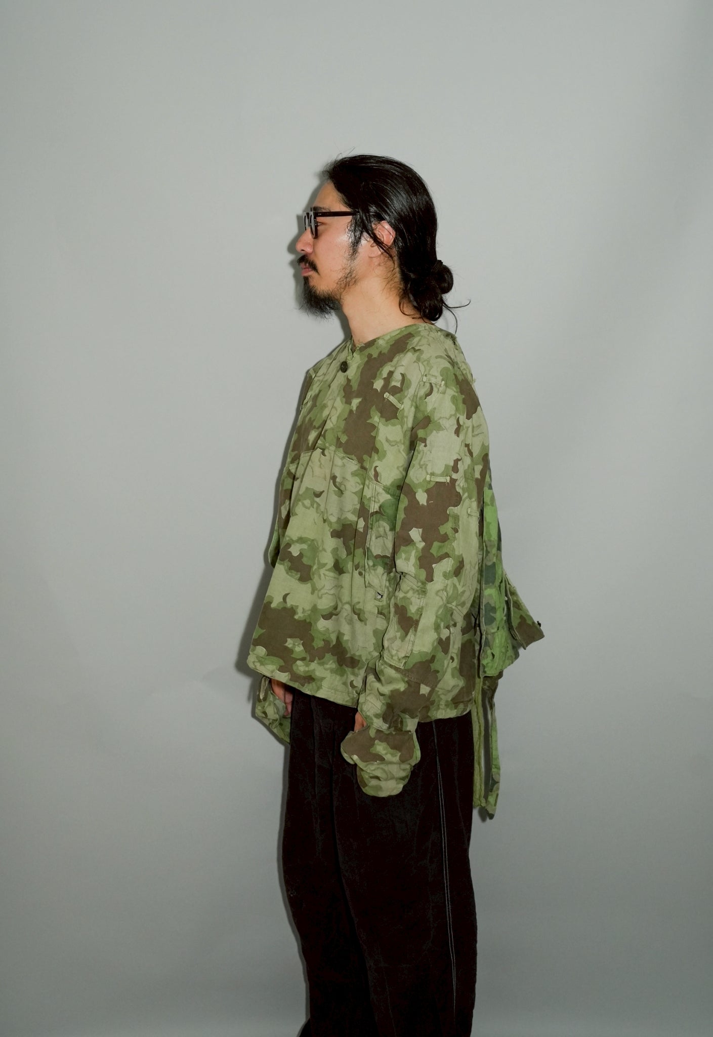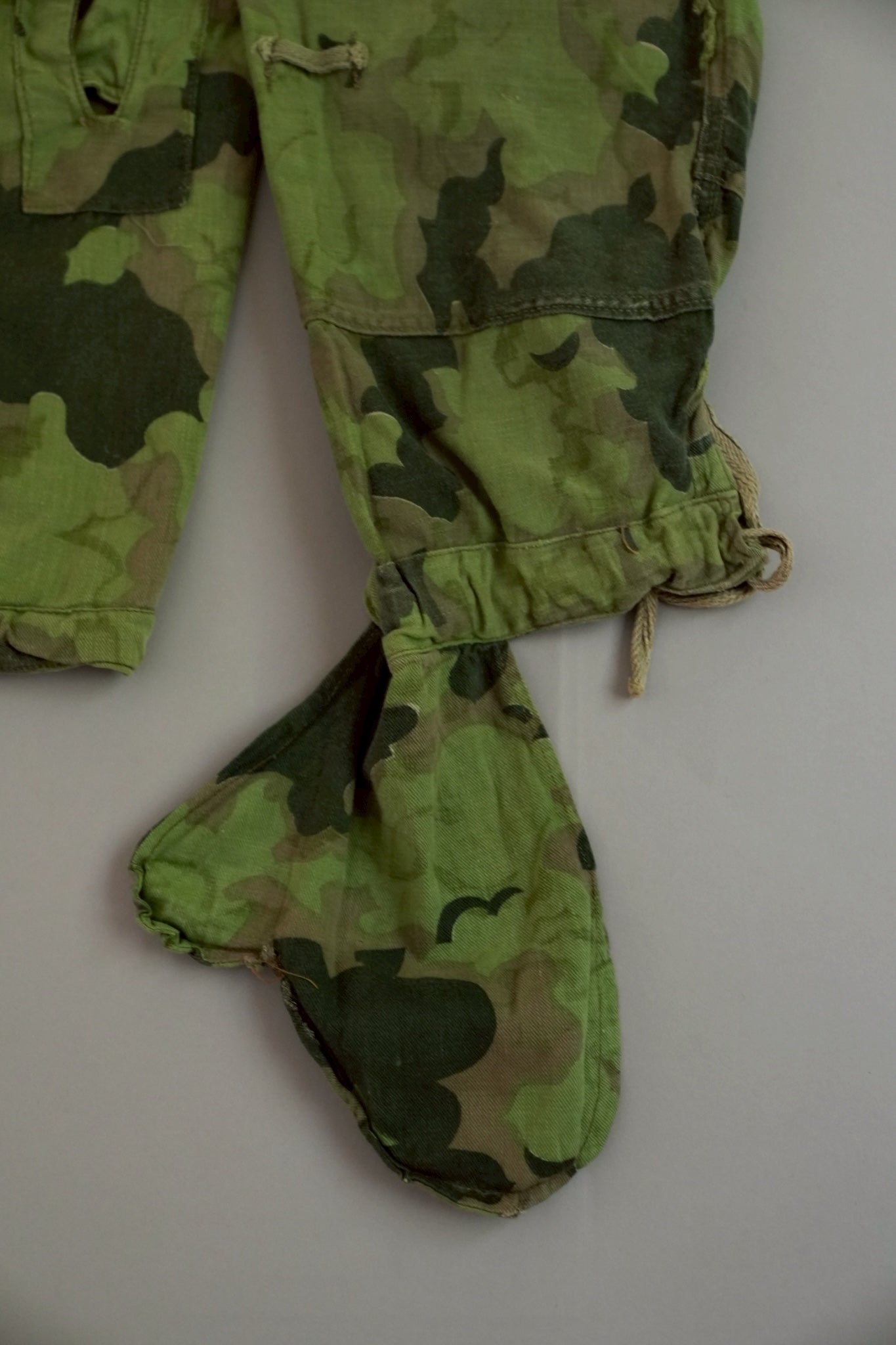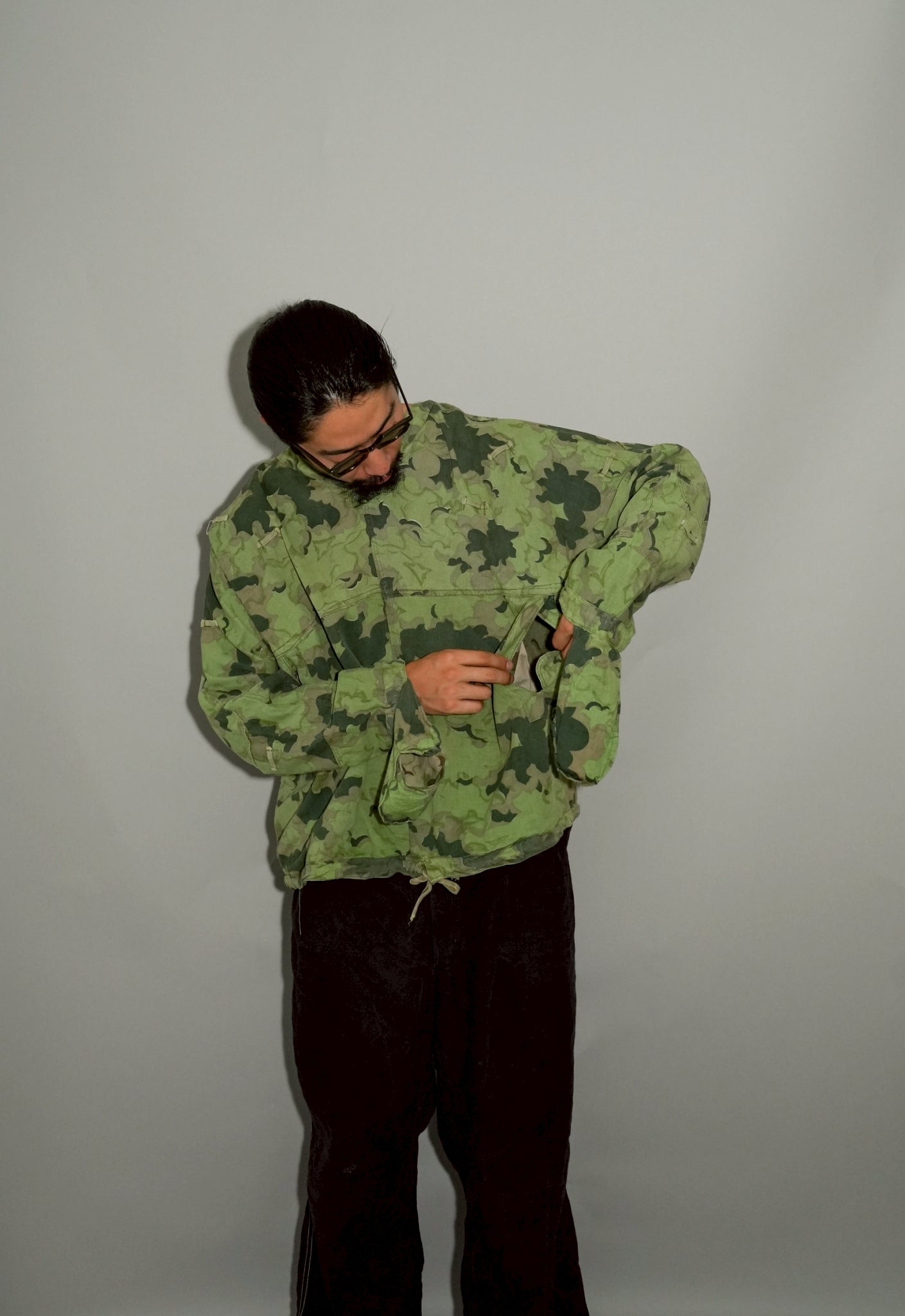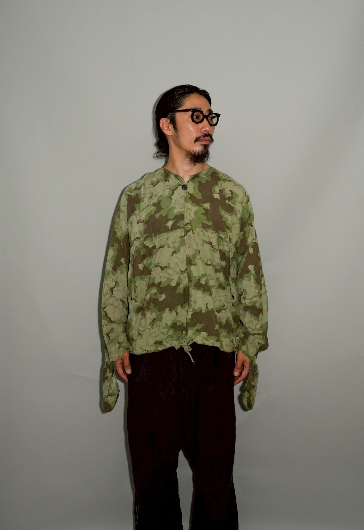まず注目すべきは、このアイテムが「リバーシブル仕様」であること。片面は淡いトーンのクラウドカモフラージュ、もう一方はより濃淡の強い配色が施されており、戦場や季節、環境に応じて使い分けられるよう設計されています。当時の兵士たちは森林、雪原、岩場といった多様なフィールドでの作戦を余儀なくされており、その環境適応力を高めるためにリバーシブル構造は非常に実用的でした。現代の目で見ても、表裏で印象が大きく変わるため、スタイリングにおいても多彩な表情を楽しめることは特筆すべき魅力でしょう。