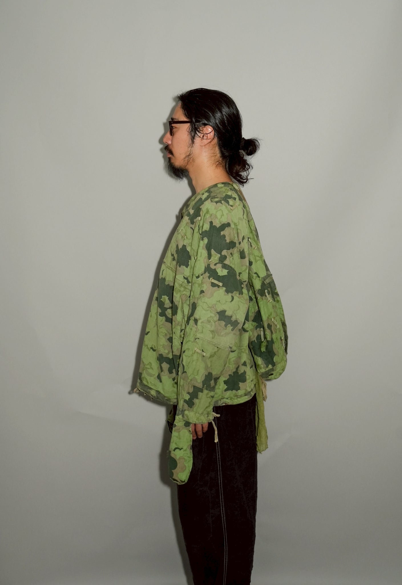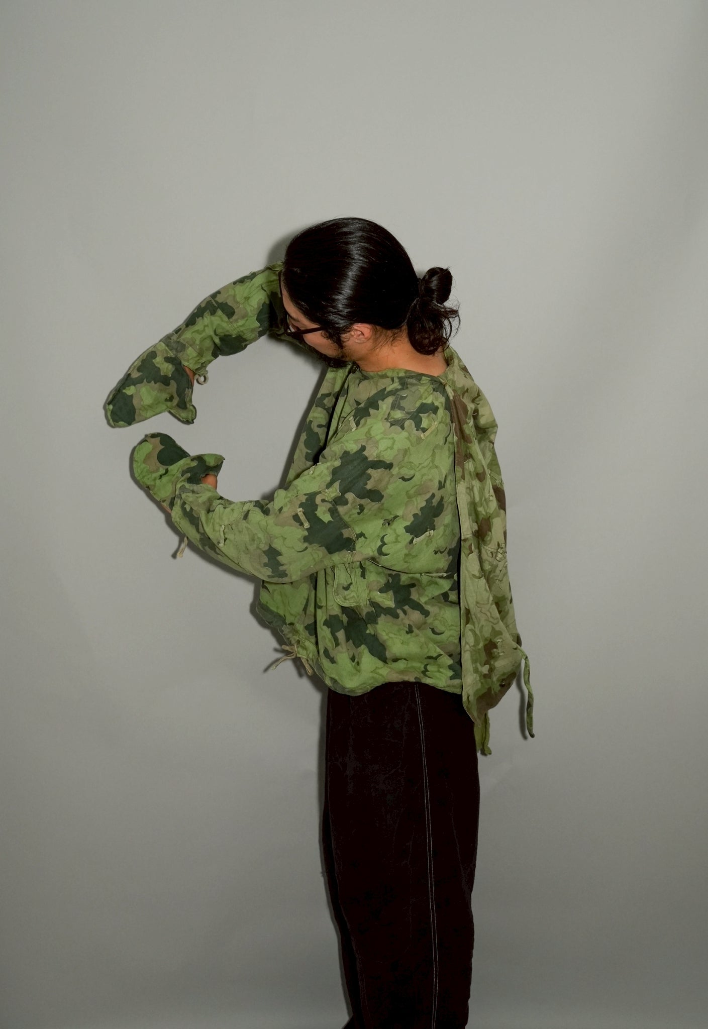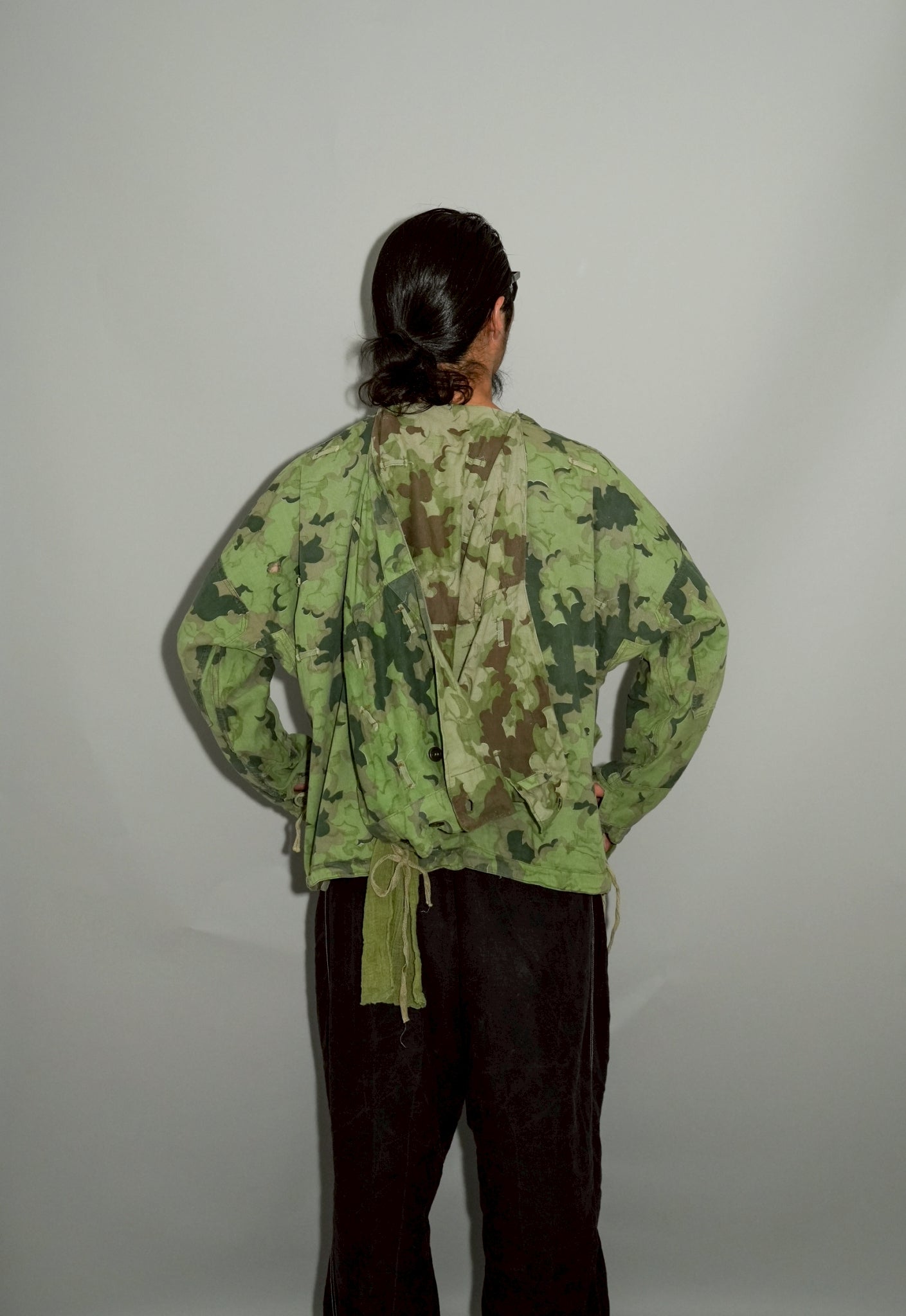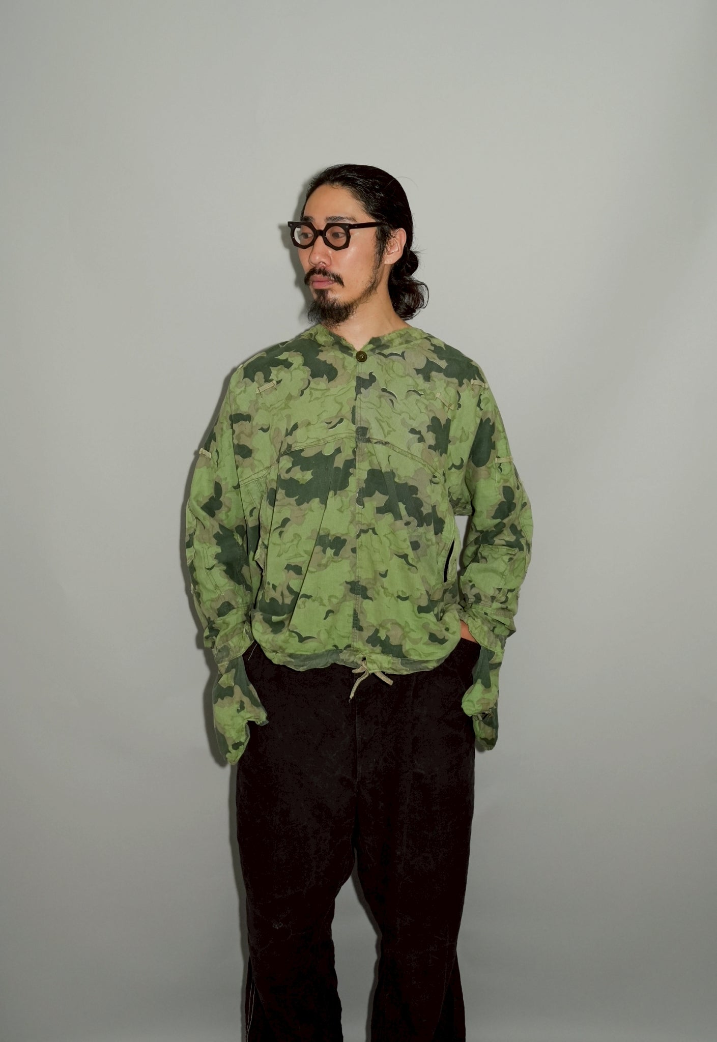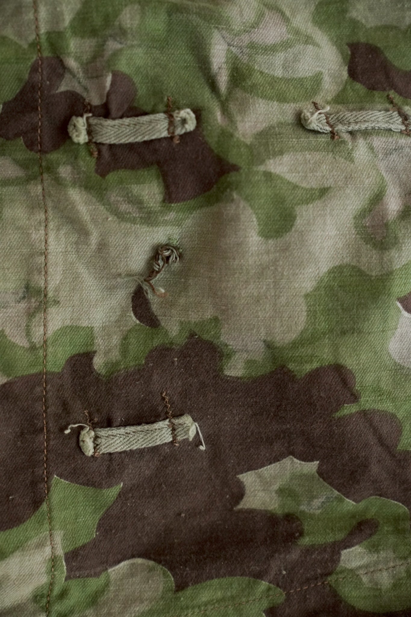 まず注目すべきは、このアイテムが「リバーシブル仕様」であること。片面は淡いトーンのクラウドカモフラージュ、もう一方はより濃淡の強い配色が施されており、戦場や季節、環境に応じて使い分けられるよう設計されています。当時の兵士たちは森林、雪原、岩場といった多様なフィールドでの作戦を余儀なくされており、その環境適応力を高めるためにリバーシブル構造は非常に実用的でした。現代の目で見ても、表裏で印象が大きく変わるため、スタイリングにおいても多彩な表情を楽しめることは特筆すべき魅力でしょう。