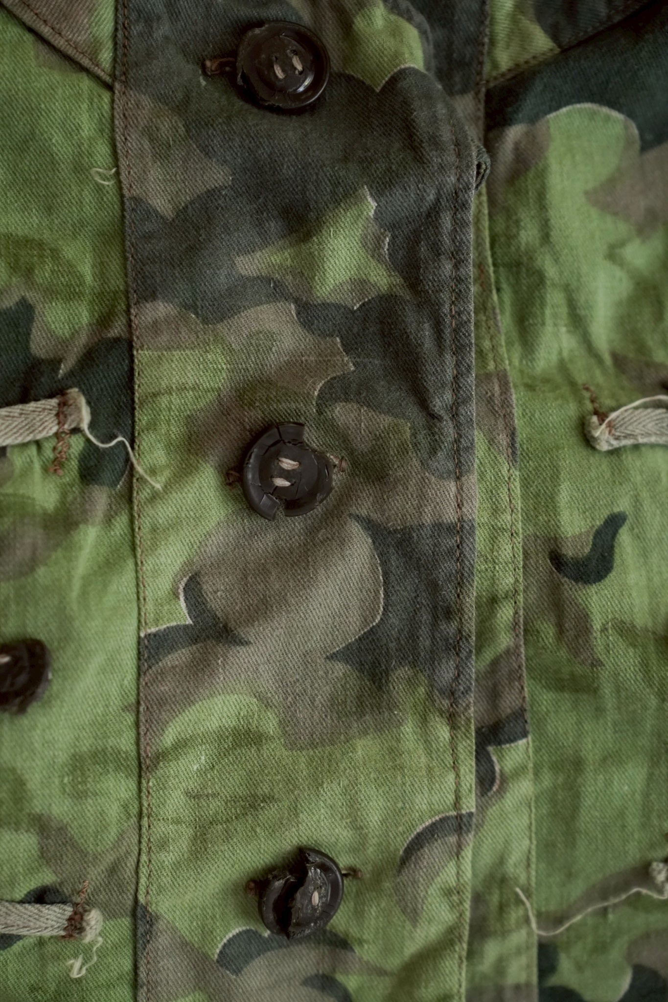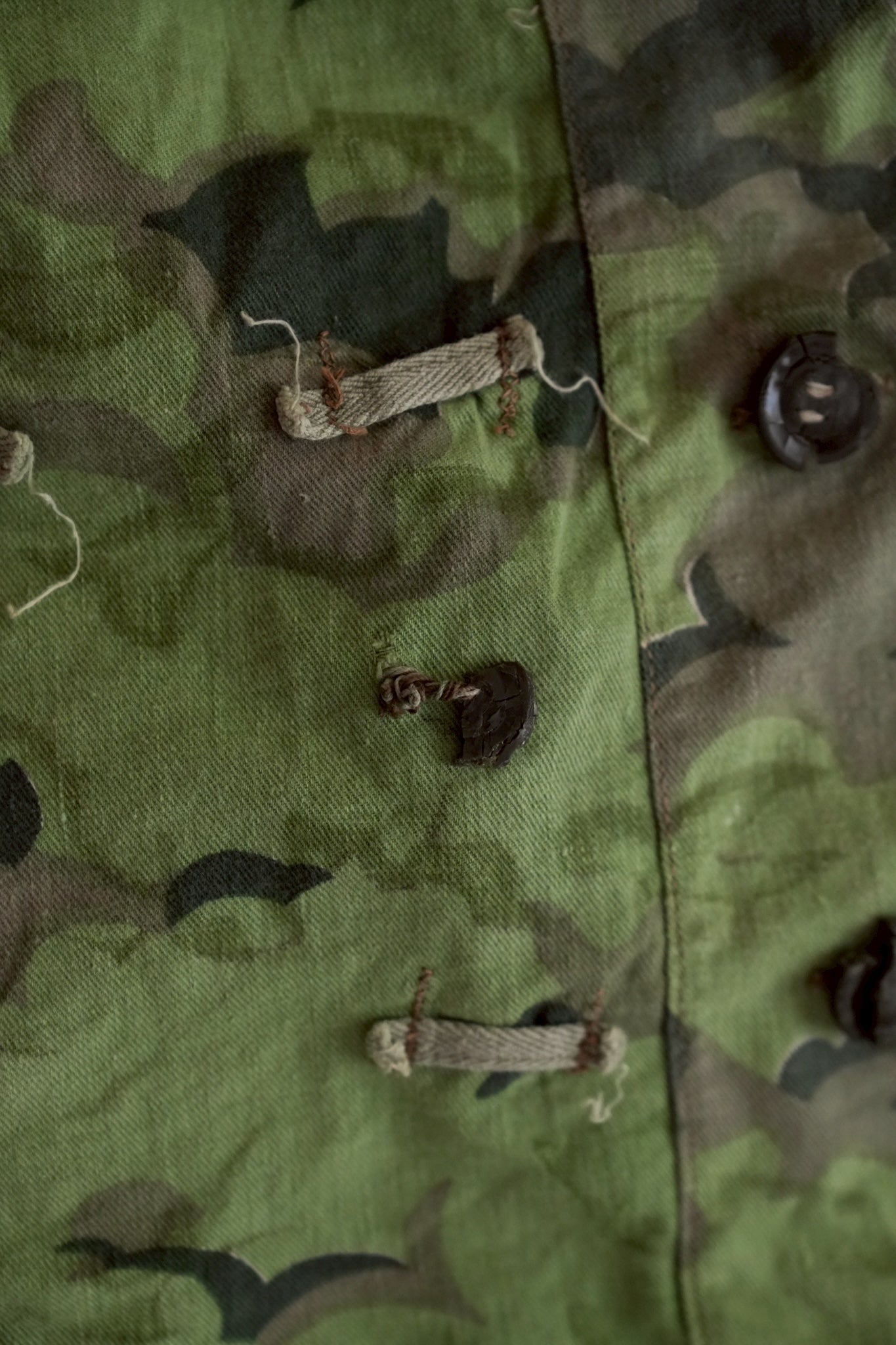 素材は軽量かつ耐久性のあるコットンキャンバスを使用。洗い込まれた経年変化によって生地は柔らかさを増し、当時の新品にはない豊かな表情を見せています。軍用生地らしい無骨さを残しながらも、どこか温かみのある風合いは、ヴィンテージ特有の存在感を放っています。特に「グッドコンディション」とされる本品は、現存数の少なさを考慮すれば奇跡的ともいえる状態。通常、野戦用スモックは過酷な環境で使い倒されて破損してしまうケースが多いため、これほど良好なコンディションで残存している個体は極めて稀少です。