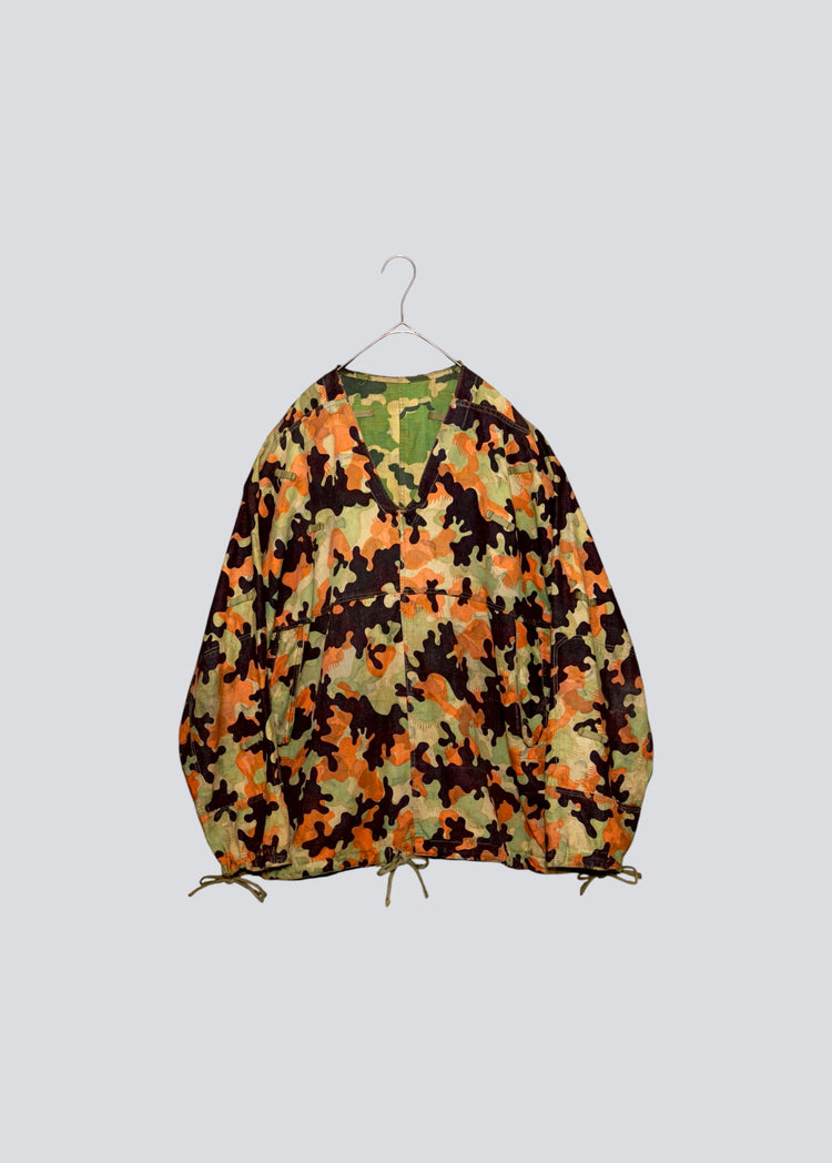 シルエットはオーバースモックらしいゆったりとした設計で、アウターの上から被るために考えられたシンプルな構造。襟元のドローコード、裾や袖口の調整機能など、最低限にして効果的なディテールが配置されており、極めて実用的かつミニマルな美学が光ります。装飾性を削ぎ落とした構成だからこそ、ドゥバキーカモのグラフィックが一層際立ち、唯一無二の存在感を放ちます。