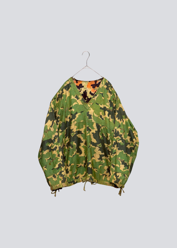 このスモックはリバーシブル仕様となっており、両面に異なるカモフラージュパターンまたは濃淡が施されています。これは着用環境に応じて使い分けることを目的とした機能設計で、1枚の衣服で異なる地形や気候に適応するという、当時としては極めて先進的な発想によるものです。裏返すことで全く異なる表情を見せるこの仕様は、視覚的な楽しさと実用性を両立させており、現在のファッションシーンにおいても十分通用する普遍的な魅力を備えています。