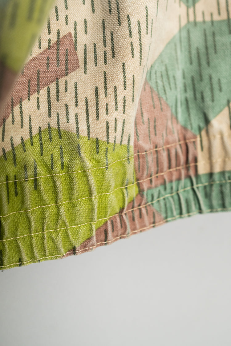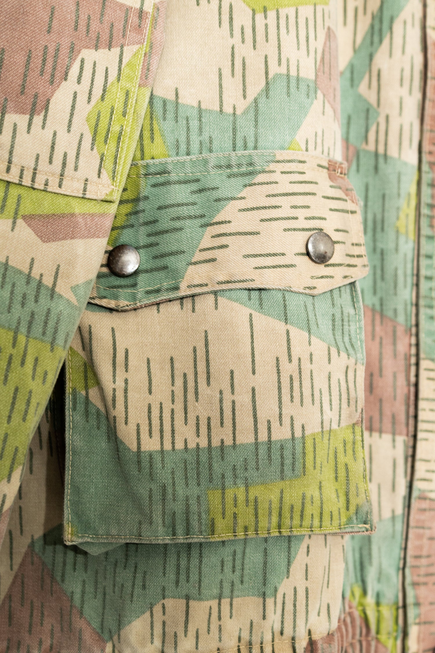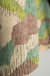 最大の特徴は、やはりこのスプリンターカモフラージュにあります。ブラウン、オリーブ、セージグリーン、ベージュといった自然界に即した配色をベースに、縦方向へ走る細かなストロークが全体にリズムを与えています。遠目では抽象画のようにも見え、近くで見ると非常に緻密な構成であることが分かるこの迷彩は、単なる視認性低下を目的とした柄ではなく、視覚的な「錯覚」や「分断」を意識したデザインとして完成されています。現代のデジタルカモやピクセルカモとは対極にある、どこか手描きのような温度感が残る点も、この迷彩の大きな魅力です。