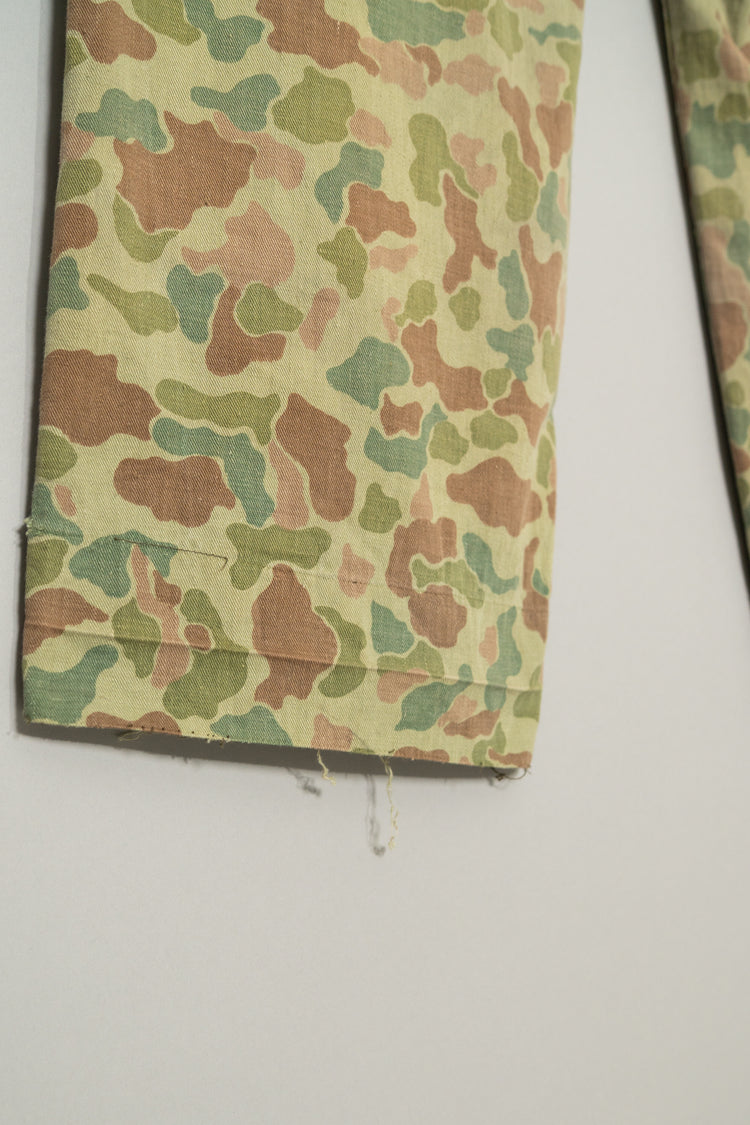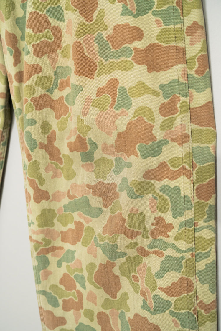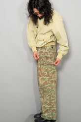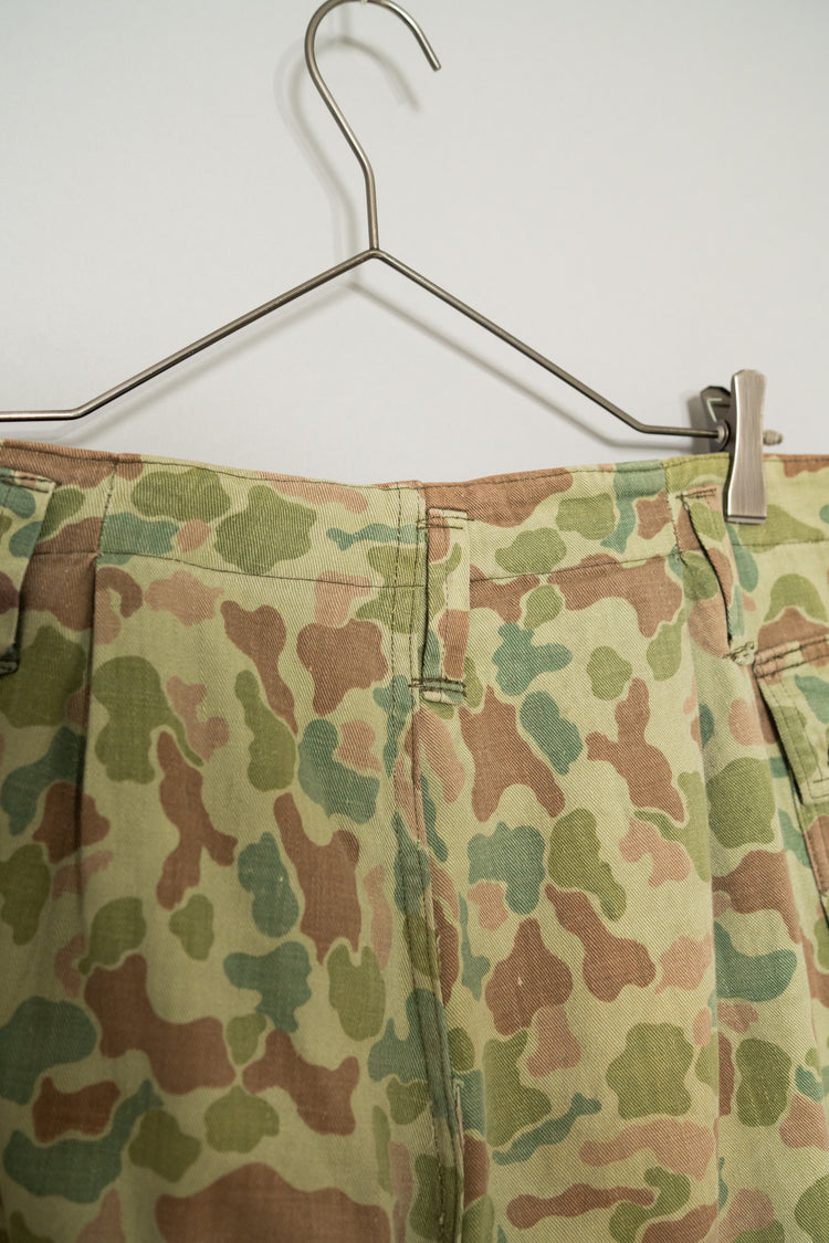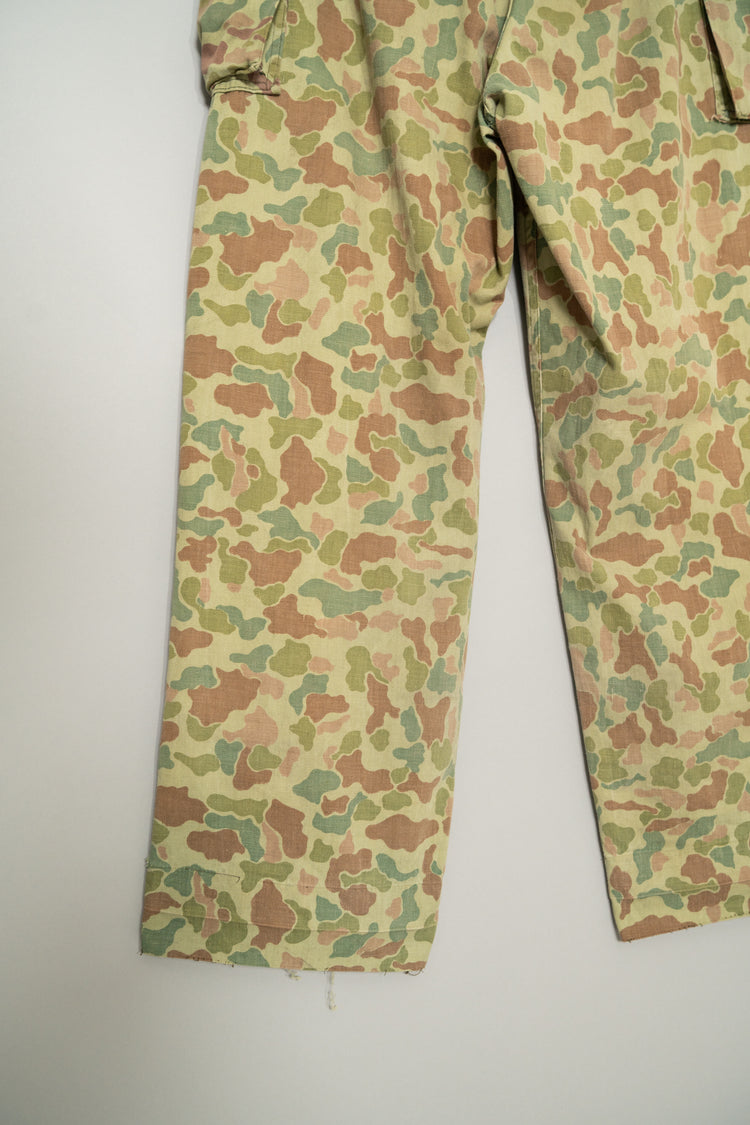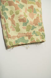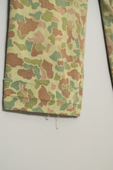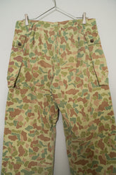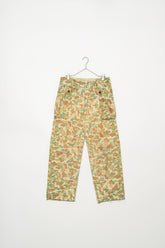 1950年代にオランダ軍で採用されたフロッグスキン、いわゆるダックハンターカモフラージュを用いたフィールドカーゴトラウザーは、ミリタリーウェアの中でも特にファッション的評価が高いモデルとして知られています。ダックハンターカモは本来、第二次世界大戦期にアメリカ軍が開発した迷彩パターンを起源としますが、戦後ヨーロッパ各国へと広がる中で、それぞれの地形や戦術思想に合わせて独自の進化を遂げました。オランダ軍仕様はその中でも特に色彩設計が洗練されており、軍用迷彩でありながら強い主張を感じさせない、非常に完成度の高いカモフラージュとして位置付けられています。