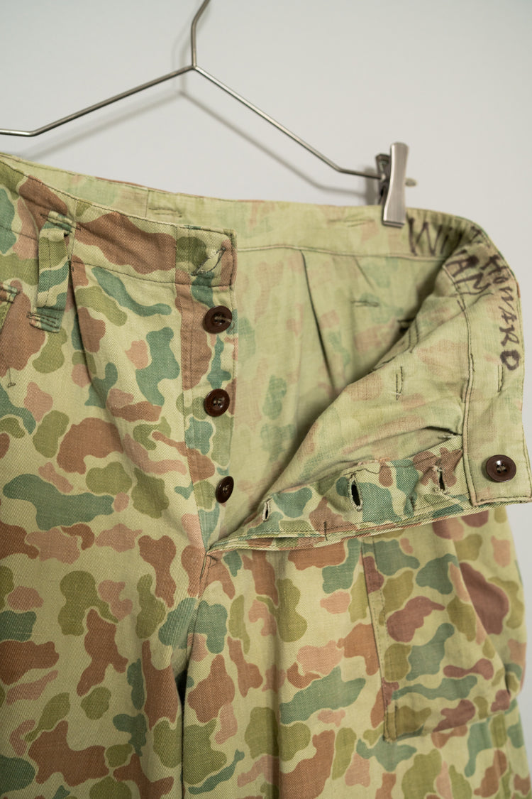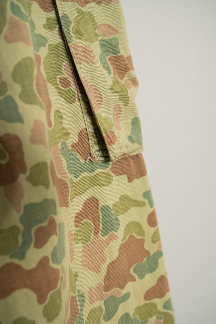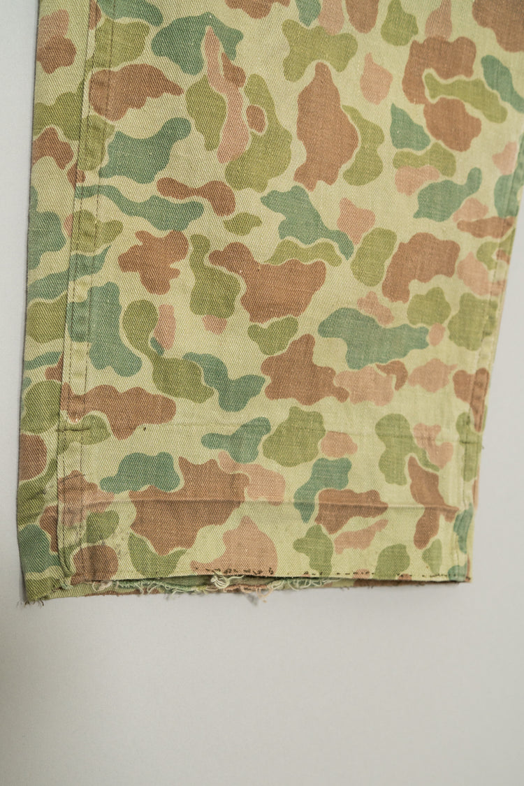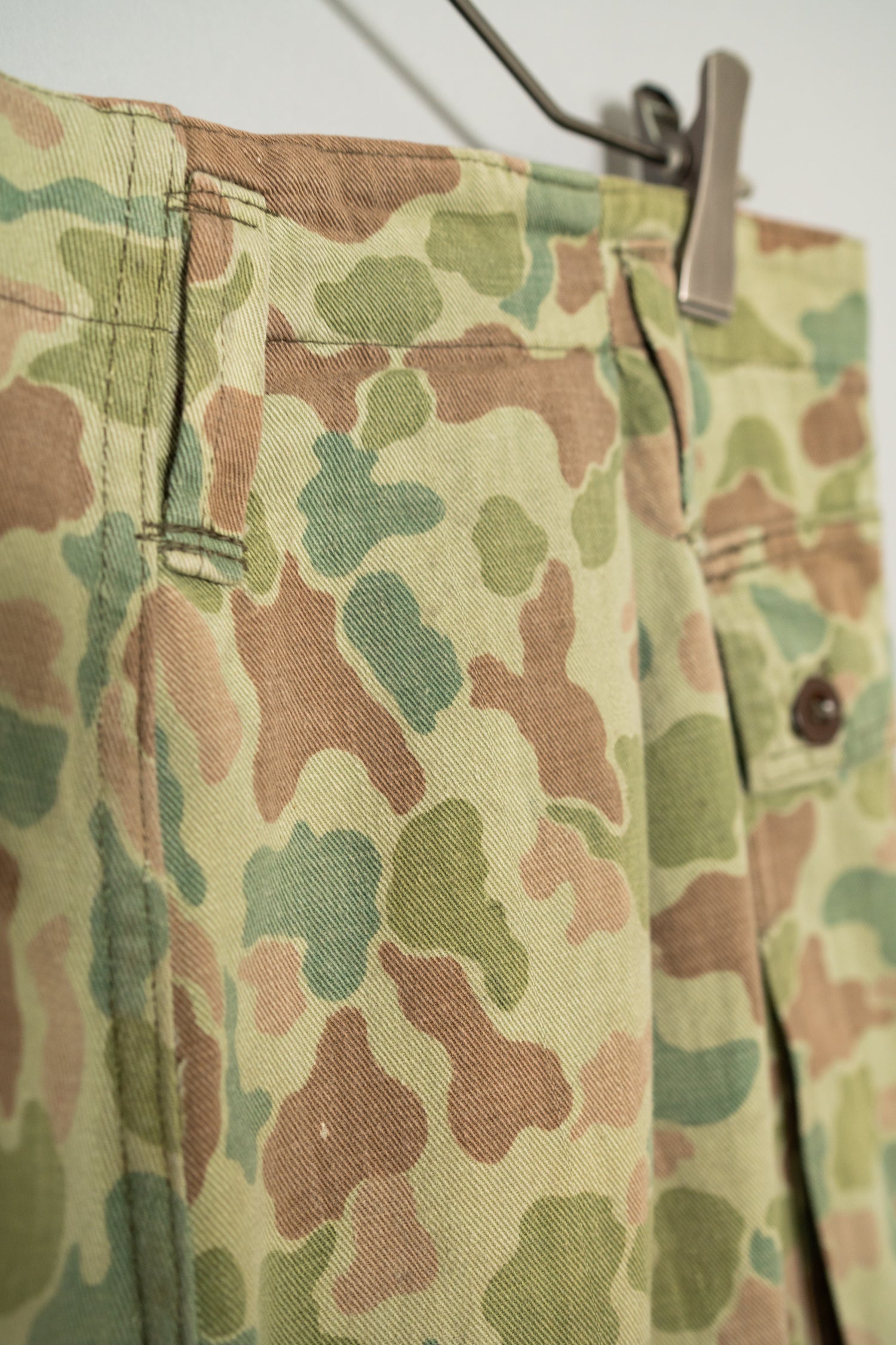 1950年代にオランダ軍で採用されたフロッグスキン、いわゆるダックハンターカモフラージュを用いたフィールドカーゴトラウザーは、ミリタリーウェアの中でも特にファッション的評価が高いモデルとして知られています。ダックハンターカモは本来、第二次世界大戦期にアメリカ軍が開発した迷彩パターンを起源としますが、戦後ヨーロッパ各国へと広がる中で、それぞれの地形や戦術思想に合わせて独自の進化を遂げました。オランダ軍仕様はその中でも特に色彩設計が洗練されており、軍用迷彩でありながら強い主張を感じさせない、非常に完成度の高いカモフラージュとして位置付けられています。