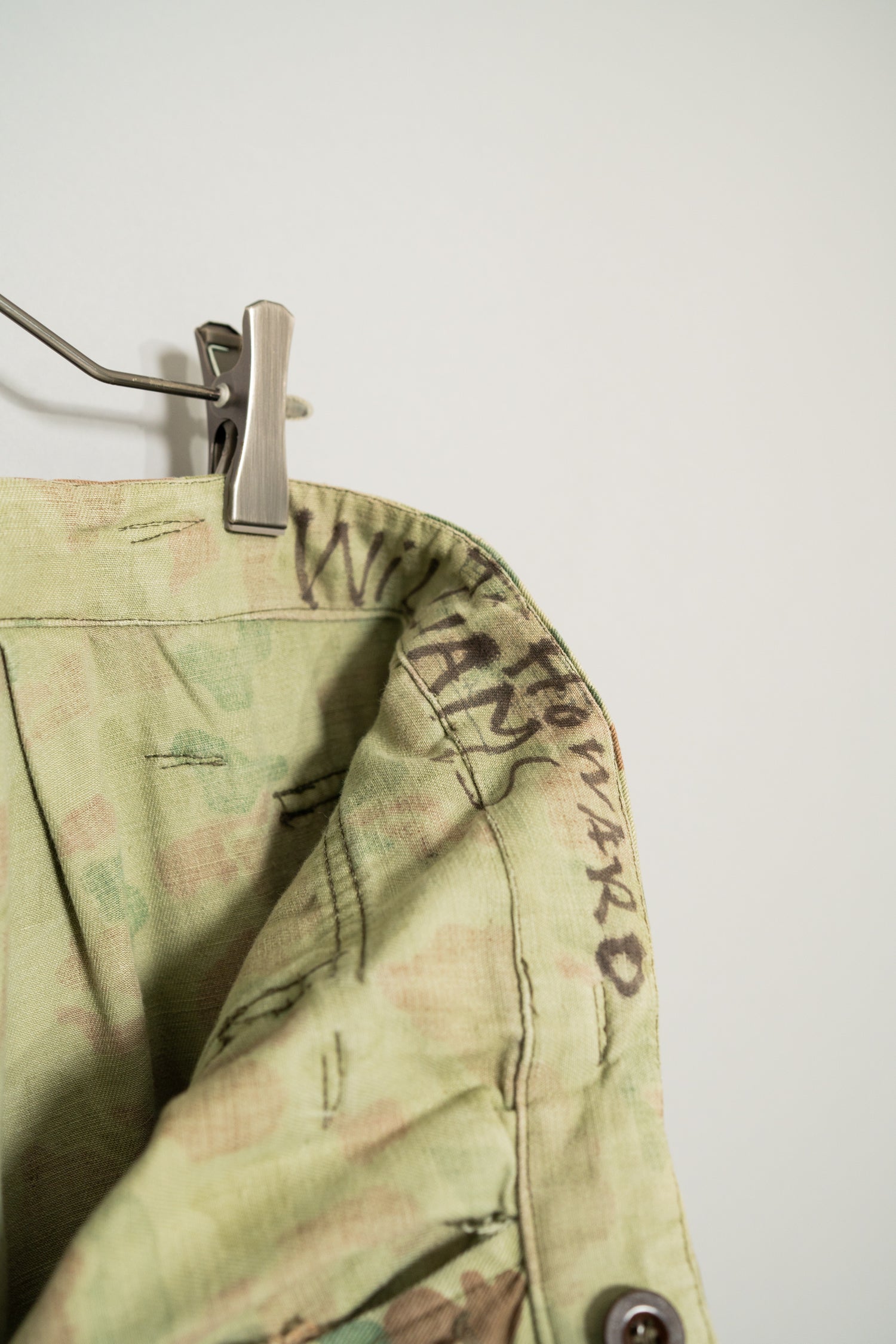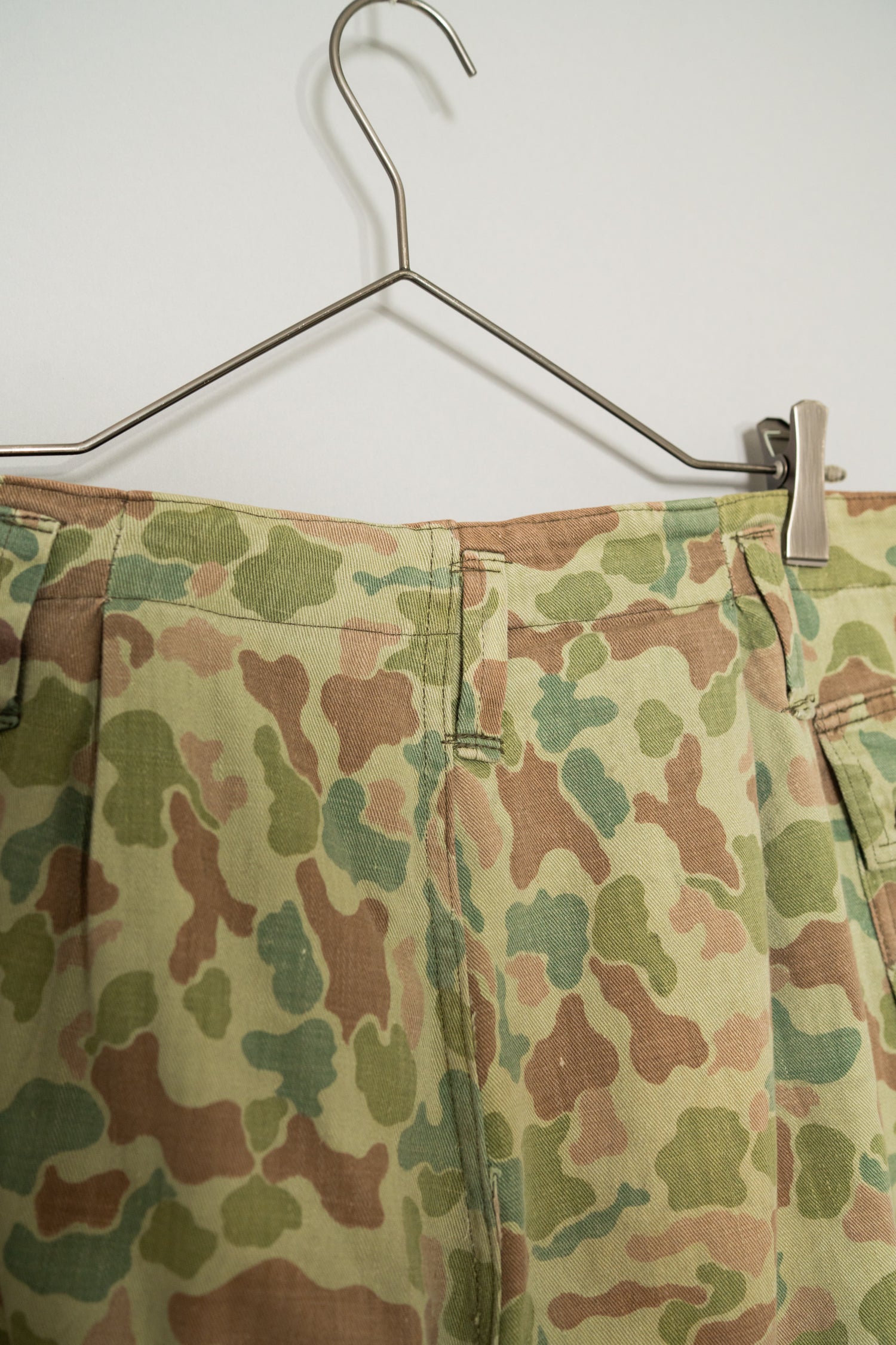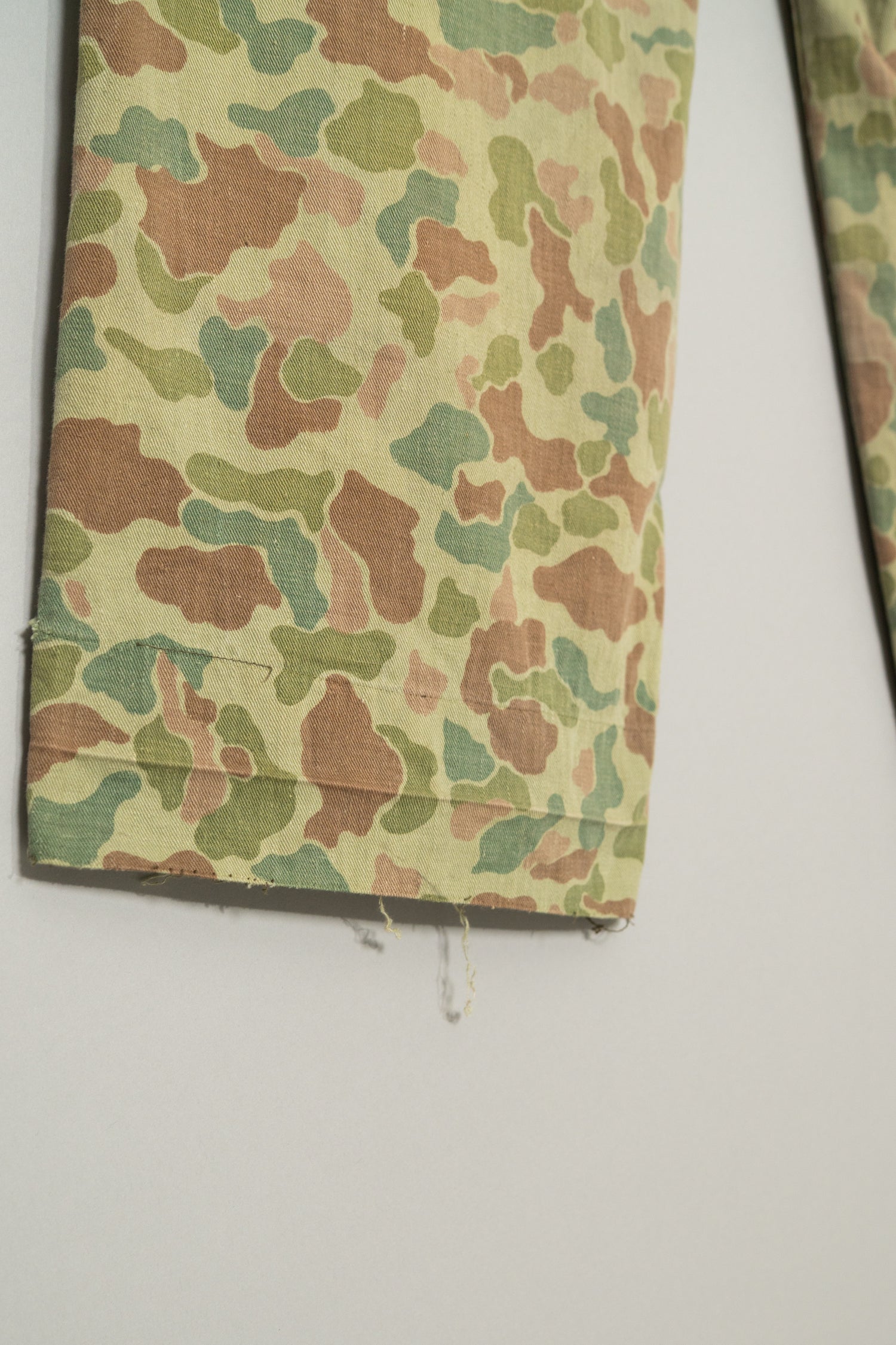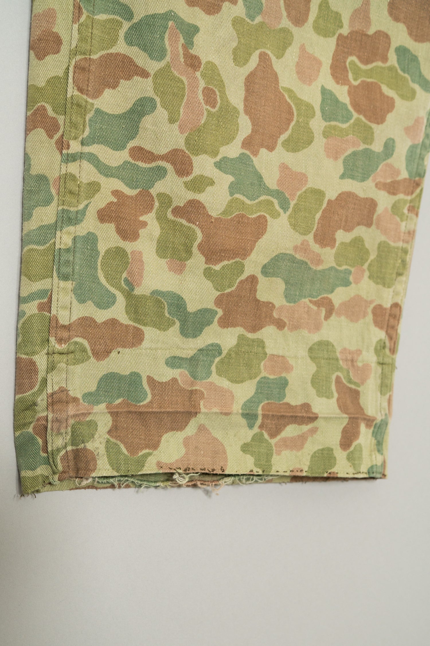 素材には当時のヨーロッパ軍で多用されたヘリンボーンツイルが使用されており、耐久性と柔軟性を両立した実用素材として設計されています。ヘリンボーン特有の織り構造は生地に立体感を与え、光の当たり方によって表情が変化するため、単なるプリント迷彩とは一線を画す奥行きのある質感を楽しむことができます。さらにこの個体は長年の着用によって繊維がほぐれ、非常に柔らかく身体に馴染むコンディションに仕上がっており、ヴィンテージミリタリーにありがちな硬さやゴワつきが少ない点も大きなポイントです。履き始めからストレスなく日常使いできる着用感は、実際に袖を通した人だけが実感できる価値と言えるでしょう。