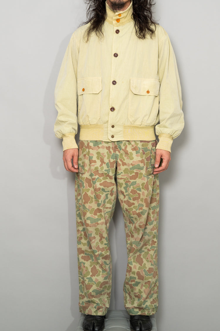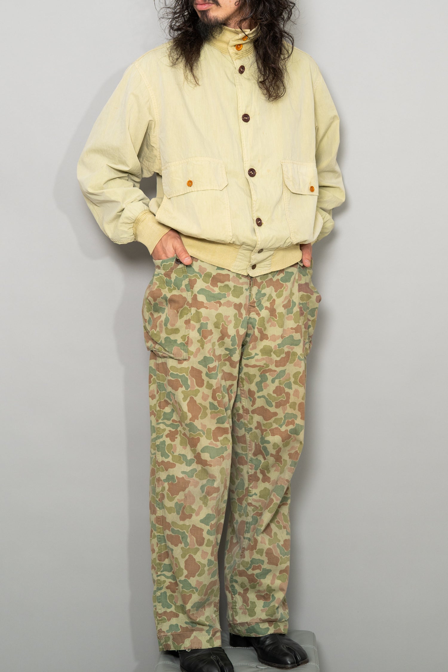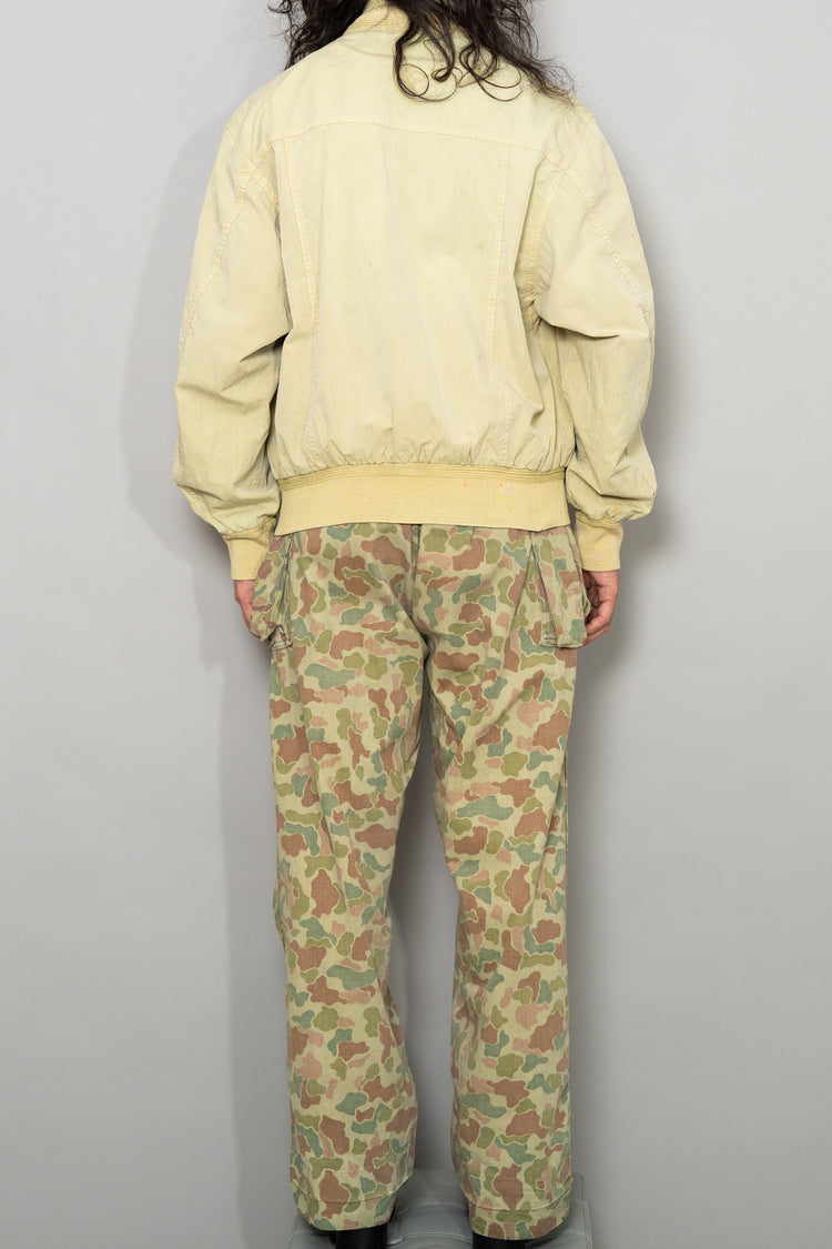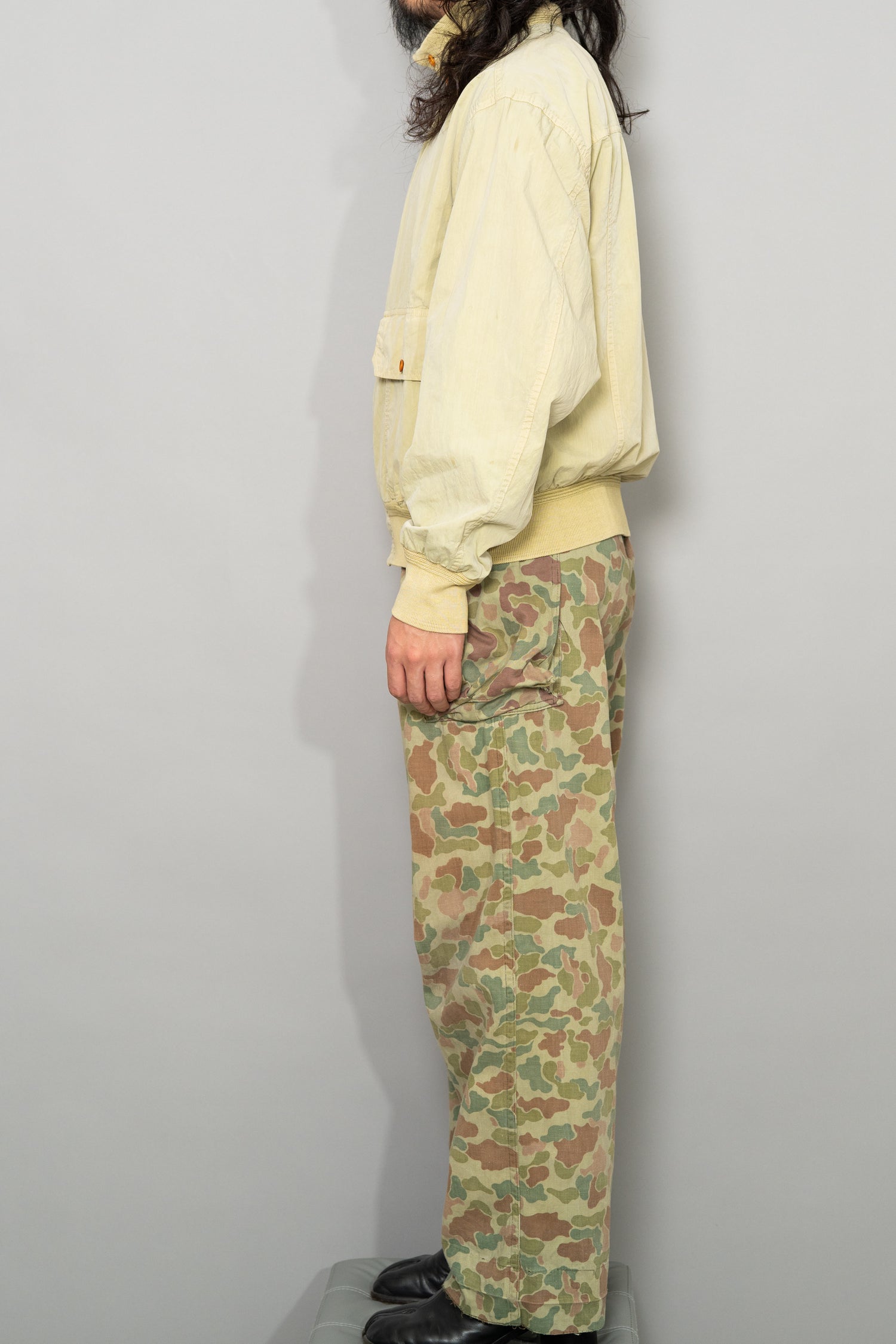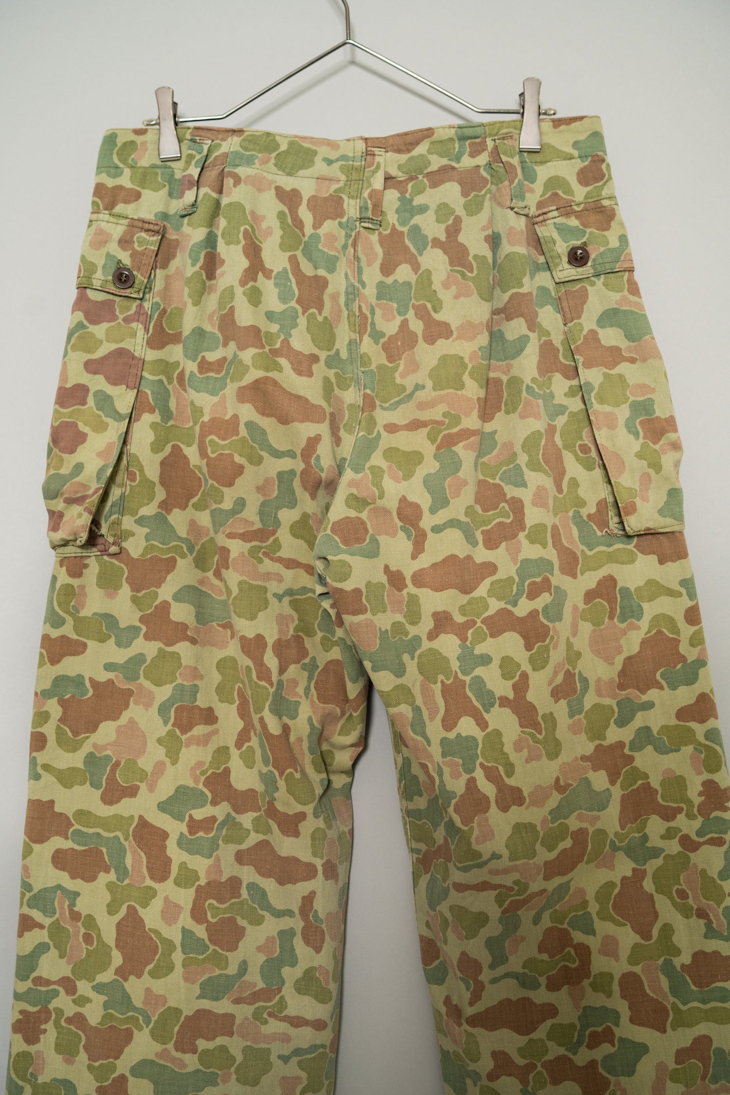 軍事的合理性から生まれた設計思想、戦後オランダの環境条件を反映した穏やかな迷彩配色、長年の使用によって育まれた柔らかな生地感、そして現代ファッションとも高い親和性を持つシルエットと色味。これらすべてが重なり合うことで、この1950s Dutch Army Frogskin Camouflage Field Cargo Trousersは、単なるヴィンテージミリタリーパンツを超えた完成度を持つ一本として成立しています。他にはない色調と質感を備え、履いた瞬間に違いが分かる、まさに一点物の価値を持った個体です。ジャケットと合わせたセットアップはもちろん、単体でも主役級として活躍してくれる、長く付き合えるヴィンテージトラウザーとして自信を持っておすすめできる一本です。