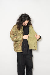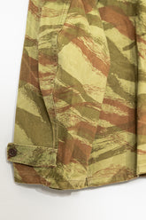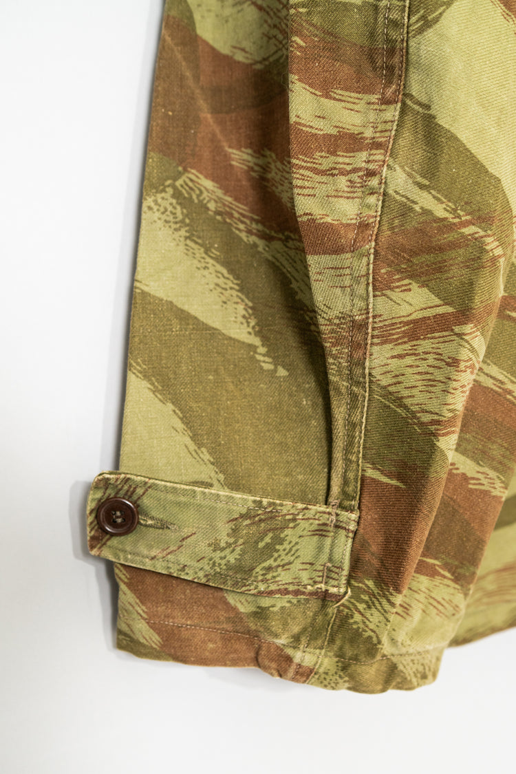 最大の特徴は、やはりフランス軍独自の「リザードカモフラージュ」と呼ばれる迷彩柄です。筆で刷いたような不規則なストロークによって構成されたこのカモフラージュは、当時のジャングル戦を想定して設計されており、視覚的なインパクトと実用性を高い次元で両立しています。現代のプリント迷彩にはない、手仕事の痕跡を感じさせる荒さと有機的な表情が、このジャケットに独特の存在感を与えています。