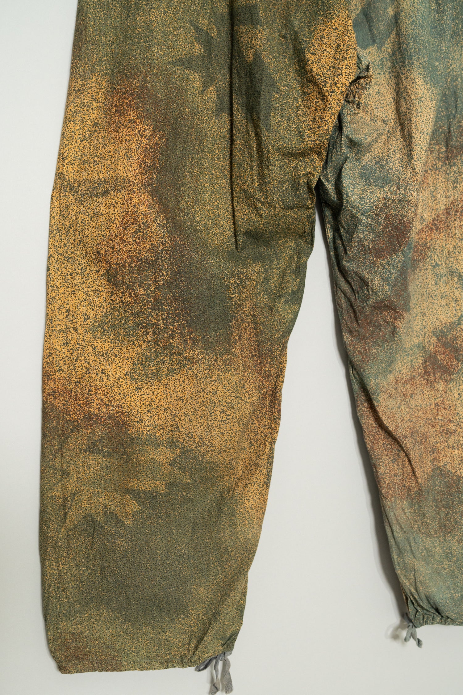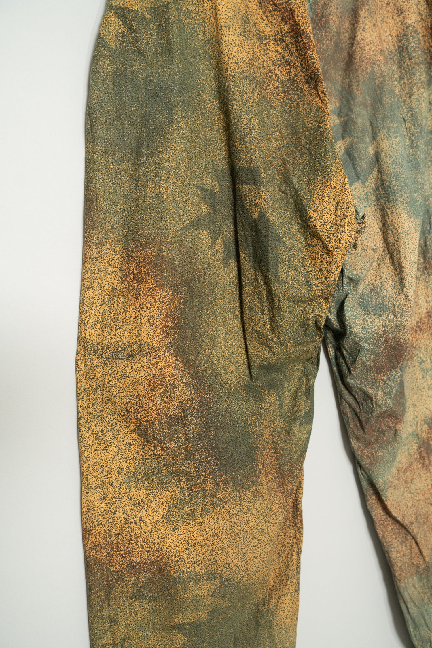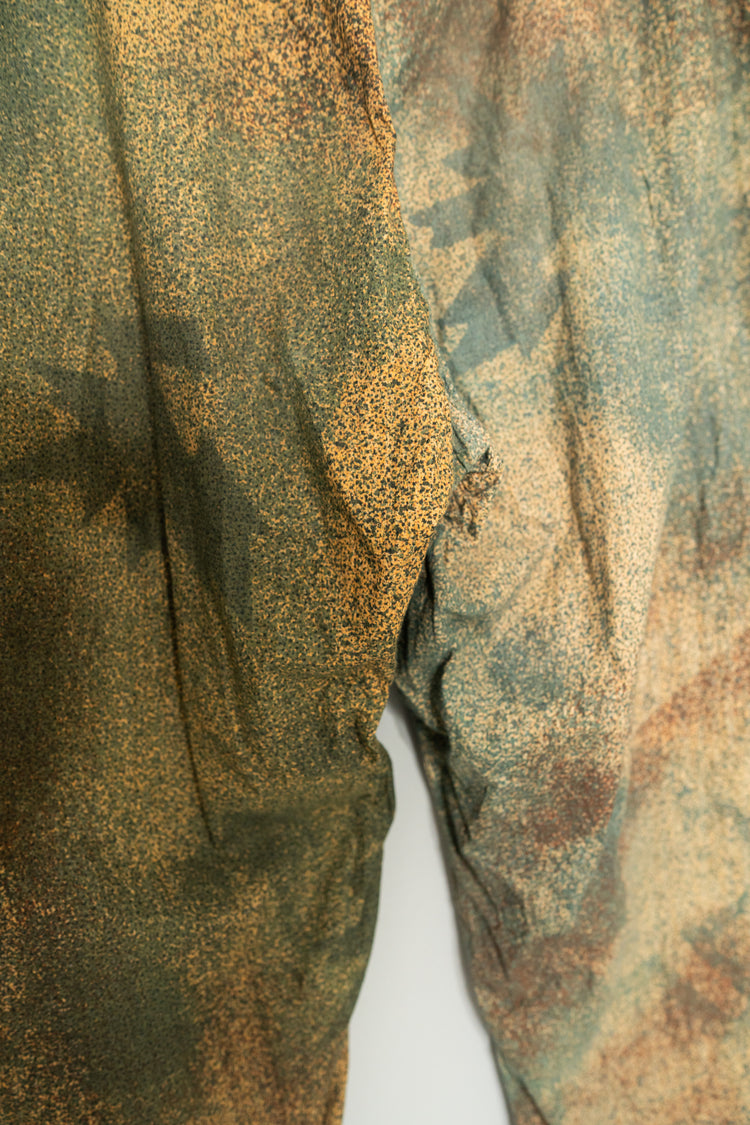 特にスナイパーや偵察部隊向けに設計されたこの迷彩は、草木や岩肌、土壌の色味が複雑に入り混じる環境において、人体の輪郭を完全に曖昧化する目的で使用されていました。色彩設計も極めて独特で、一般的なグリーン主体の迷彩とは異なり、くすんだブルーグリーン、黄土色、ブラウン、グレーが層状に重なり合うように構成されています。その結果、自然界の「色の境界線が曖昧な状態」を人工的に再現しており、軍事的合理性と視覚設計の完成度が非常に高い迷彩として現在も高く評価されています。