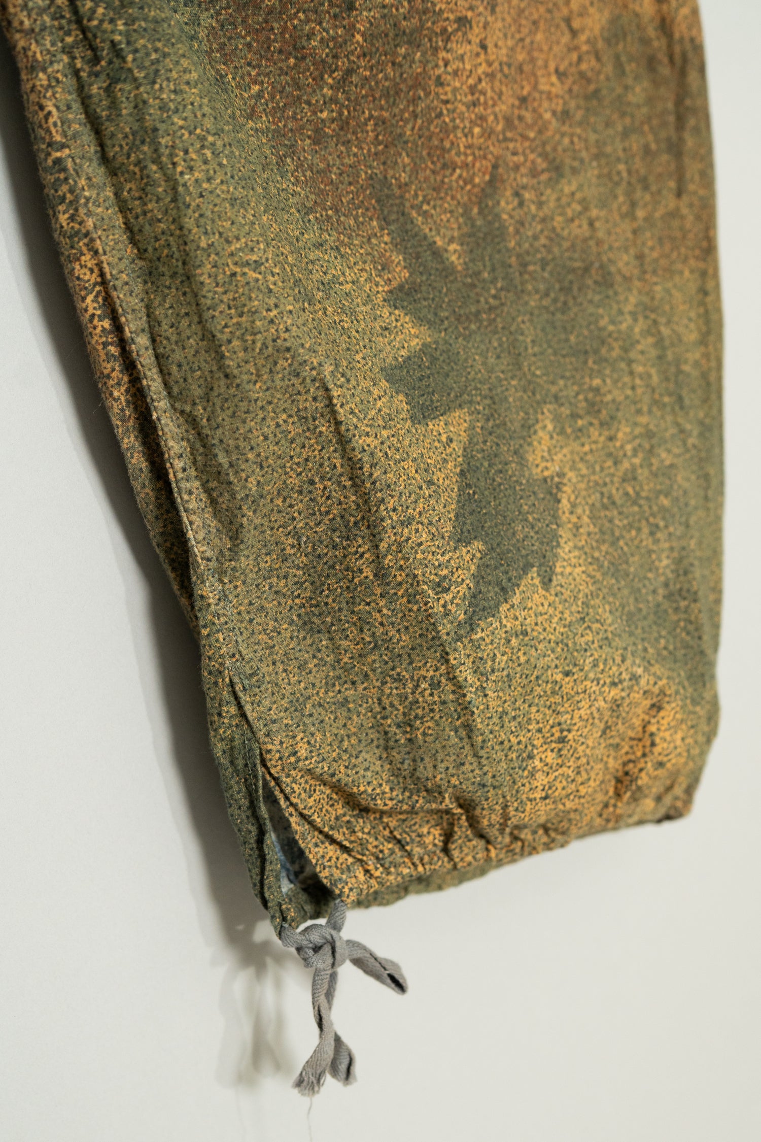 素材は軽量で通気性にも配慮されたコットンベースのファブリックが用いられており、スナイパースモックと同様、長時間の潜伏や移動を想定した設計となっています。ウエスト部分はドローコード仕様となっており、体型に合わせて細かなフィッティング調整が可能です。ベルトに依存せずに固定できる構造は、匍匐前進や長距離移動時にもズレを最小限に抑えるための軍装ならではの合理的な設計思想を反映しています。裾にはドローコードが備えられており、ブーツの上から絞ることで砂や小石、草木の侵入を防ぎつつ、シルエットの調整も可能となっています。