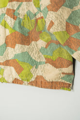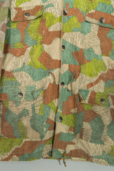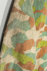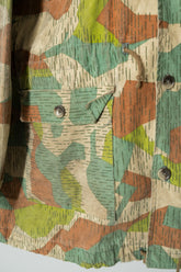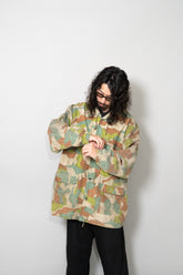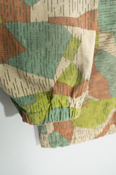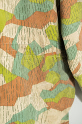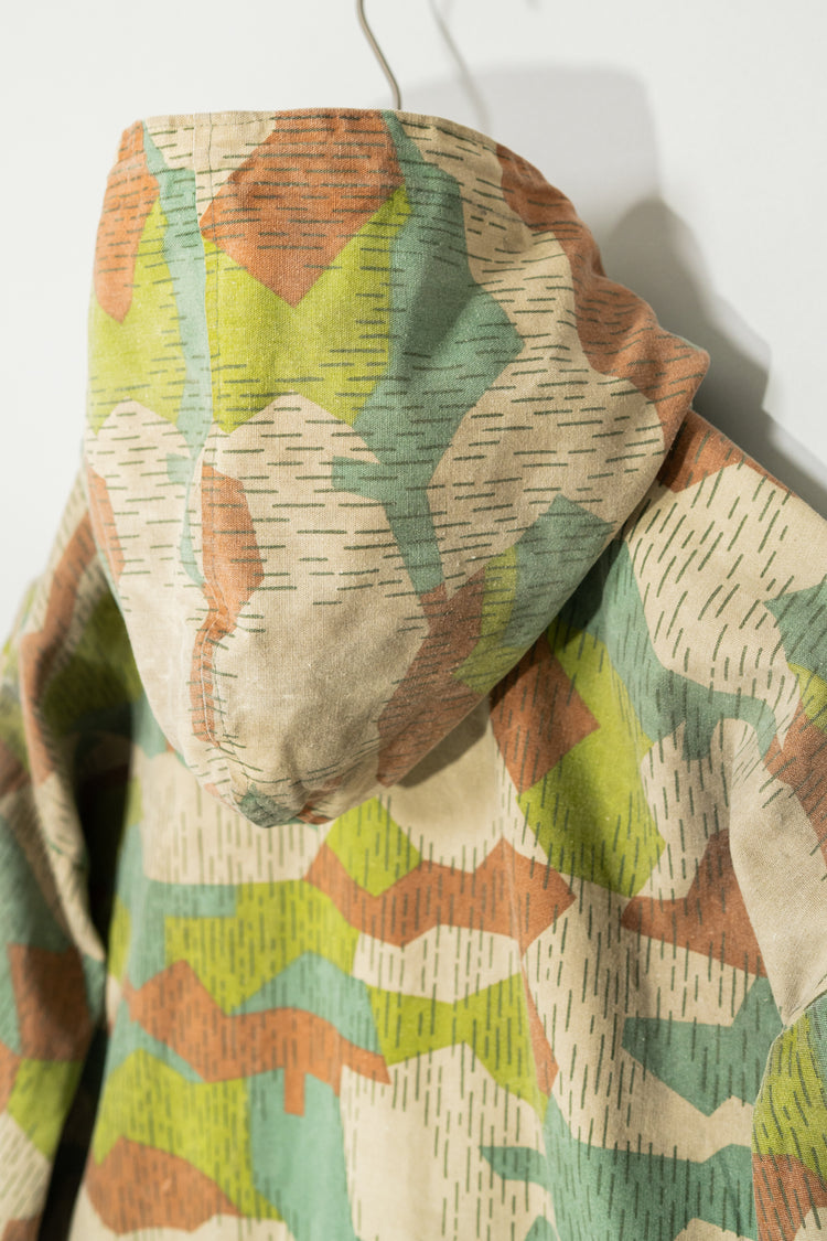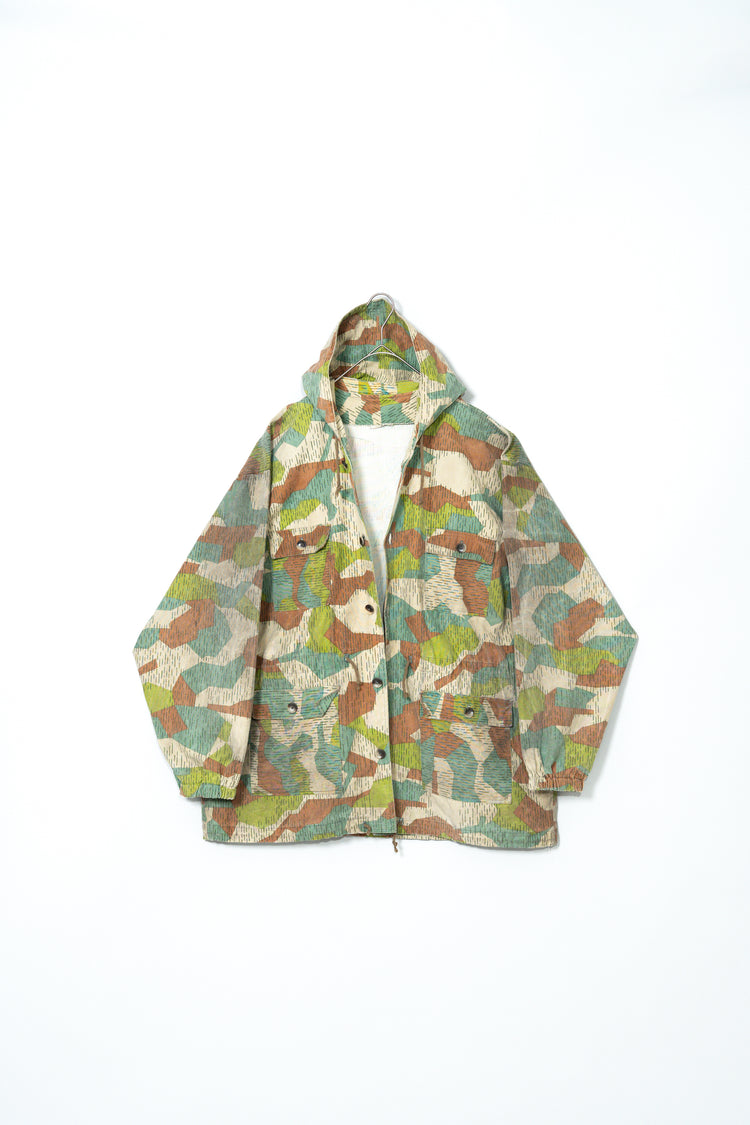 1970年代に旧チェコスロバキアで運用されていた軍・準軍事組織向けのカモフラージュジャケットの中でも、本作は「Svazarm(スヴァザーム)」と呼ばれる組織に由来する非常に希少性の高いフーディータイプの一着です。Svazarmは社会主義体制下のチェコスロバキアにおいて、青少年や一般市民を対象に軍事訓練やスポーツ射撃、無線通信などを教える半公的組織として存在しており、実戦用の軍服とは異なりながらも、軍の装備体系や迷彩思想を色濃く反映したプロダクトを数多く生み出していました。本作のスプリンターカモフラージュも、そうした背景の中で誕生したパターンであり、いわゆる西側の迷彩やドイツ軍のスプリンター迷彩とも共通項を持ちながら、配色や形状、ラインの取り方に独特の解釈が見られる点が特徴です。グリーン、ブラウン、ベージュを基調とした色構成は森林地帯での視認性を下げることを意図しており、細かく走る縦方向のステッチのようなプリントは、輪郭を分断し対象物のシルエットを曖昧にするための視覚的効果を狙ったものです。迷彩そのものがデザインとして強い存在感を放つため、現代のファッションシーンにおいてもミリタリーアーカイブの中でも特に評価の高いパターンの一つとされています。