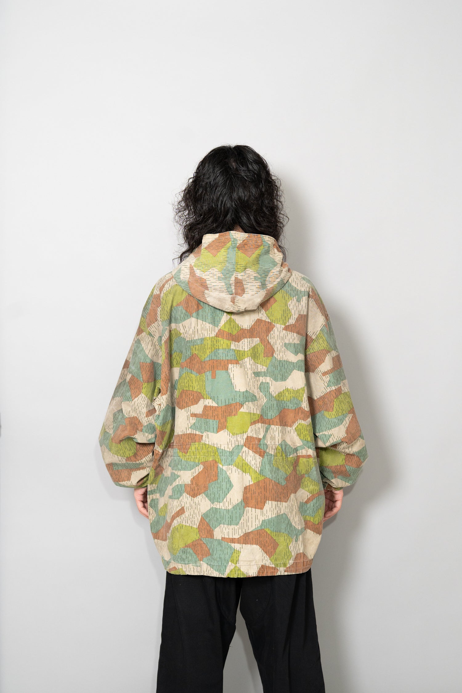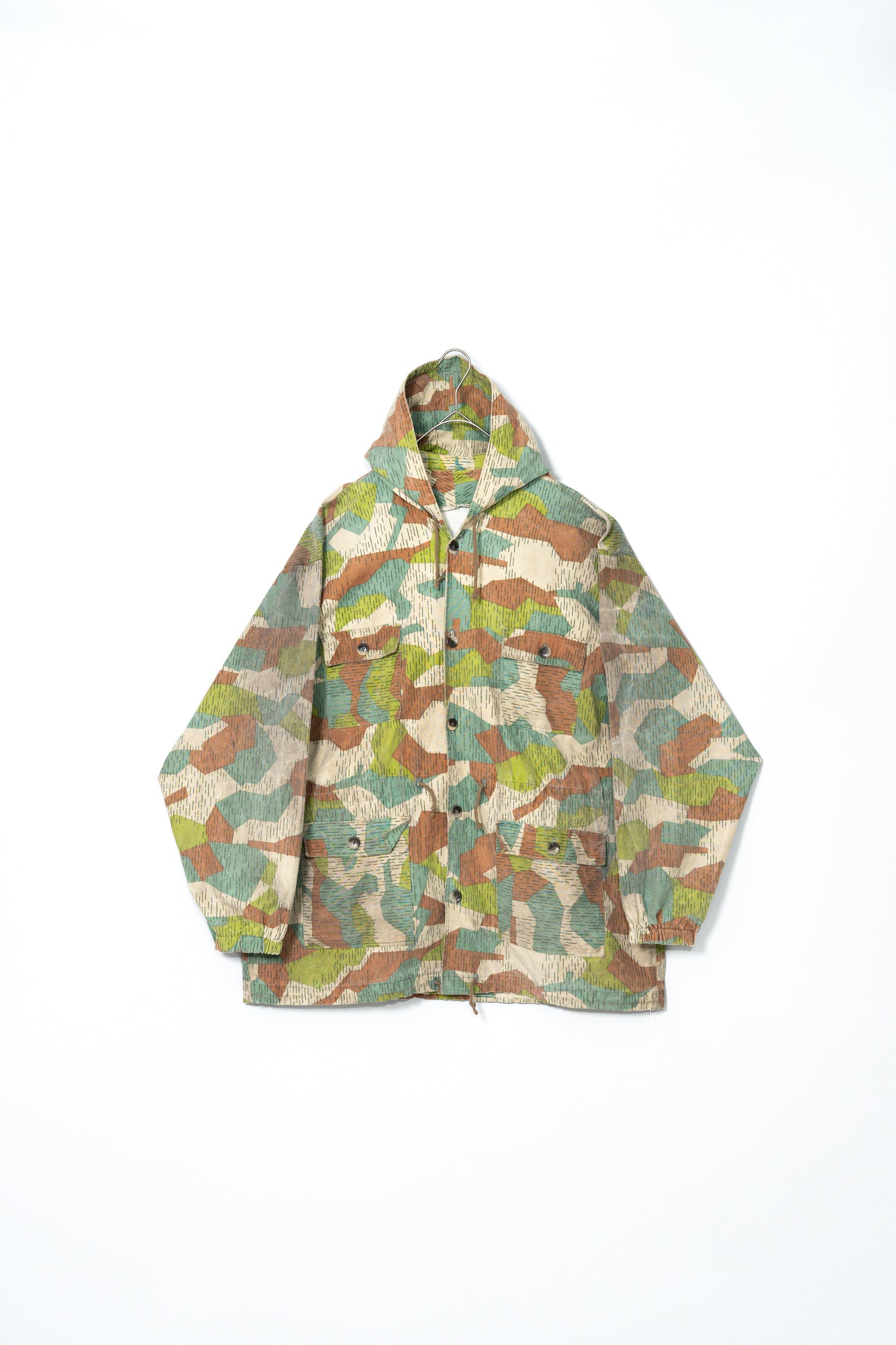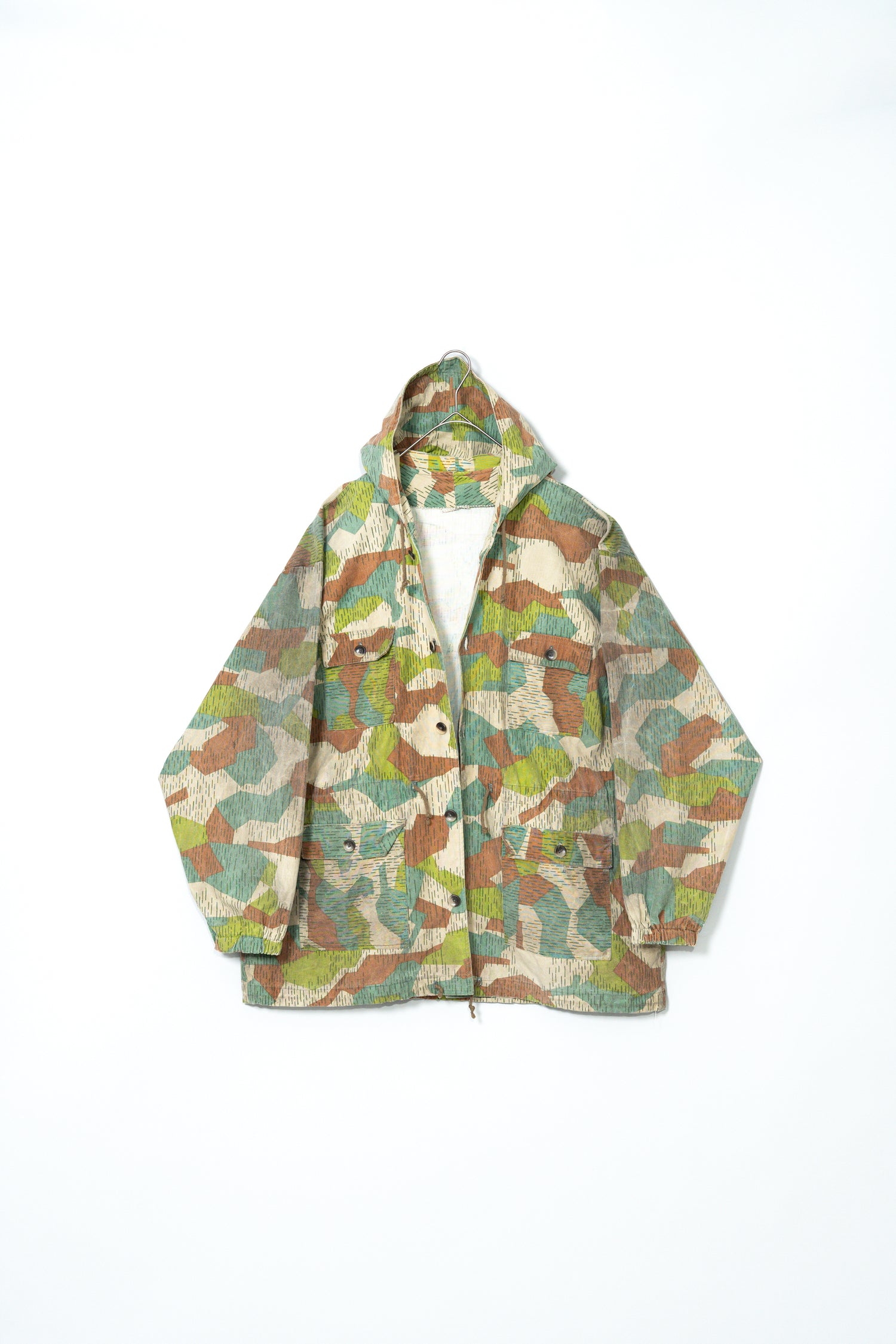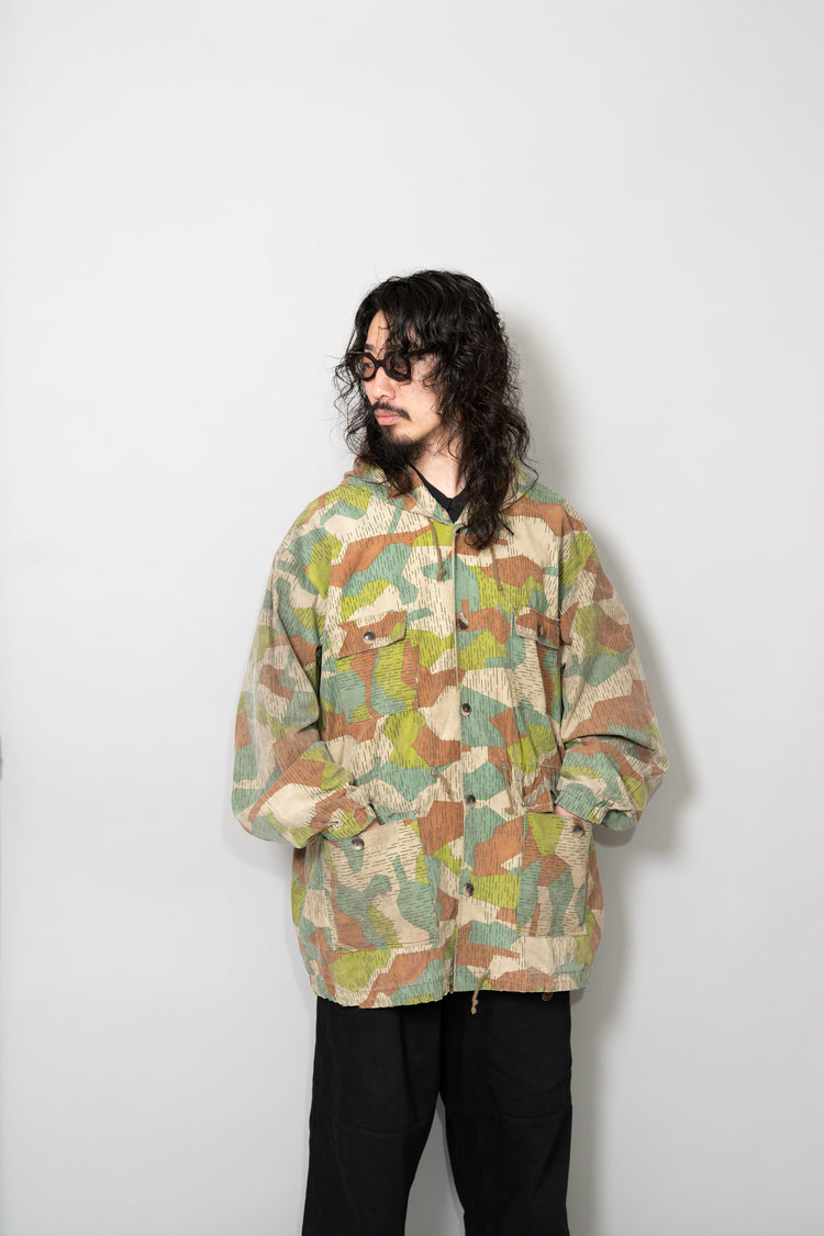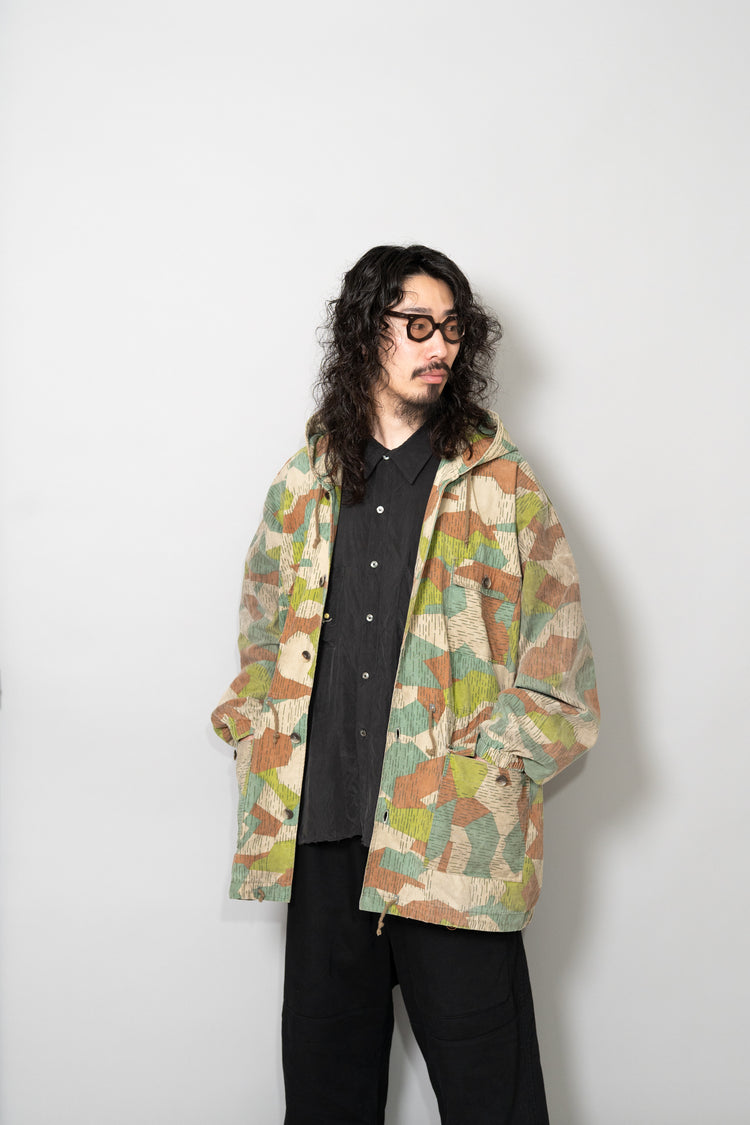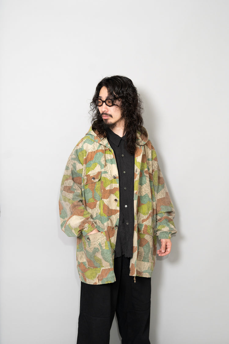 過去に同系統のモデルを見てきた方にとっても、ここまで大きなサイズ感、フーディー仕様、三箇所のドローコード、縦開きのボタンホール、背面の二重構造といった要素が揃った個体は非常に珍しく、コレクターズピースとしての価値も十分に備えています。ミリタリーウェアの文脈、70年代東欧という時代背景、そして現代ファッションとの親和性を一着で体現できる、極めて完成度の高いアーカイブピースです。オーバーサイズのミリタリーアウターを探していた方、他にはない迷彩パターンをスタイリングに取り入れたい方にとって、まさに「おあつらえ向き」と言える一着であり、ワードローブの中で長く主役として活躍してくれる存在になるはずです。