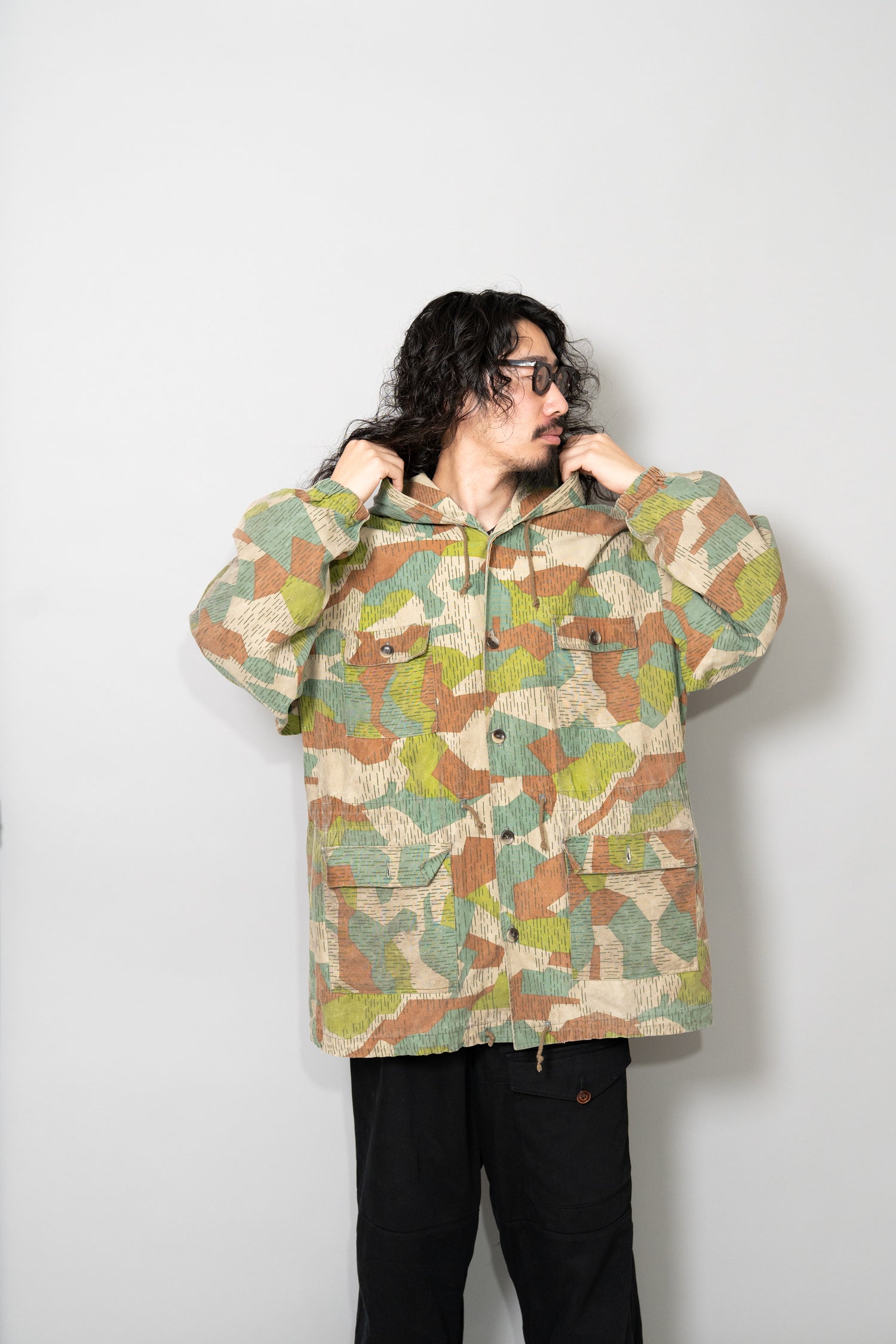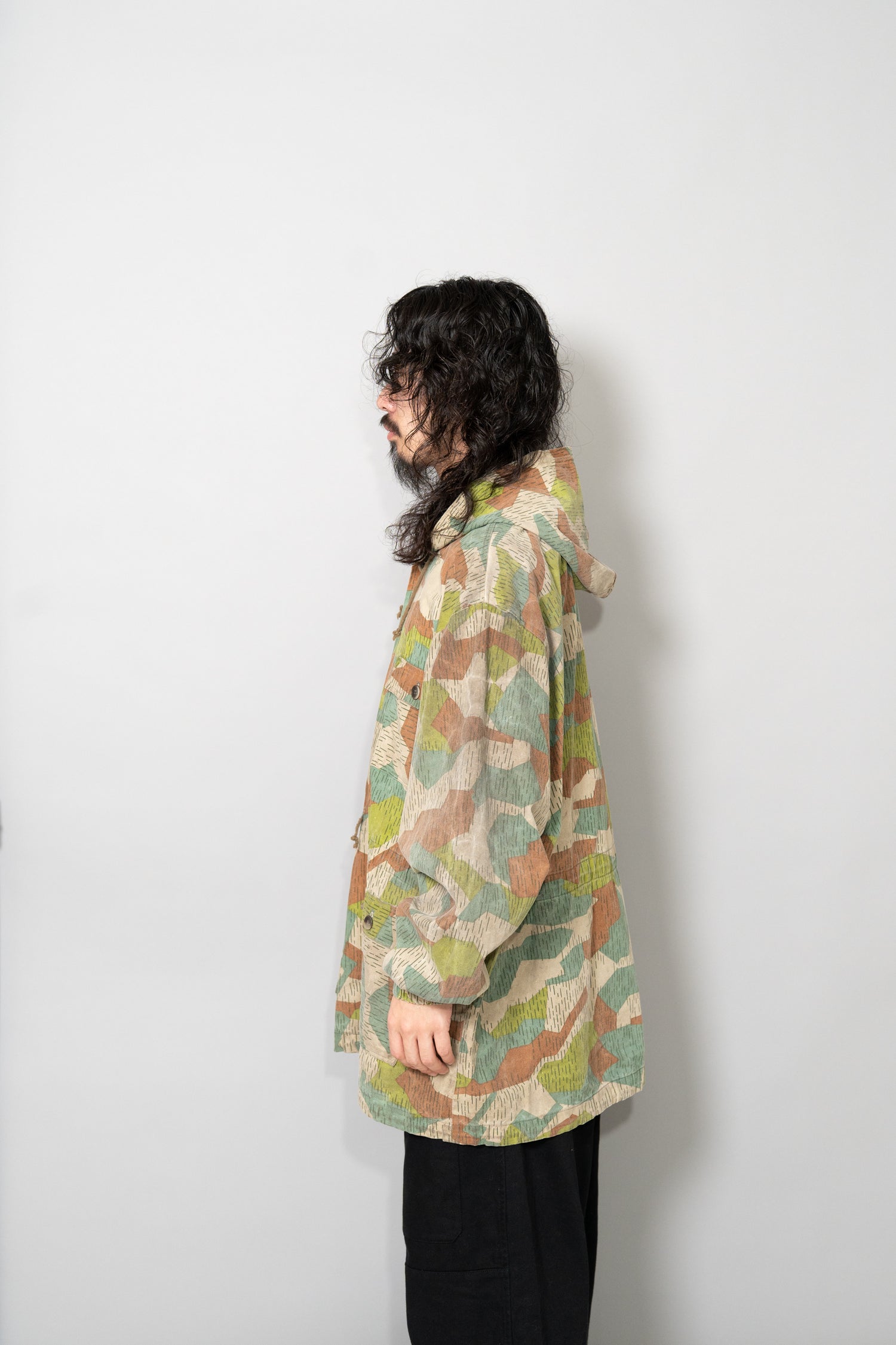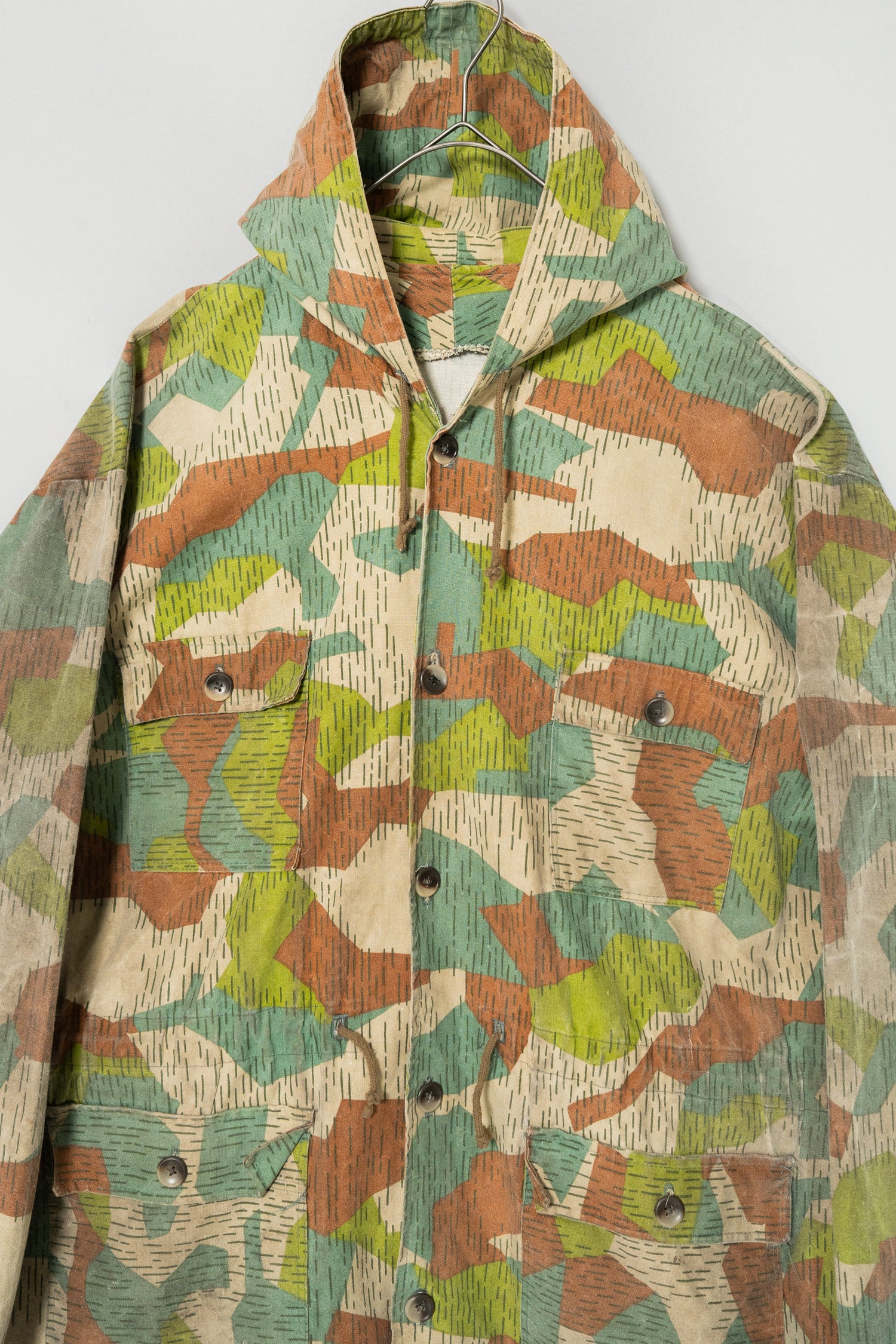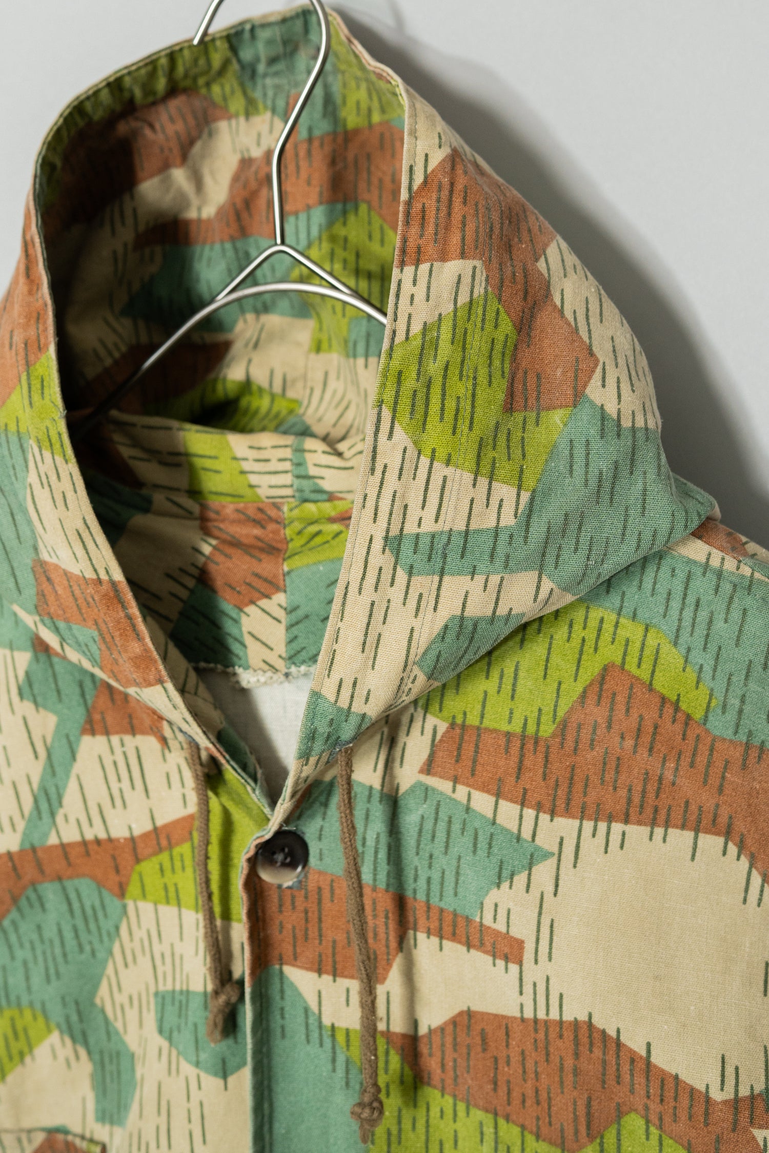 過去に同系統のモデルを見てきた方にとっても、ここまで大きなサイズ感、フーディー仕様、三箇所のドローコード、縦開きのボタンホール、背面の二重構造といった要素が揃った個体は非常に珍しく、コレクターズピースとしての価値も十分に備えています。ミリタリーウェアの文脈、70年代東欧という時代背景、そして現代ファッションとの親和性を一着で体現できる、極めて完成度の高いアーカイブピースです。オーバーサイズのミリタリーアウターを探していた方、他にはない迷彩パターンをスタイリングに取り入れたい方にとって、まさに「おあつらえ向き」と言える一着であり、ワードローブの中で長く主役として活躍してくれる存在になるはずです。
