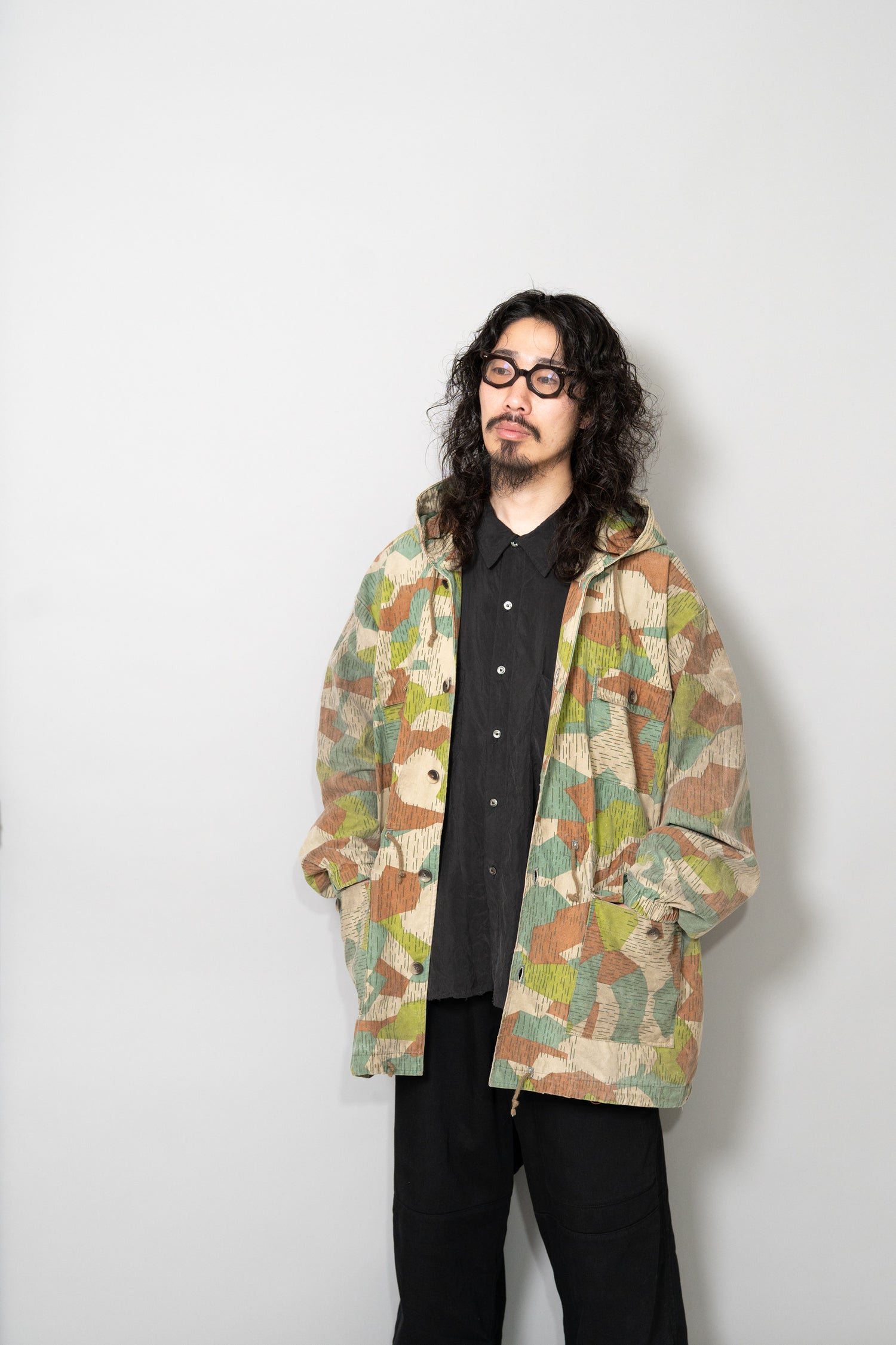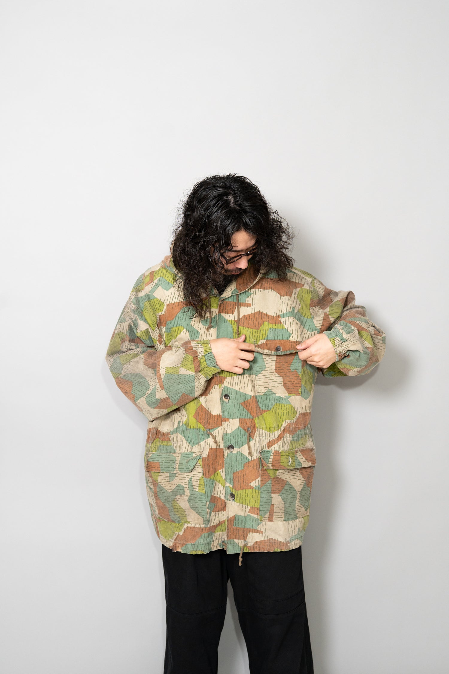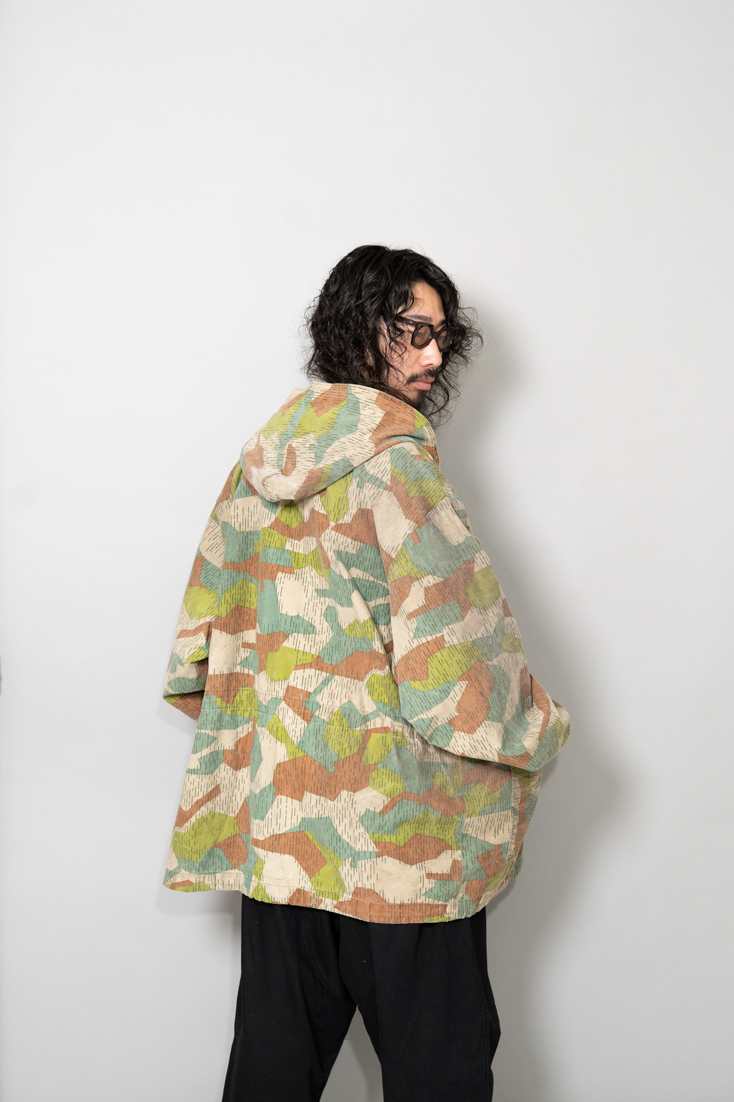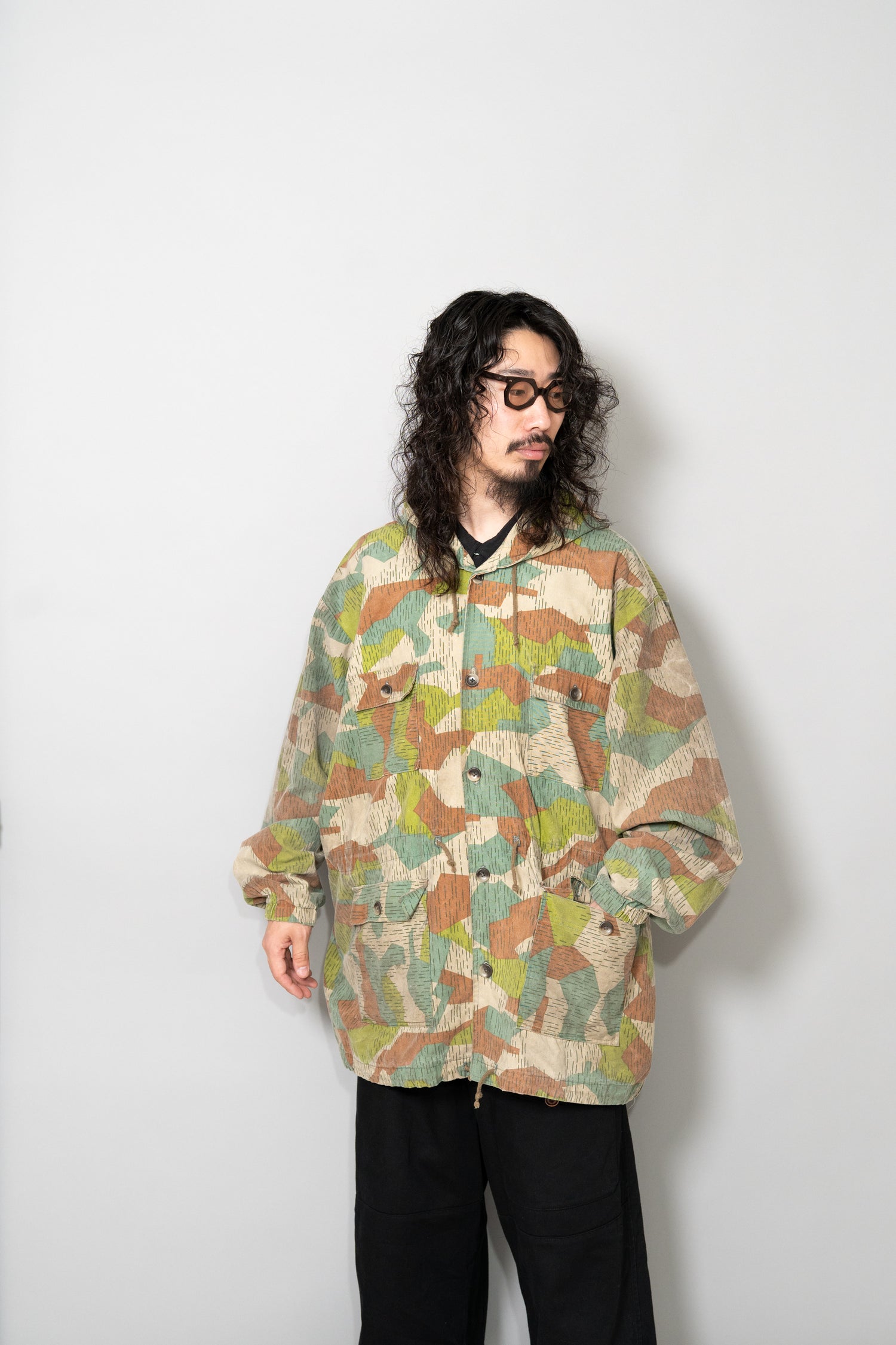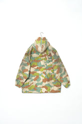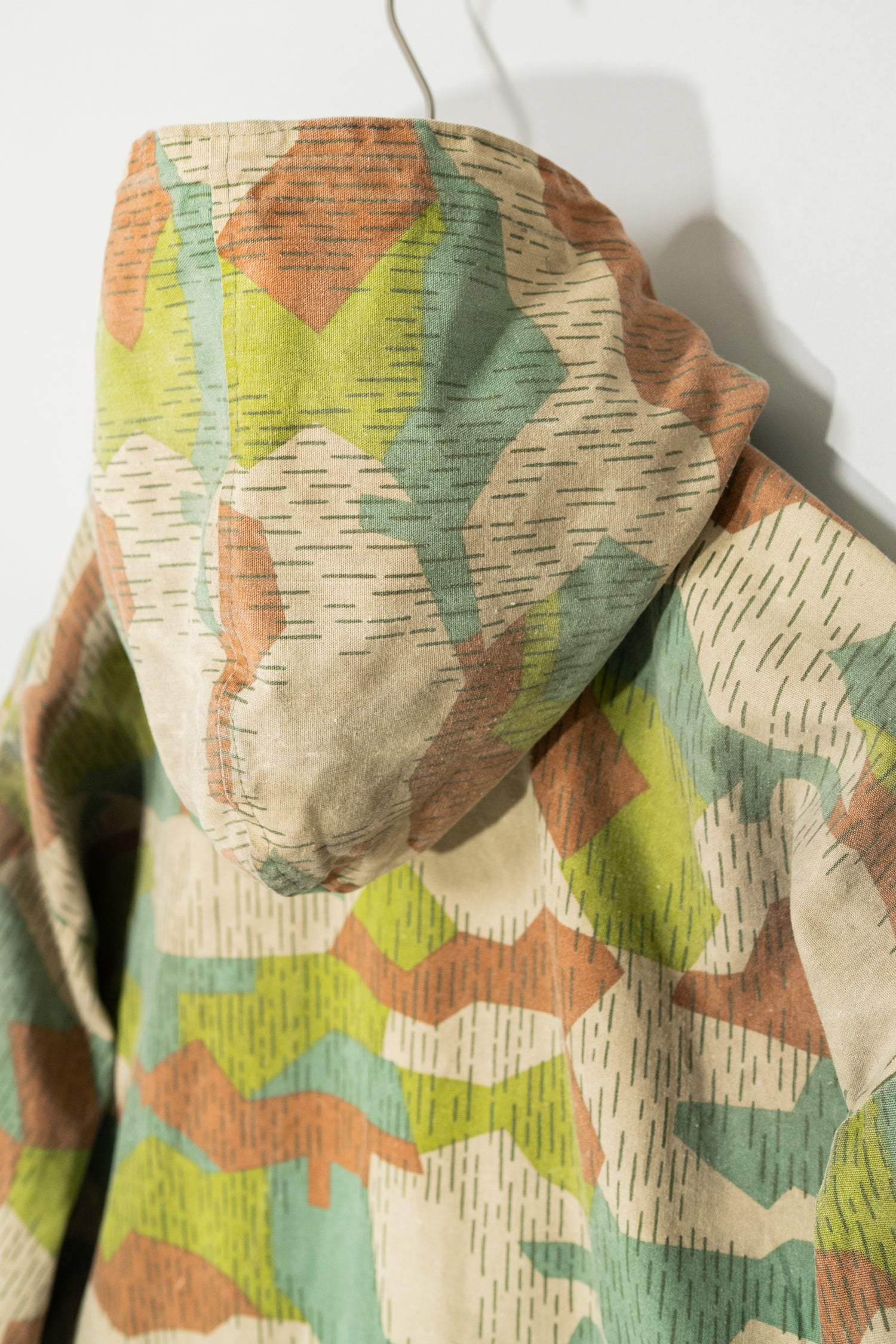 過去に同系統のモデルを見てきた方にとっても、ここまで大きなサイズ感、フーディー仕様、三箇所のドローコード、縦開きのボタンホール、背面の二重構造といった要素が揃った個体は非常に珍しく、コレクターズピースとしての価値も十分に備えています。ミリタリーウェアの文脈、70年代東欧という時代背景、そして現代ファッションとの親和性を一着で体現できる、極めて完成度の高いアーカイブピースです。オーバーサイズのミリタリーアウターを探していた方、他にはない迷彩パターンをスタイリングに取り入れたい方にとって、まさに「おあつらえ向き」と言える一着であり、ワードローブの中で長く主役として活躍してくれる存在になるはずです。