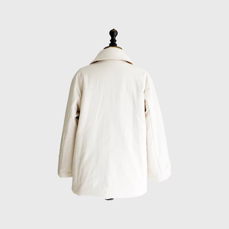 ツイルの生地に中綿を入れて製作したゆったりとした造りのパテッドPコート。深めのシングルの合わせ、襟はタブにより立てて着用することが可能。袖もタブ付きで絞ることができます。とても暖かく、ダウンほどカジュアルすぎない真冬に重宝する一着です。