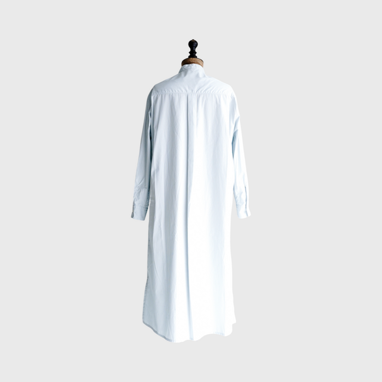 マイのストライプドシャツドレス。同ブランドでは定期的にリリースされる非常に人気の高い本作。今シーズンはストライプの生地で製作。前開きは胸元までで、裾にはサイドスリットが入っています。