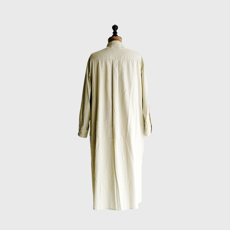 マイのツイルシャツドレス。同ブランドでは定期的にリリースされる非常に人気の高い本作。今シーズンは軽やかなツイルの生地で製作。前開きは胸元までで、裾にはサイドスリットが入っています。