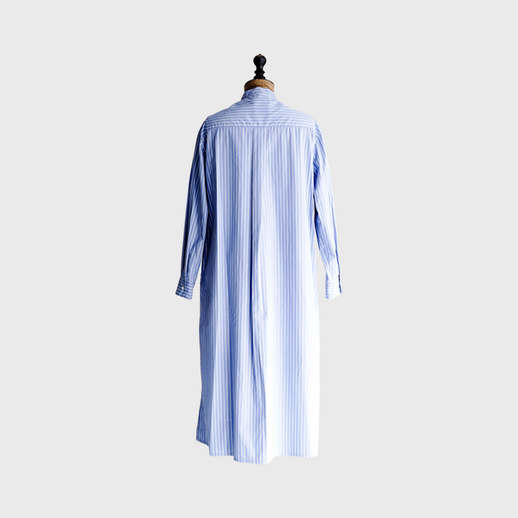 マイのストライプドシャツドレス。同ブランドでは定期的にリリースされる非常に人気の高い本作。今シーズンはストライプの生地で製作。前開きは胸元までで、裾にはサイドスリットが入っています。