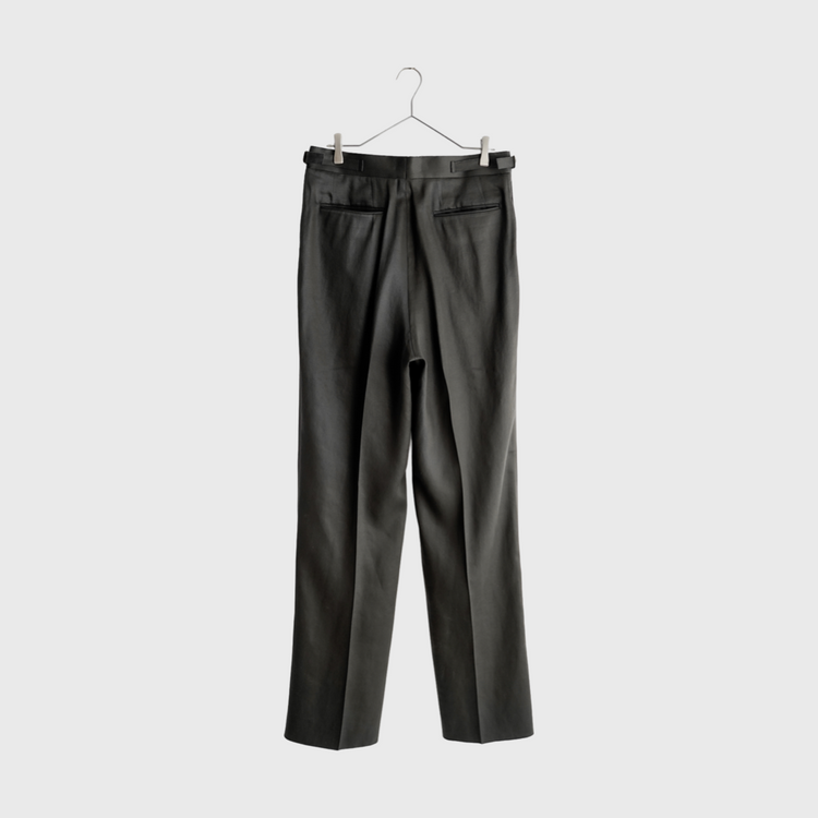 今作はリヨセルチノ(再生繊維)を使用。あえて打ち込みの弱い生地を使用し、さらにニドム加工を施すことでテロッとした質感を表現。見た目は綾目のあるベーシックなチノですが、光沢感とドレープ感が特徴的で、春夏の時期もサラッとした肌触りです。本格的なドレスパンツの洗練されたディテールは、スタイルを選ばずに幅広いシーンに活躍してくれるのではないでしょうか。ラフなトップスとさりげなく合わせたり、ラグジュアルーなスタイルを楽しんだりと万能な一本。上質さに拘ったスラックスをお探しの方はぜひこの機会に如何でしょうか。