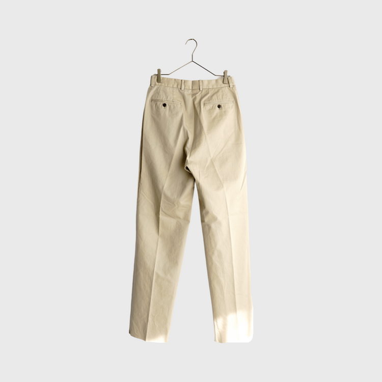 マテリアルは、アメリカンで普遍的なチノ素材を採用。特殊な洗い加工を施すことで抜け感のある味わい深い色味とくたっとした柔らかな生地感となり、スラックスのような綺麗なトラウザーながら程よくラフで力を抜いた印象に。ドレススタイルのハズシとしてやカジュアルの引き締め役としてなどスタイリングを問わず活躍してくれる一本