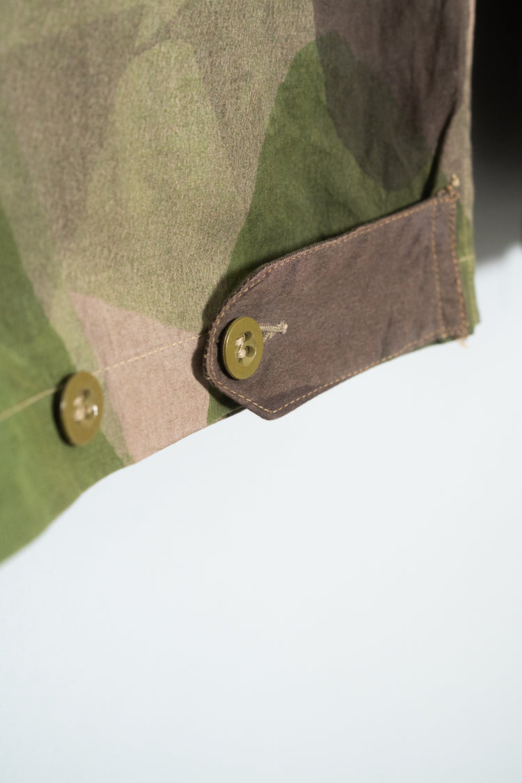 このシリーズを象徴する最大の特徴は、その独創的な「ブラッシュストロークカモフラージュ」です。筆で描いたような大胆かつ有機的なストロークを重ねることで、ヨーロッパ戦線の森や草地において兵士の姿を巧みに溶け込ませました。当時の多くの迷彩が幾何学的で規則的なパターンであったのに対し、この柄はまるで即興的な絵画のような自由さを備えており、視覚的な効果と芸術性を併せ持つ意匠として、後の英国軍カモフラージュの基礎を築いたともいえる存在です。