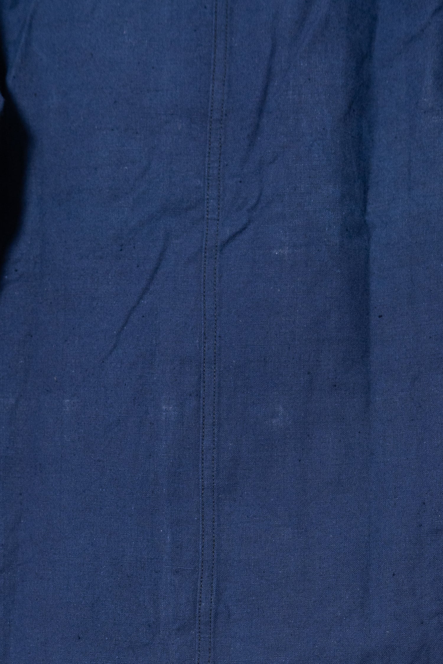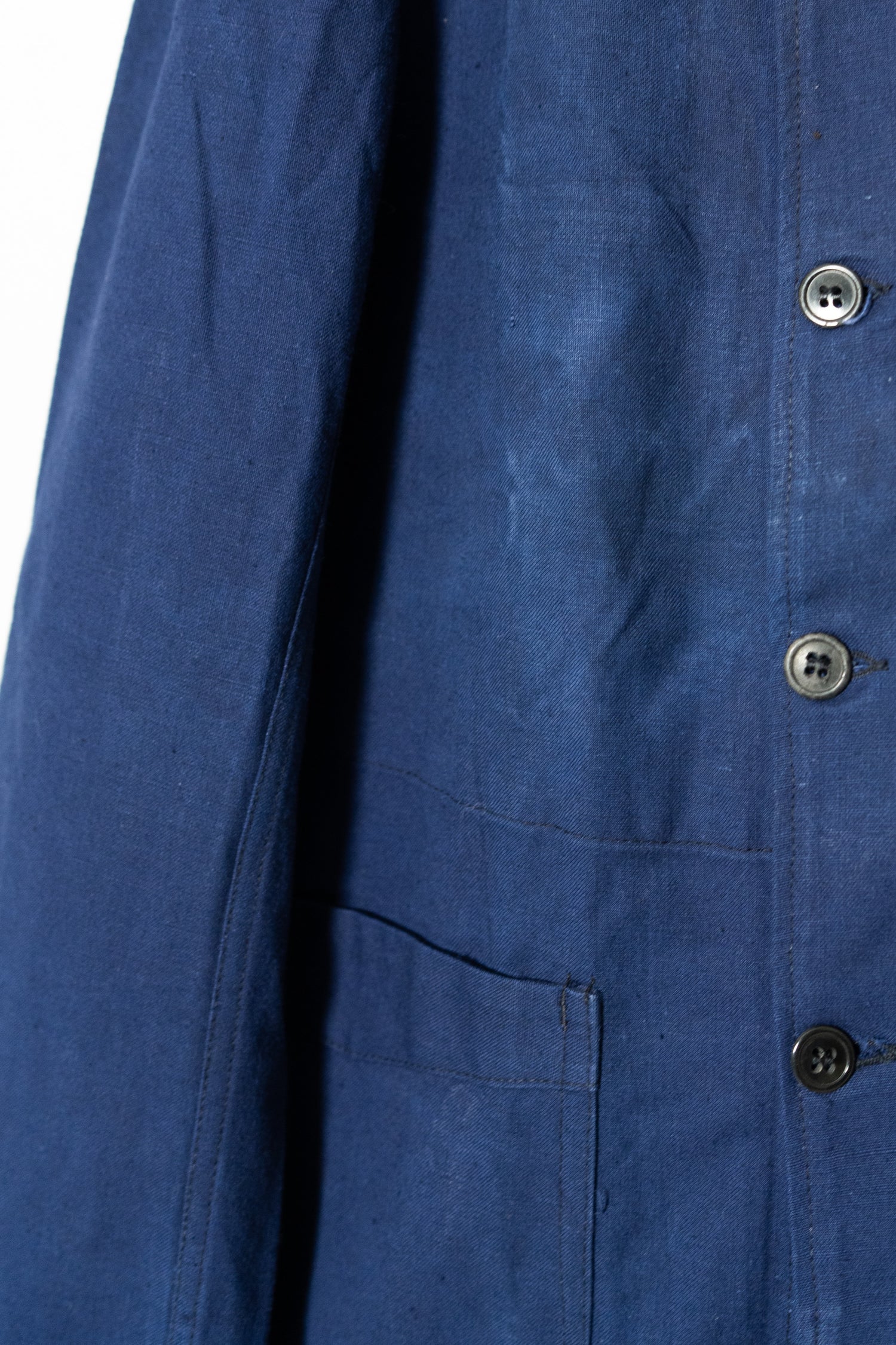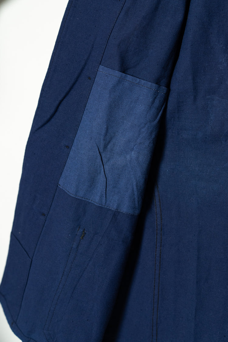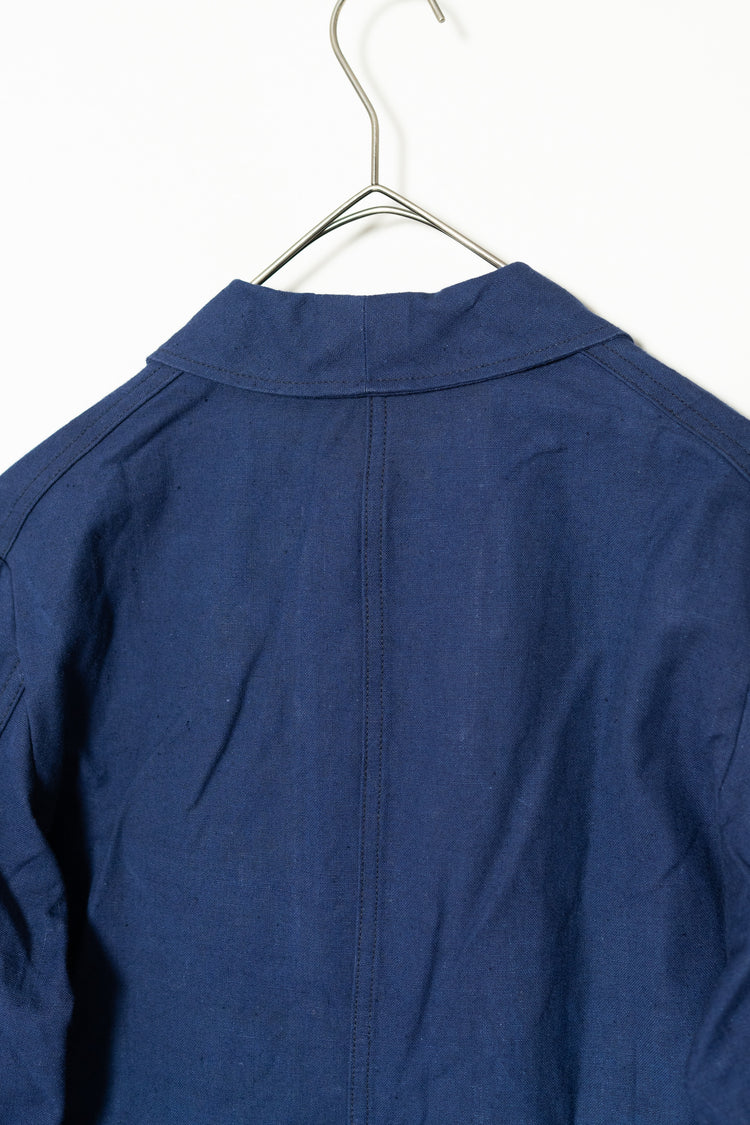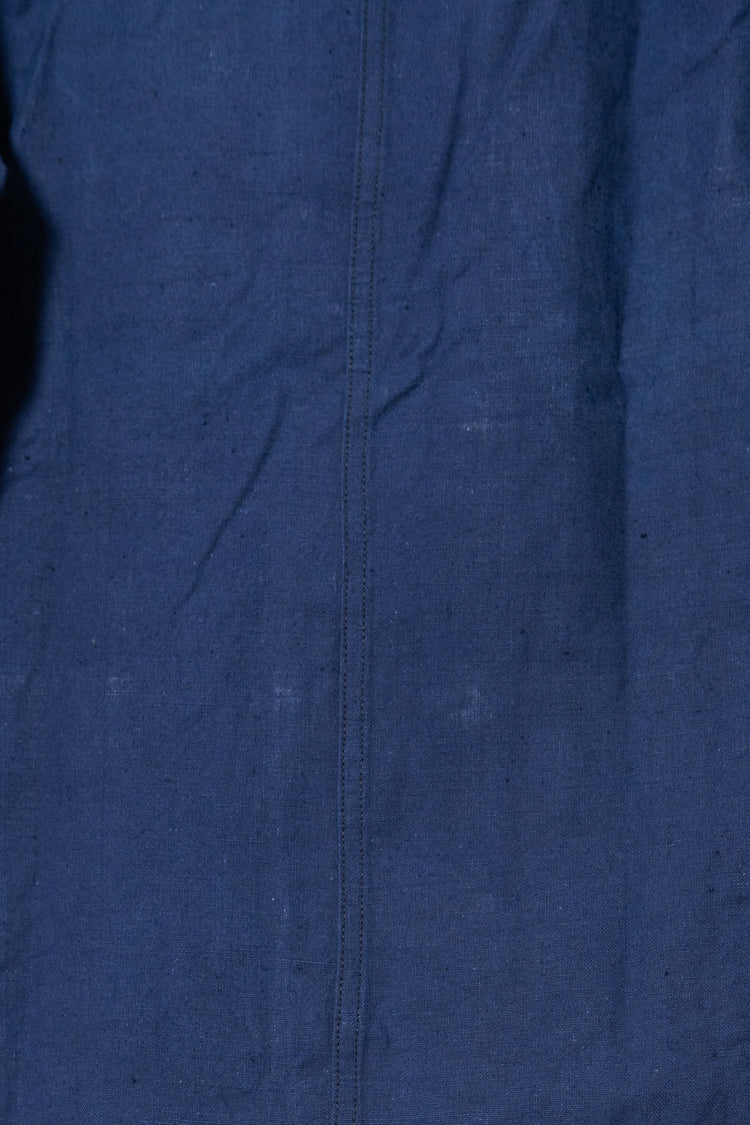 リネンの強靭さと通気性、コットンの柔らかさと馴染みの良さを兼ね備えたこの素材は、当時のワークウェアやユニフォームに多く採用されていました。特に本品のようにインディゴ染めを施したタイプは、経年変化が美しく、時とともに深みを増す独特の青が魅力です。現在の視点から見れば、この「リネンコットンのインディゴ混紡」は、サステナブル素材の先駆けとも言えるもの。耐久性と機能性、そして審美性を高い次元で両立させた、当時のフランスの職人技の結晶です。